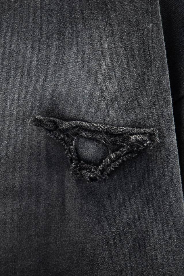 . Sandblasted distressing adds to the garment's appeal and creates a unique visual effect.