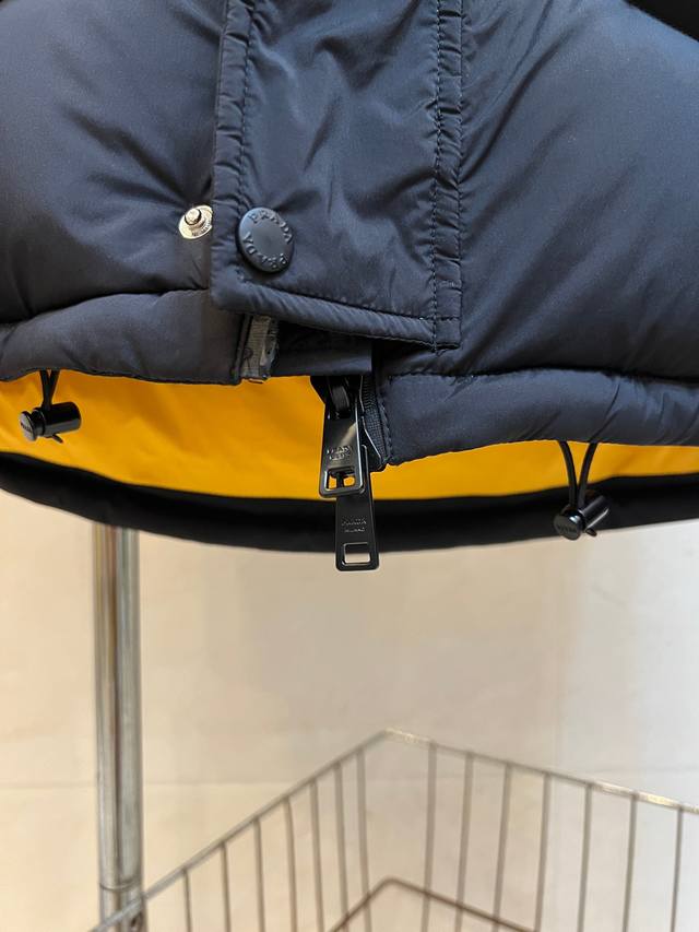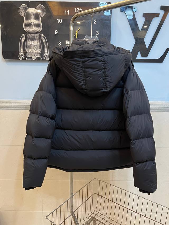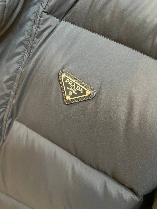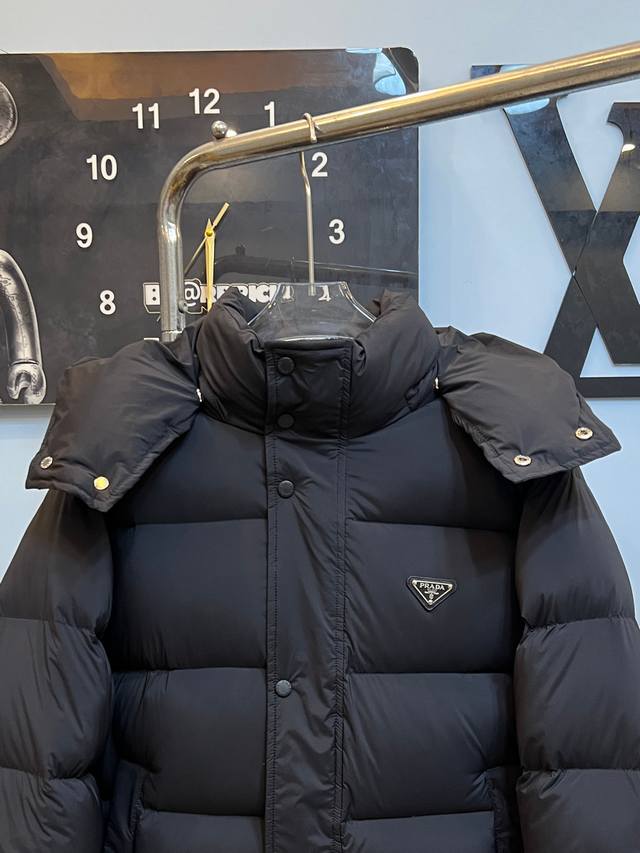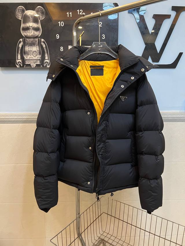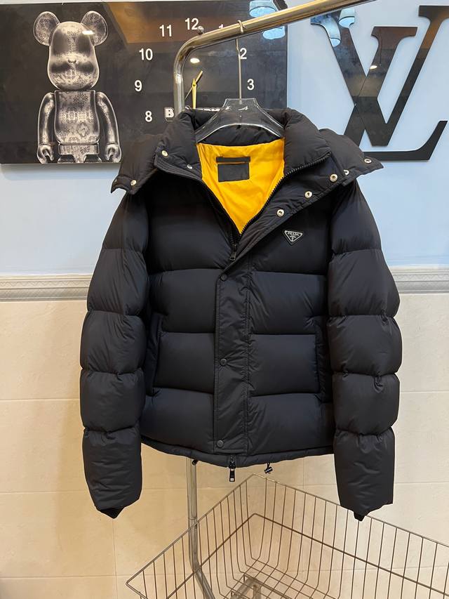 Prada Autumn/Winter New Hooded Down Jacket with High Neck Design. Warm 90% White Goose Down Filling. High-end warmth design with evenly distributed down filling. Features a black label main body design that is both unique and understated, highlighting the brand while maintaining aesthetic appeal. Original custom-made fabric with super high density and identical feel to the original. The contrasting lining fabric undergoes color matching and repeated testing to ensure no down escapes. It won't look bulky, keeping you warm throughout the cold winter. High-quality version, easily compareable. All three labels are complete. Color: Black. Sizes: 48, 50, 52, 54, 56.