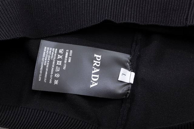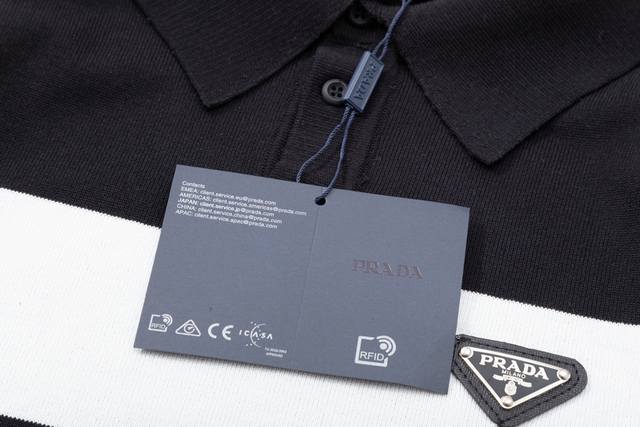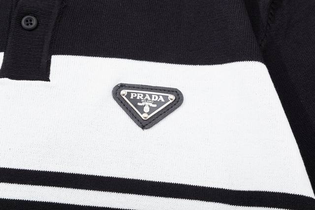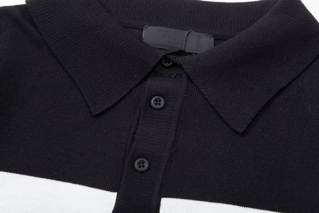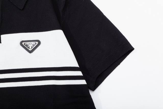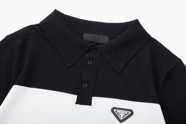 Prada color-blocked metallic triangle logo knit polo shirt (upgraded), inspired by 80s retro style. Original fabric, same style as the official polo shirt. Custom mesh sweater knit fabric, very comfortable to the touch. New spring/summer style, fashionable and unique, super versatile and good-looking. Suitable for both men and women, a must-have. All tags, collar labels, and washing labels are complete. Color: Black. Sizes: M-3XL.
