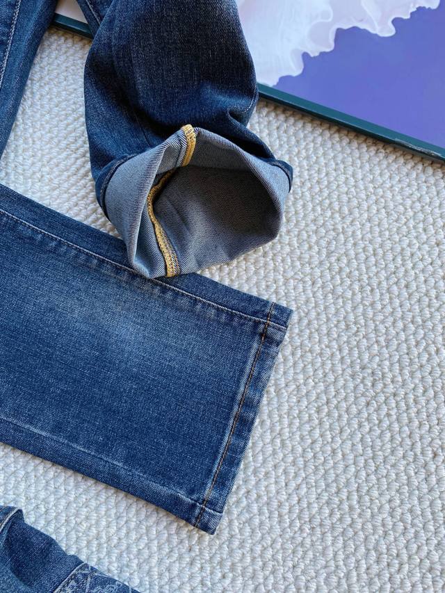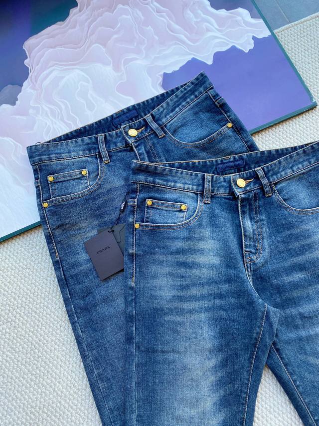 Prada men's autumn/winter business thickened jeans, featuring a 3D-cut straight-leg fit, custom-made stretch fabric, original hardware, silky-smooth YKK zippers, and a metal leather patch. Perfect for casual or commuting, these jeans instantly add class. These high-end jeans feature a classic 3D-cut, European-style business casual silhouette. They're comfortable and snug against the skin, and the fabric feels soft, making them a far superior choice compared to standard cotton khaki. They also offer excellent hold and wrinkle resistance! The ultra-soft genuine leather patch and back pocket branding create a truly authentic look.