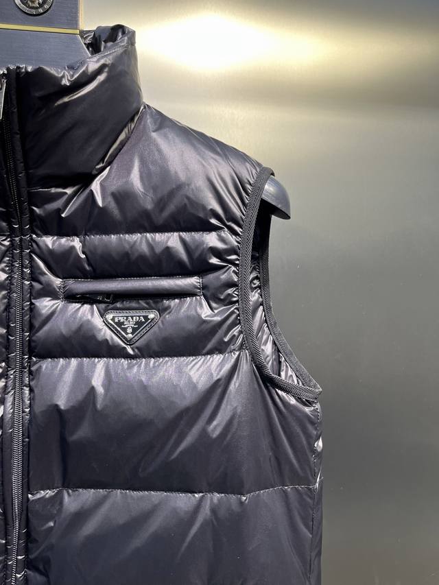 ). A premium item from Taiwan Ebi Trading Co., Ltd., available in black and blue. A versatile down vest, a wardrobe essential with a high versatility, this vest is a must-have for creating stylish looks in autumn and winter. It perfectly embodies Prada's aesthetic, featuring the iconic triangle logo for high recognizability. The stand-up collar design is visually appealing, exuding a fashionable and modern vibe! The minimalist design offers a unique visual experience! Filled with top-quality white goose down, the down is full and fluffy, providing excellent warmth. The outer layer is made of imported Japanese functional waterproof material, showcasing the brand's craftsmanship. It can be layered with shirts, sweaters, etc., creating different styles. It avoids the bulkiness and restriction of traditional down jackets, suitable for both men and women, allowing you to create a unique look! (