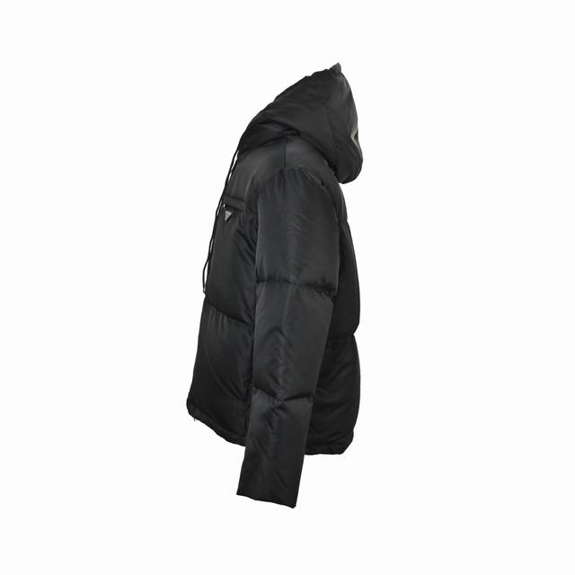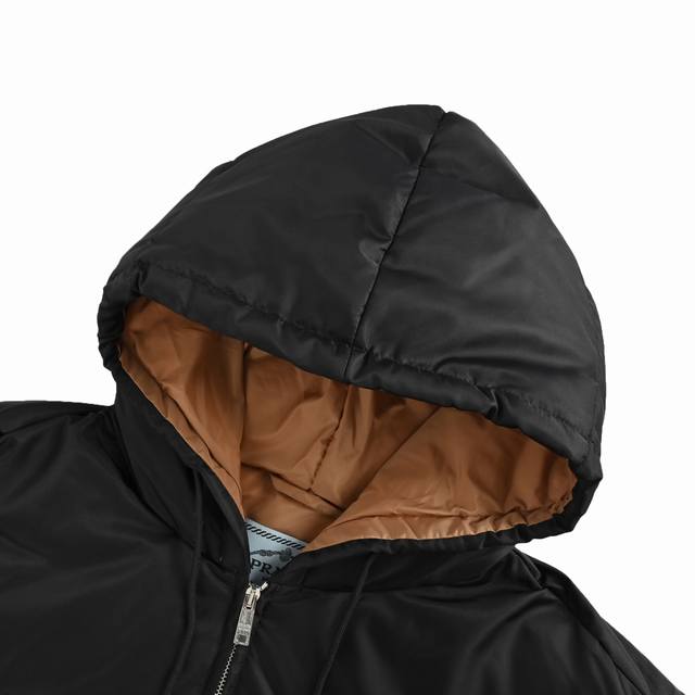 Prada Nylon Zipper Color-Blocked Hooded Down Jacket (DDD) Made from 100% recycled nylon fabric, this jacket utilizes advanced textile technology to create a tightly woven and durable material. This enhances the skeletal strength, effectively blocking cold winds and trapping warm air from the down layer. The tight weaving process and special treatment give it waterproof and windproof properties, creating a lotus leaf effect on the surface. It is also wrinkle-resistant, deformation-resistant, and easy to care for. The outer layer features a recycled nylon windproof brim in the same color as the jacket body, while the inner lining is made of caramel brown nylon fabric. When folded, the contrasting colors create a striking effect, reminiscent of molten gold from a sunset in the deep night sky. The brim has an adjustable drawstring for precise control of the hood's shape, balancing warmth and style. The quilted stitches are machine-made with computer-controlled stitching, ensuring consistent down size and even distribution. The stitch spacing error is no more than 0.1mm, eliminating the risk of down leakage. DDD uses 90% white duck down with a fill power of 650Fp, ensuring excellent warmth. The down undergoes rigorous selection and processing to prevent down leakage. DDD Size: S-XL