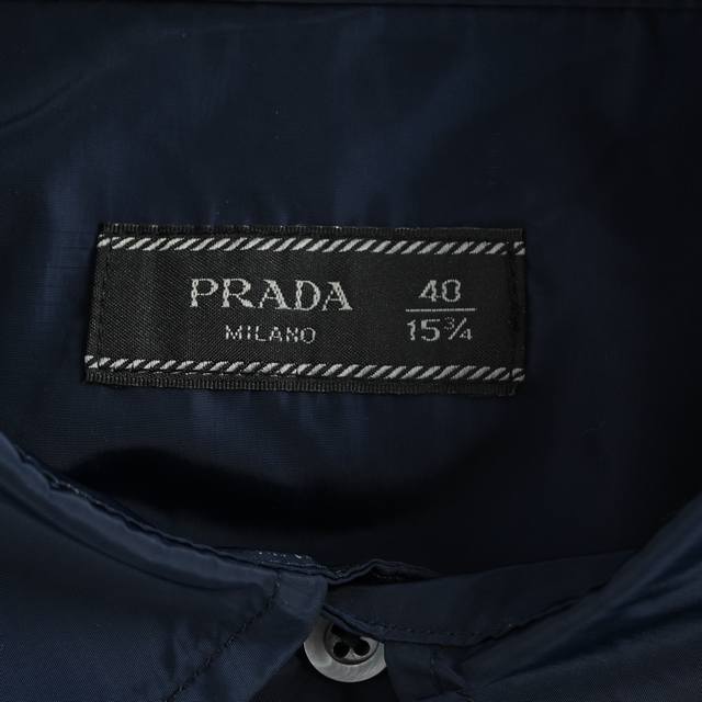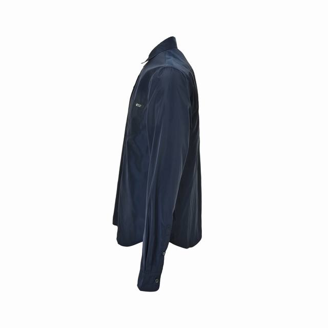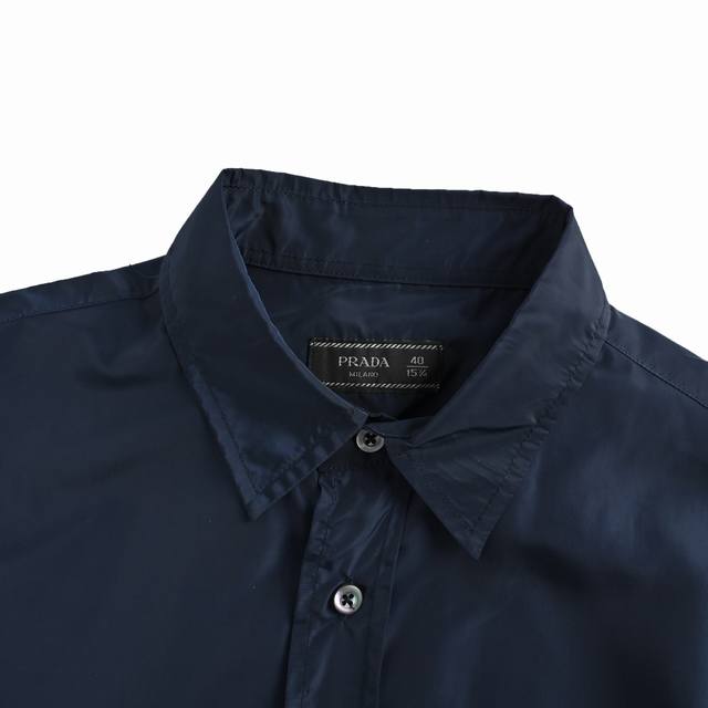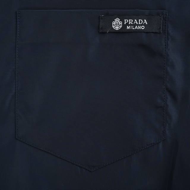Prada pocket tag back triangle logo shirt. Made of custom-dyed recycled nylon, smooth to the touch. Features a chest patch pocket and a fabric triangle logo on the back, highlighting the brand's identity. The fabric is made of silky double-yarn interwoven with a nano-embossed honeycomb texture. A high-temperature, high-pressure process creates a micro-matte film with covalent fluorine bonds, making it stain- and waterproof. Includes a complete 1:1 custom-made Prada shell button, logo, and trademark. Size: 39-42.