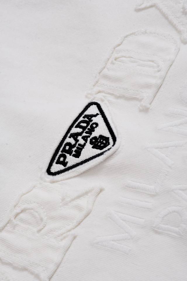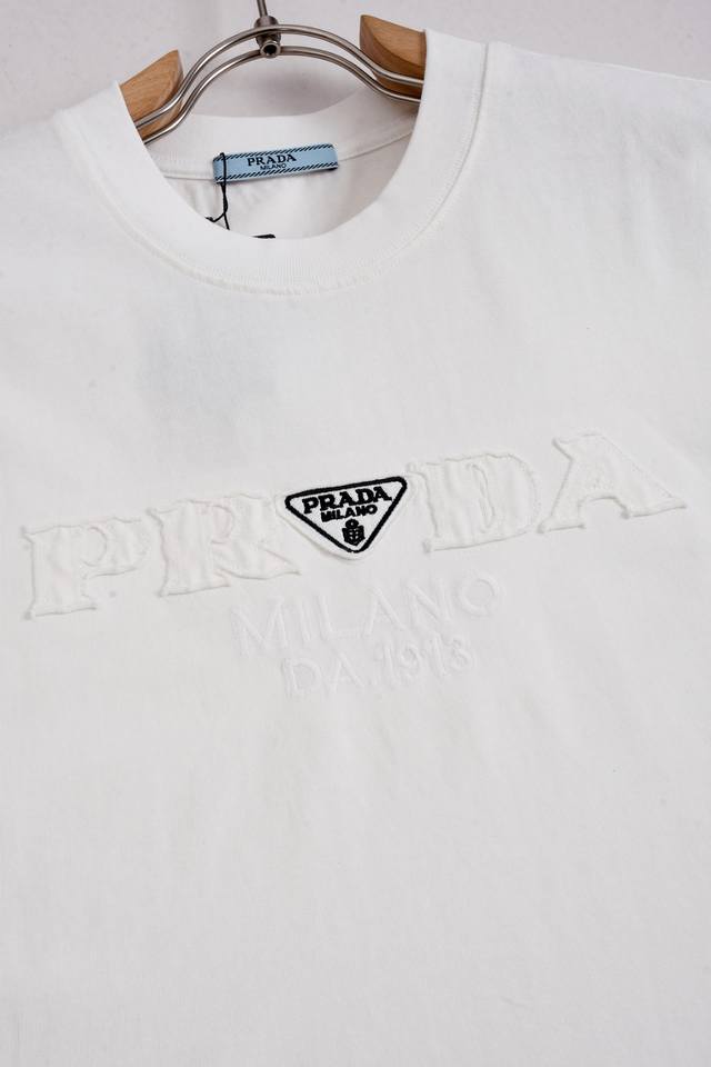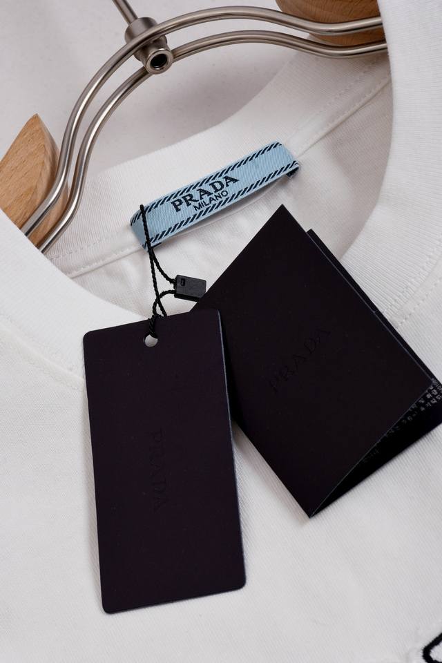 Prada, Prada Triangle Logo High Version, Slightly Wide Fit, Sizes S-XL, Ddd. Prada 26Ss Spring/Summer Hot Selling New Arrival: Short-Sleeve T-Shirt with 3D Embroidered Triangle Logo and Letter Totem on the Chest. This T-shirt combines sporty minimalist design with exquisite details. It features imported exclusive fabric, and the Prada enamel triangular metal logo on the chest exudes historical heritage, further enhancing the brand's prestige. The minimalist design style showcases elegance to the fullest! The simple and versatile black and white solid color design, with the same metal triangle logo for both men and women, is casual and can meet all your dressing requirements, suitable for both genders and body types! Made with imported materials, it has an extremely smooth and lightweight feel like silky cotton, making it incredibly comfortable and skin-friendly to wear. A basic, versatile, casual, and loose fit suitable for all seasons, with a basic knitted ribbed spliced crew neck design, the style is simple, elegant, and durable for both men and women! All tags included. Colors: Black, White. Sizes: S-XL. Size Chart: S: Shoulder width 50cm, Chest 56cm, Length 70cm; M: Shoulder width 52cm, Chest 57cm, Length 72cm; L: Shoulder width 54cm, Chest 59cm, Length 74cm; XL: Shoulder width 56cm, Chest 62cm, Length 76cm.