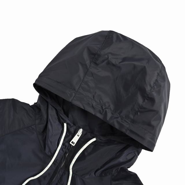uses the brand's iconic recycled nylon fabric, which has the same performance as traditional nylon, with high strength, tear resistance, wear resistance and other characteristics. It is lightweight and waterproof, suitable for multiple scenarios. The wrinkle-resistant and quick-drying characteristics also make it easy for daily care and maintenance. The unlined single-layer structure relies on the high-density weaving characteristics of recycled nylon to make it breathable and protective. The hood and collar are seamlessly connected to fit the neck line, taking into account both windproof function and capable temperament. The two sides are equipped with extra-large side pockets, and the zipper closure enhances practicality. Customized accessories