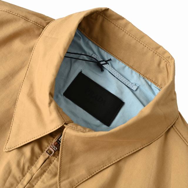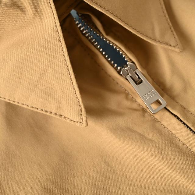 . Made from high-count long-staple cotton canvas twill fabric, the texture is delicate yet structured. A special finishing process gives the fabric wrinkle resistance and deformation recovery, maintaining a clean silhouette even after prolonged sitting. Inspired by classic military colors, it remains timeless. It's a versatile color for both business and casual occasions, and a benchmark for retro style, easily bridging the gap between office and casual social settings. Incorporating Italian minimalist design philosophy, the lines are clean and crisp. Details such as the iconic triangular logo enamel buttons and unique collar or cuff designs subtly highlight the brand identity, understated yet extraordinary. High-quality custom zippers are selected, smooth and durable. Details such as the zipper pulls may be adorned with brand logos, revealing true quality in the details. Zippers offer a more modern and convenient opening and closing than buttons, while also injecting a touch of functionality into the overall minimalist design. Unisex