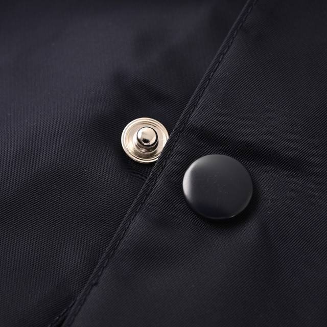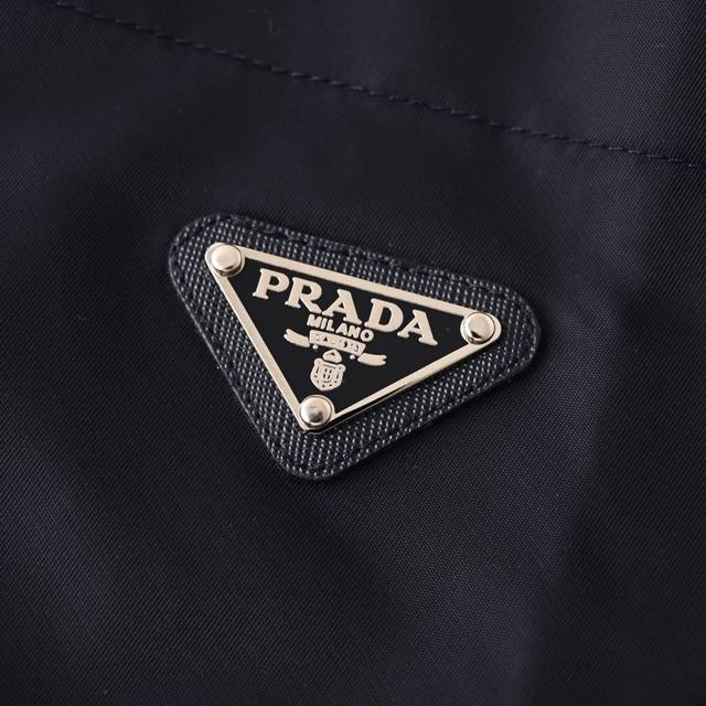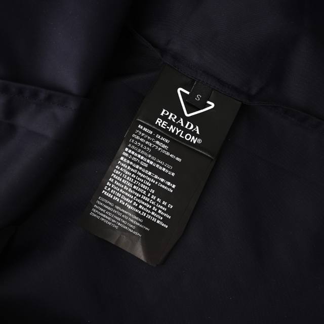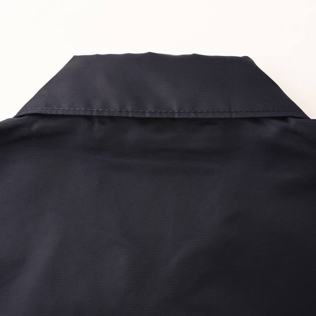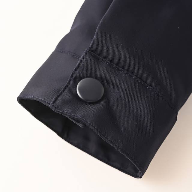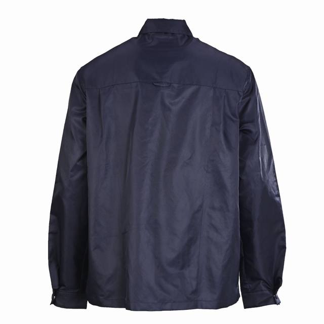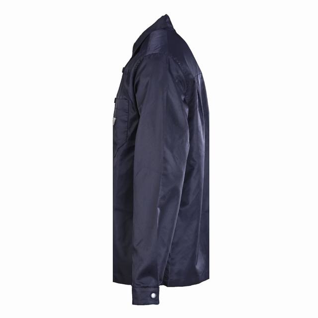 . This navy blue shirt is crafted from recycled ocean plastic waste using a special recycled nylon yarn. The shirt collar and long sleeves with snap-button cuffs create a minimalist design that defines a modern feel. The relaxed fit features an enameled triangular metal logo on the front, adding a distinct brand identity.