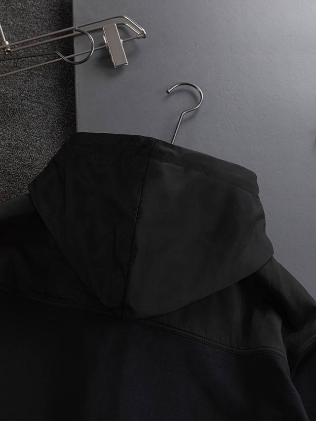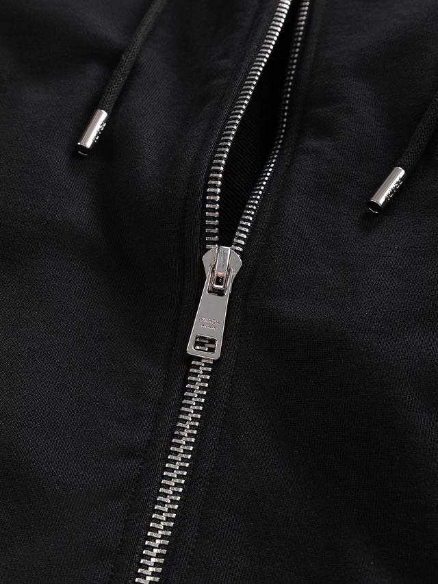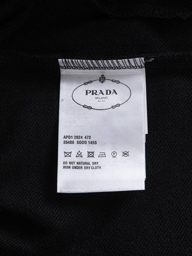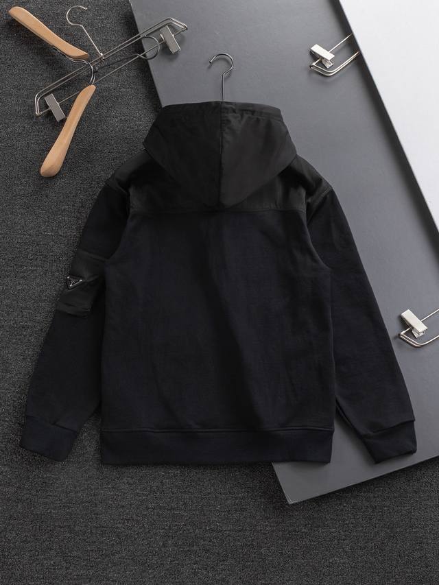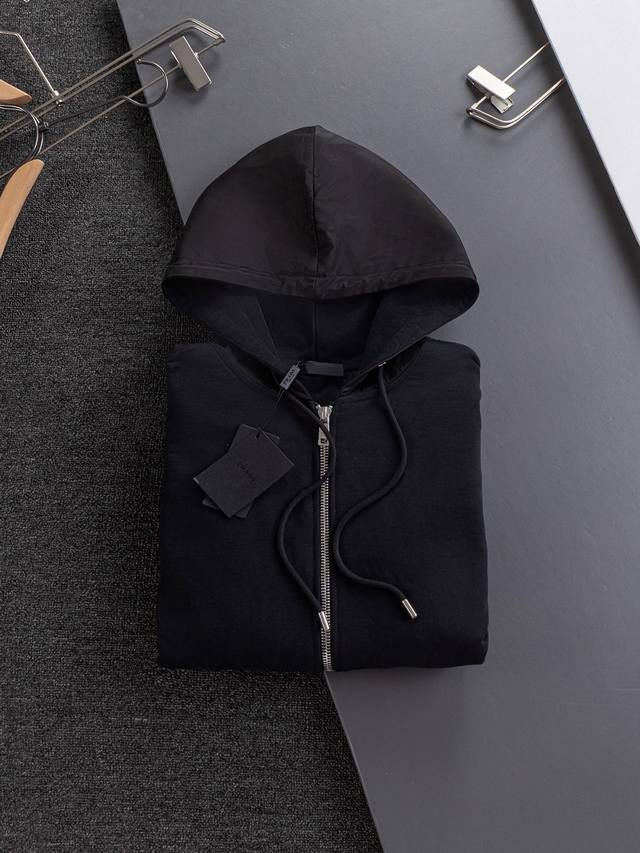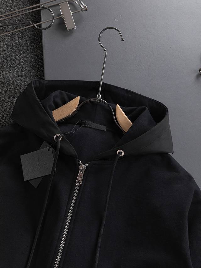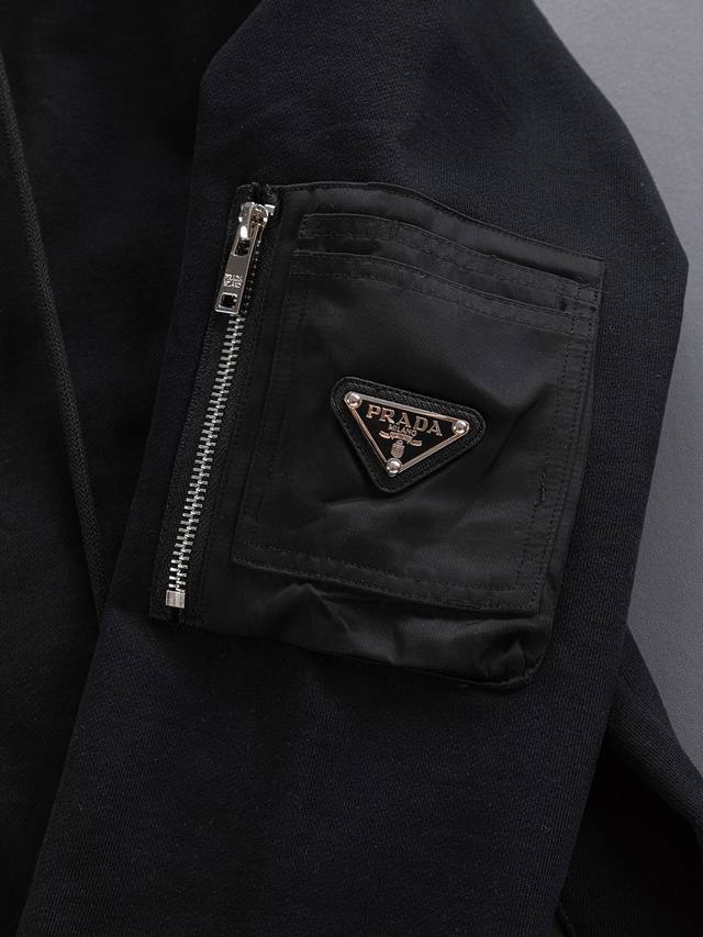 Prada Triangle Logo High-Rise Version S-XL Ddd 25Ss Autumn/Winter Hooded Jacket Hot Selling New Arrival, Synchronized with Boutique, Woven Double Pocket Sleeves Zipper Pockets, Triangle Logo Embroidered Hooded Jacket/Sweatshirt. This jacket combines sporty minimalist design with exquisite details. It features imported exclusive fabric, and the Prada enamel triangle metal logo on the chest exudes historical heritage, further enhancing the brand's prestige. The minimalist design style showcases elegance to the fullest! The simple and versatile black and white solid color design, with the same metal triangle logo for both men and women, is casual and can meet all your dressing requirements, suitable for both genders and body types! Made with imported materials, it has an extremely smooth and lightweight feel like silky cotton, making it very comfortable and skin-friendly to wear. A basic, versatile, casual, and loose fit suitable for all seasons, with a basic knitted ribbed spliced crew neck design, the style is simple, elegant, and durable for both men and women! All three labels are complete. Color: Black. Sizes: S-XL. Size Chart: S: Shoulder width 50cm - Chest 54cm - Length 70cm; M: Shoulder width 52cm - Chest 56.5cm - Length 72cm; L: Shoulder width 54cm - Chest 59cm - Length 74cm; XL: Shoulder width 56cm - Chest 61.5cm - Length 76cm.