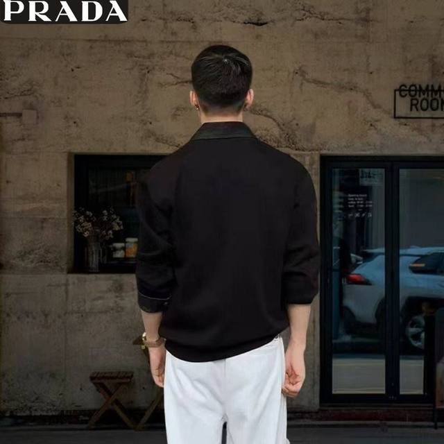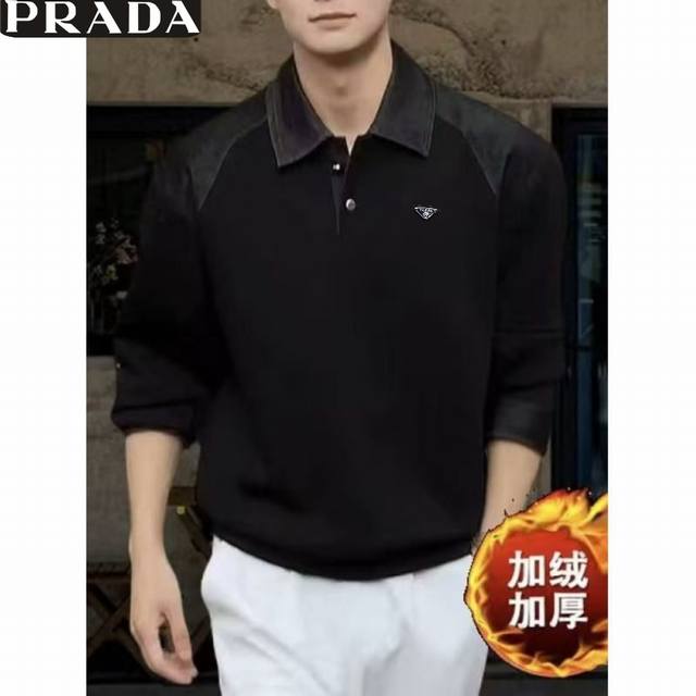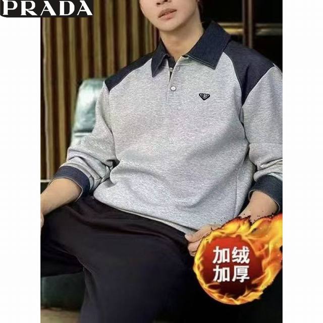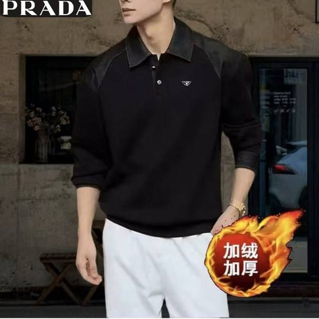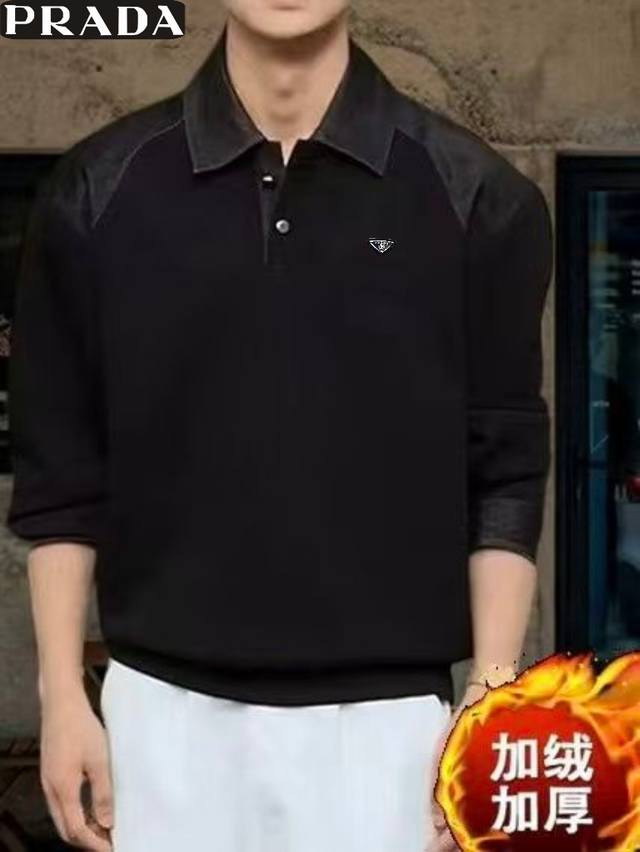 Prada Winter New Arrival, Unisex Color Block Stitching Premium Fleece Lined Thick Old Money Style High-Count Cotton Blend Denim Patchwork Lapel Casual Sweatshirt, Men's Thick Base Layer Top! Colors: Black, Gray Sizes: M-3XL