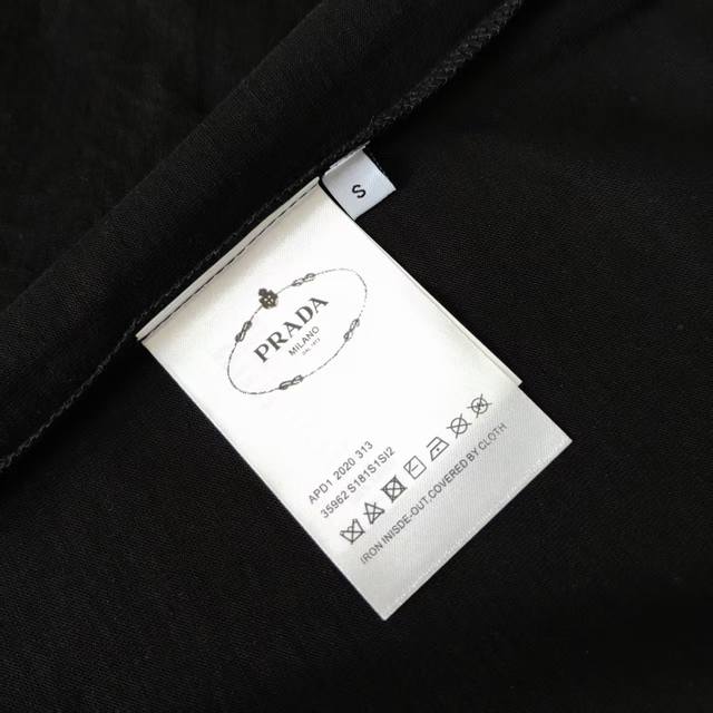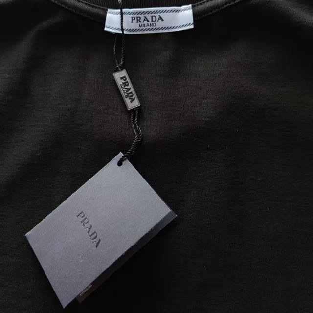 Real shot details + details DDD Prada large color-blocked letter triangle logo hot-fix rhinestone DDD Original fabric official same style short-sleeved T-shirt DDD Custom 300g very comfortable feel DDD Newest spring/summer, synchronized with brick stores, fashionable and unique, super versatile DDD Suitable for both men and women, a must-have DDD Colors: White, Black Kq27 DDD Sizes : SML XL DDD