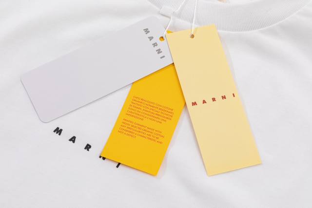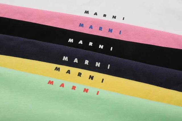 1169 Marni Spring new cotton logo print short-sleeved T-shirt. Original purchased accessories. Fully customized fabrics. The pattern is consistent with the official website. The details are as follows. Colors: black, white, pink, mint green, royal blue, yellow. Sizes: 38, 40, 42, 44