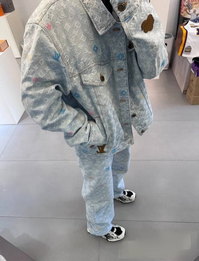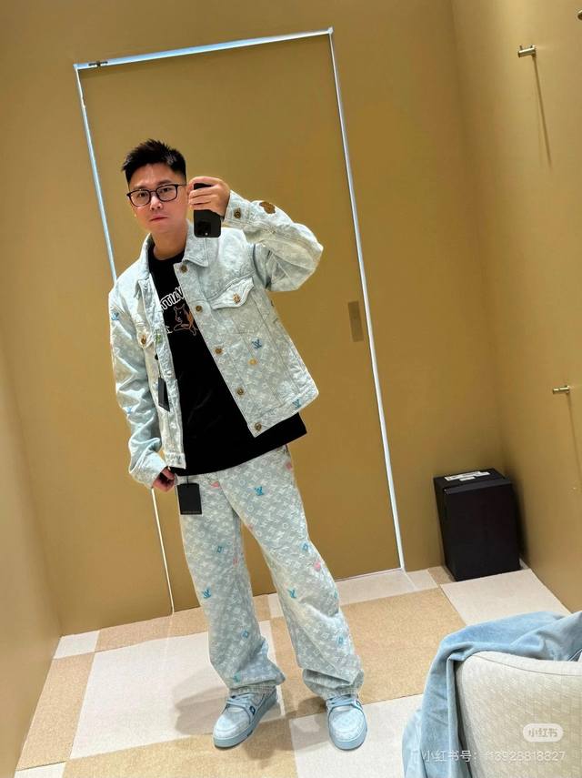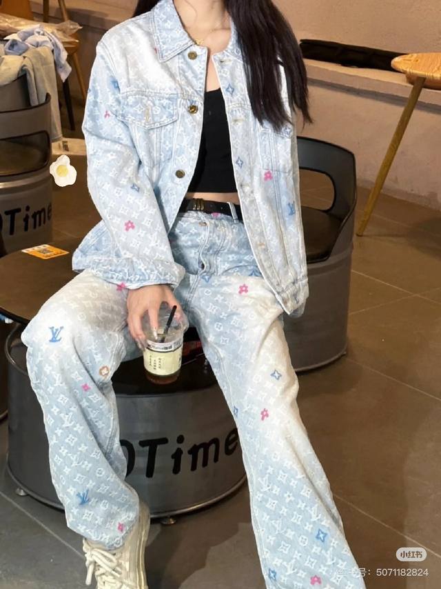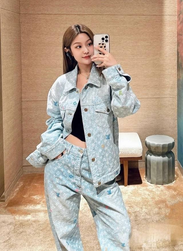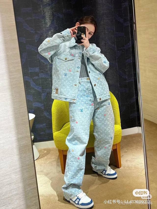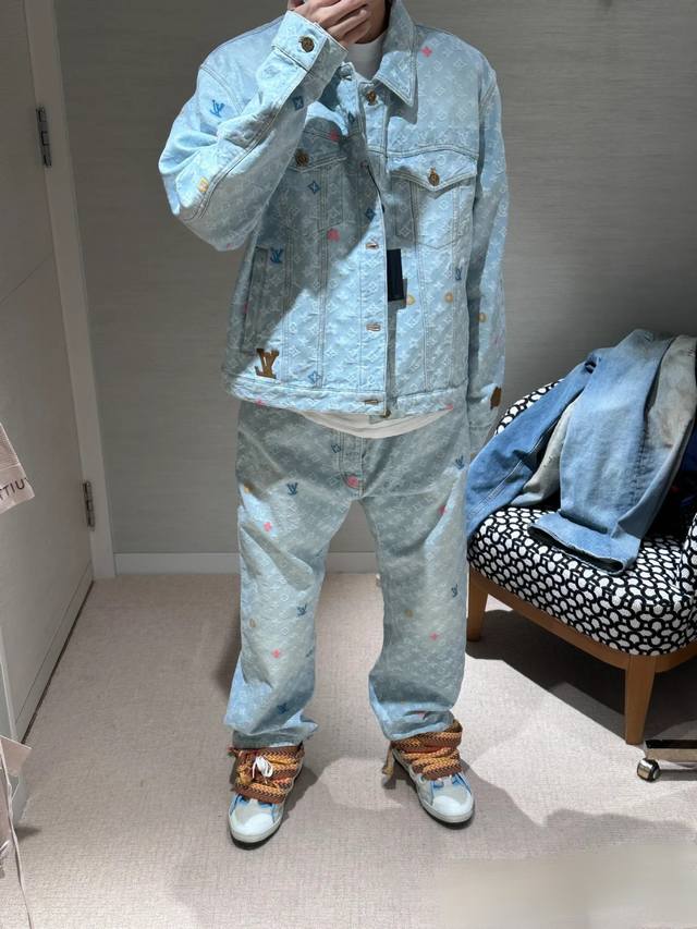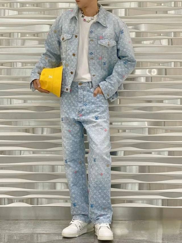 A top-notch replica of the model's jacket and pants! - Louis Vuitton x Tyler 24Ss Lv single-breasted denim jacket and pants set with floral and monogram embroidery, unisex. Also worn by celebrities like JJ Lin, Gong Jun, Victoria Song, Huang Xiaoming, Justin Bieber, Bai Jingting, and many others. This Tyler collaboration features a twill jacquard denim pattern meticulously designed with uniform spacing, creating a textured look with consistent widths. The distressed, vintage-inspired light blue is embellished with a monogram pattern and featured with targeted embroidery in four colors: blue, pink, yellow, and fluorescent green. The yarns are repeatedly matched to achieve perfect color matching. The all-over Monogram logo, in a candy-colored macaron, is embroidered with a stylish and sophisticated craftsmanship. The perfectly aligned neckline, chest pocket stitching, hem, and cuffs all contribute to a high level of fabric loss. The symmetrical workmanship reveals its intricacy! The sleeve patches echo the front pockets, creating a truly stunning look. Color: Washed Blue Size: Top S M L X L Pants S M L X L