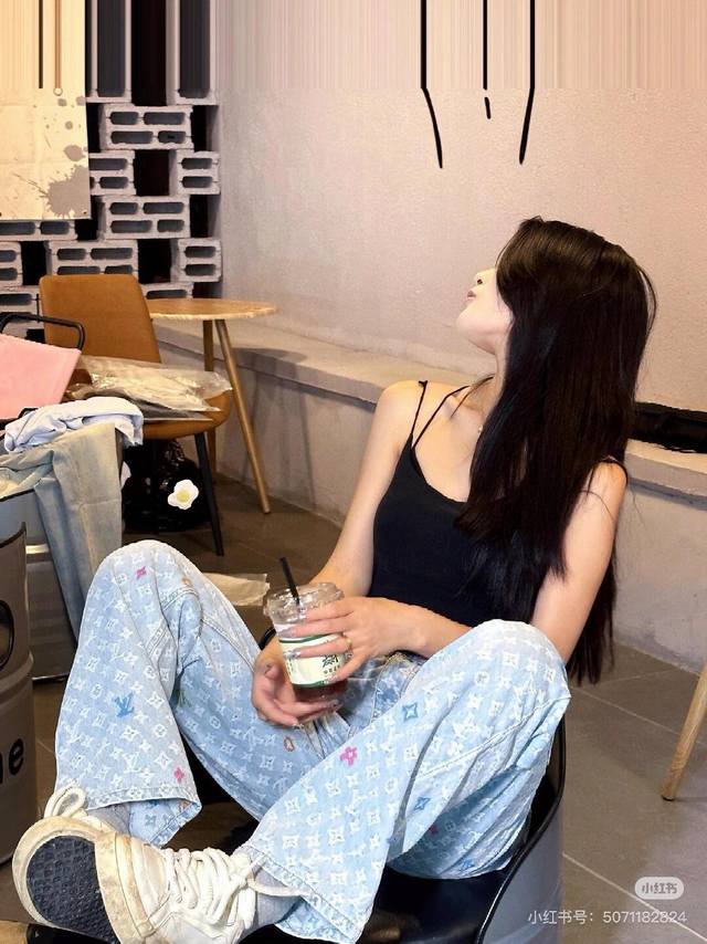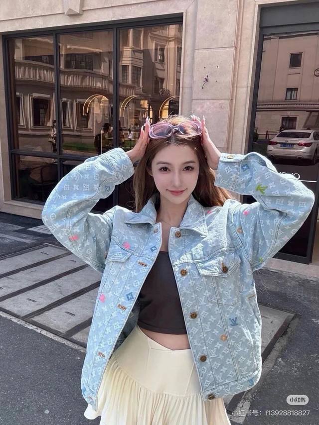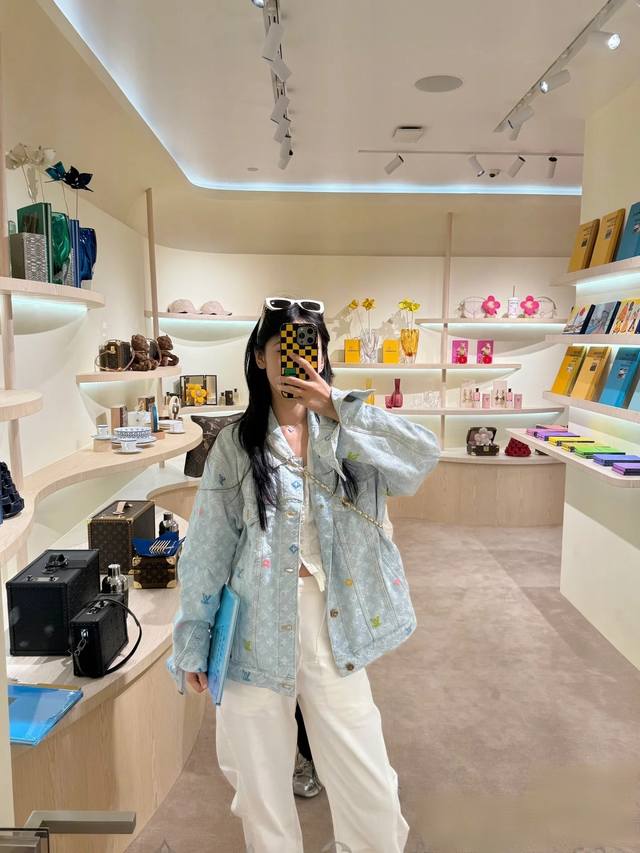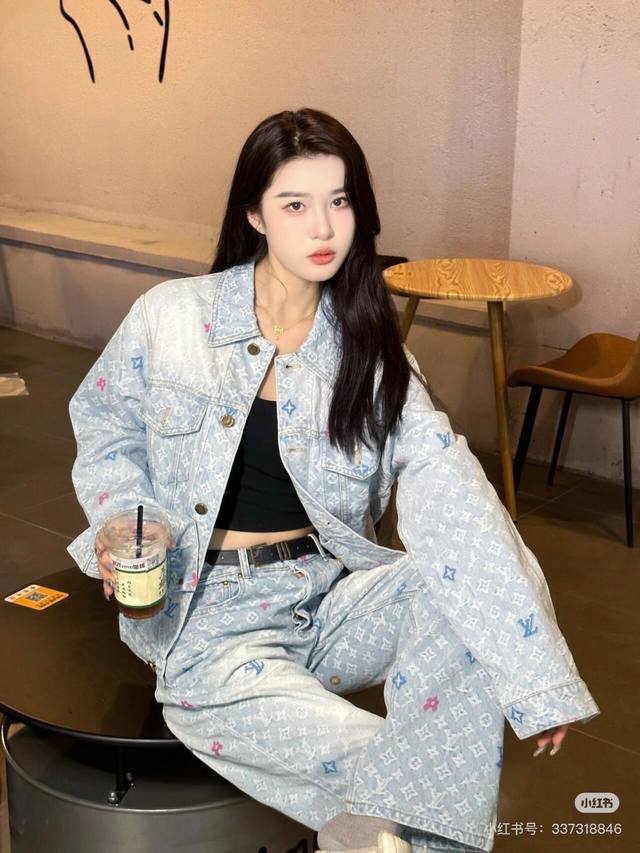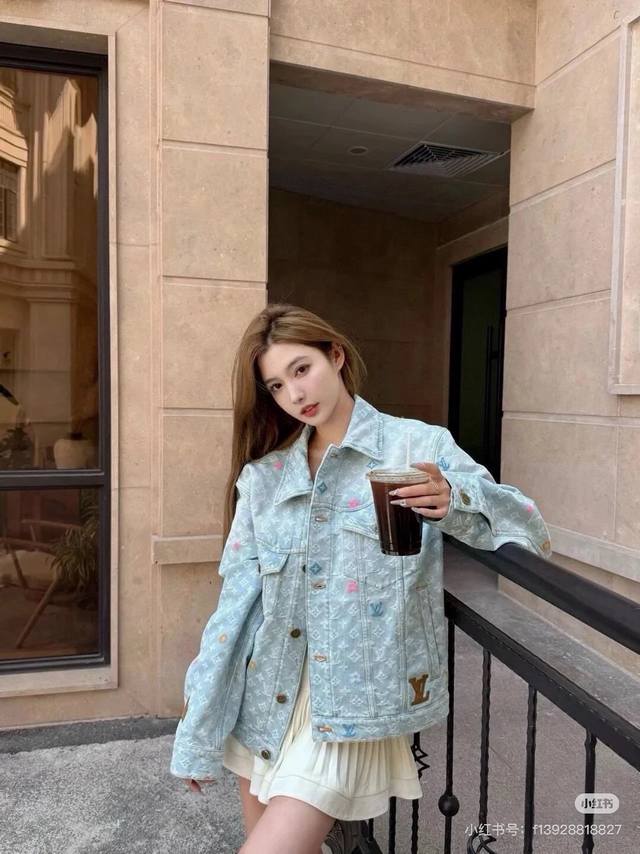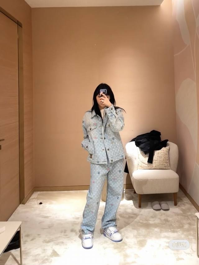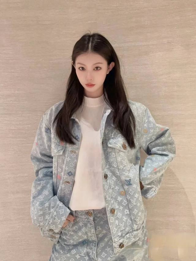 A top-notch replica of the model's jacket and pants! - Louis Vuitton x Tyler 24Ss Lv single-breasted denim jacket and pants set with floral and monogram embroidery, unisex. Also worn by celebrities like JJ Lin, Gong Jun, Victoria Song, Huang Xiaoming, Justin Bieber, Bai Jingting, and many others. This Tyler collaboration features a twill jacquard denim pattern meticulously designed with uniform spacing, creating a textured look with consistent widths. The distressed, vintage-inspired light blue is embellished with a monogram pattern and featured with targeted embroidery in four colors: blue, pink, yellow, and fluorescent green. The yarns are repeatedly matched to achieve perfect color matching. The all-over Monogram logo, in a candy-colored macaron, is embroidered with a stylish and sophisticated craftsmanship. The perfectly aligned neckline, chest pocket stitching, hem, and cuffs all contribute to a high level of fabric loss. The symmetrical workmanship reveals its intricacy! The sleeve patches echo the front pockets, creating a truly stunning look. Color: Washed Blue Size: Top S M L X L Pants S M L X L