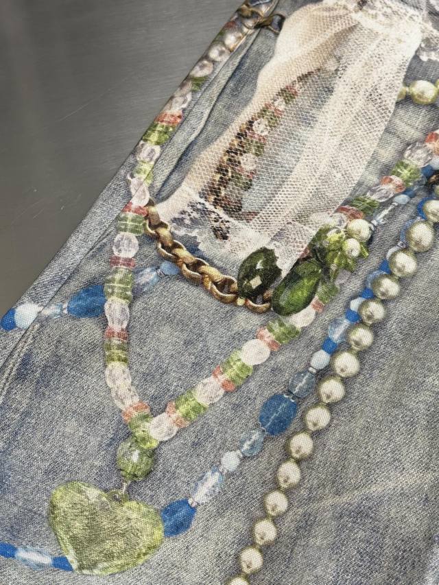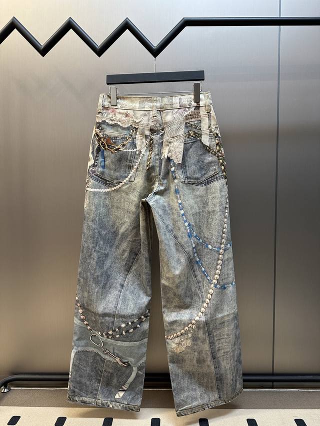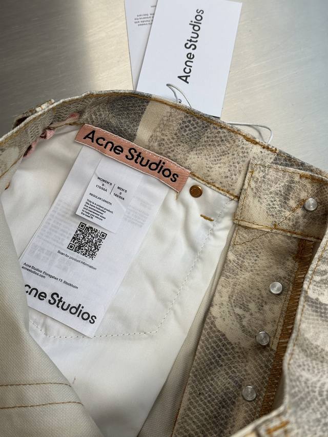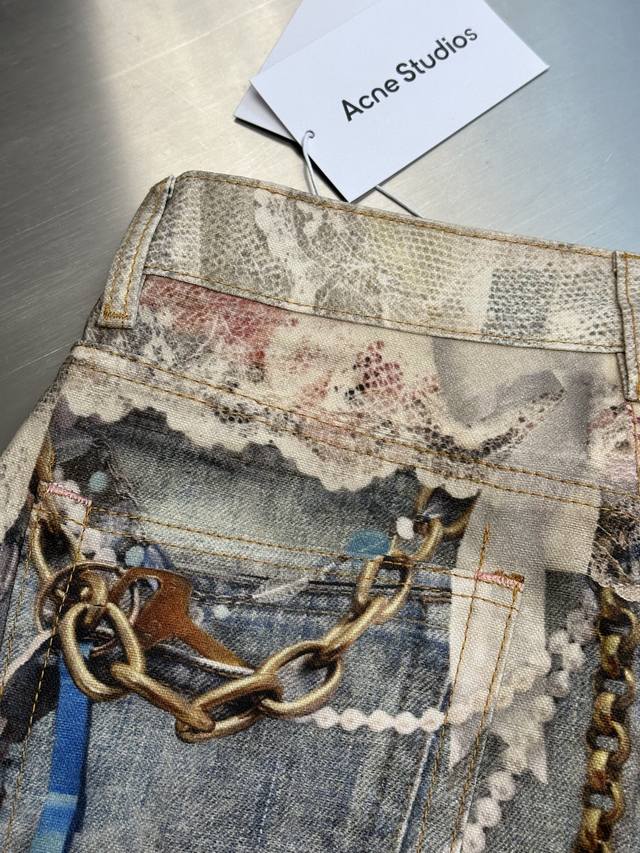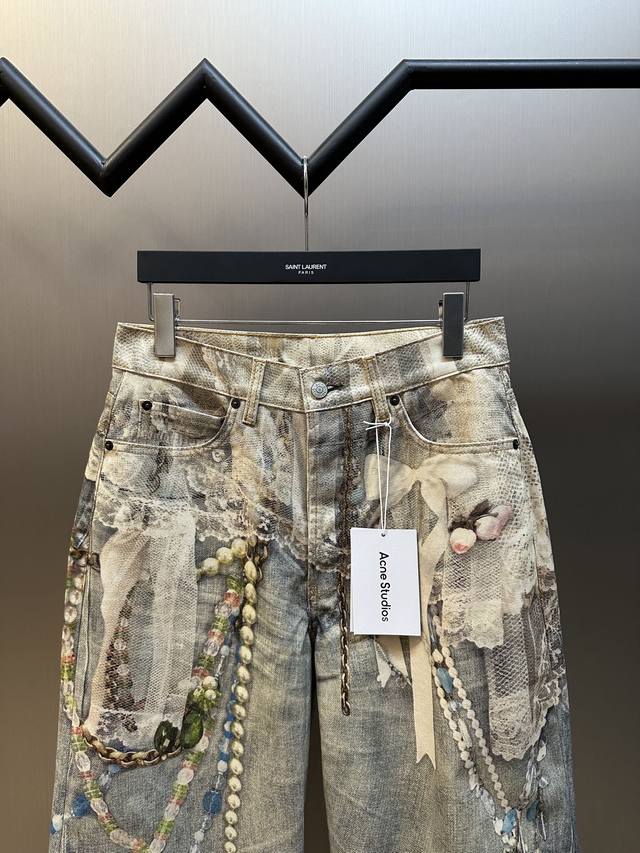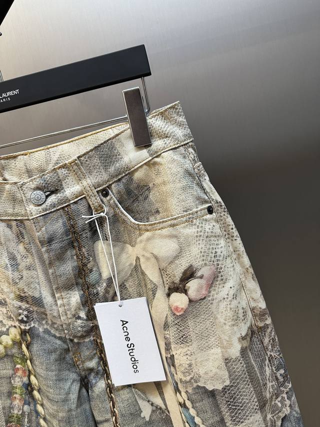 Acne lace print jeans feature a relaxed straight-leg fit with a low rise, wide legs, and a long length. Embellished with a lace print, they are made from washed, non-stretch denim. Sizes: 42, 44, 46, 48, 50.