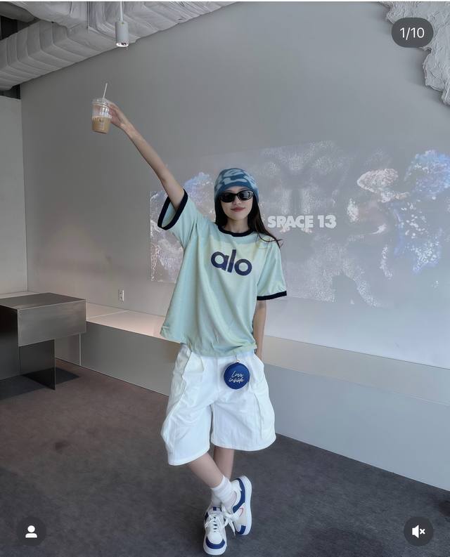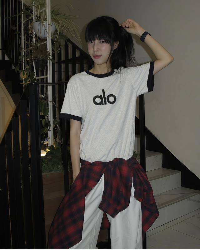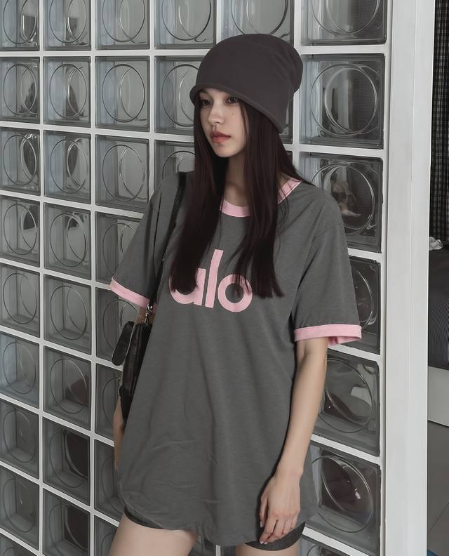 Alo contrast color stitching Ins style foam printing Logo loose lazy style T-shirt