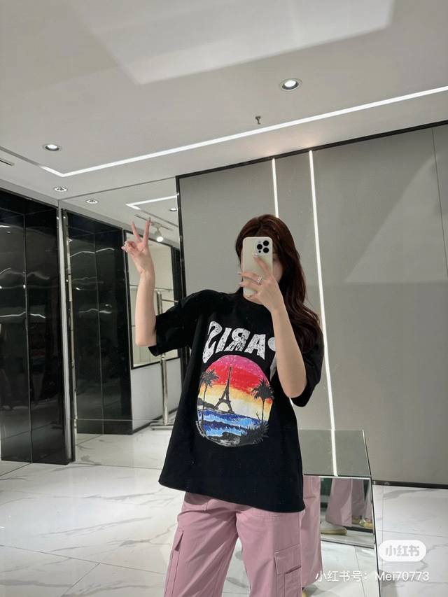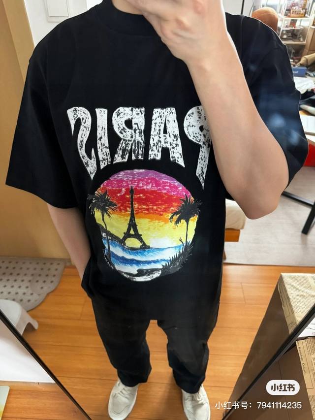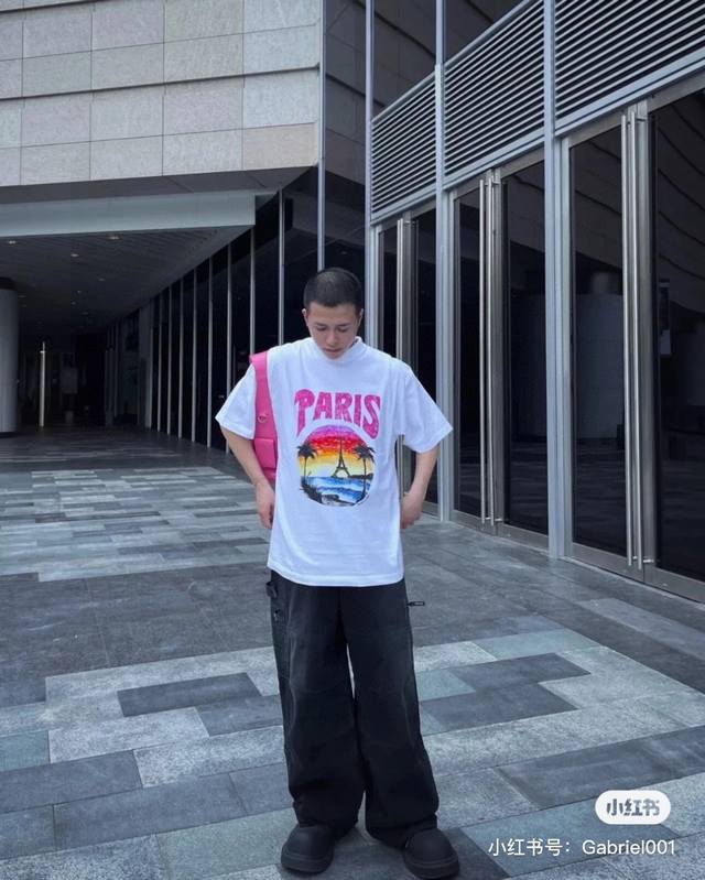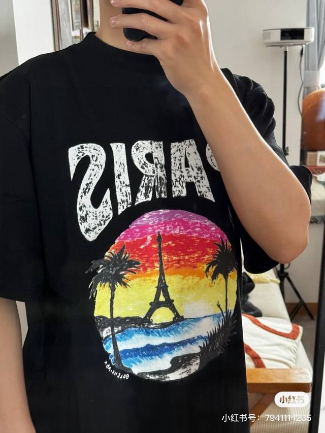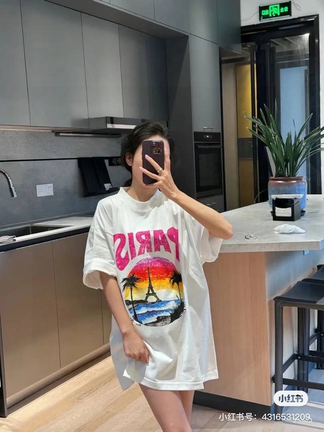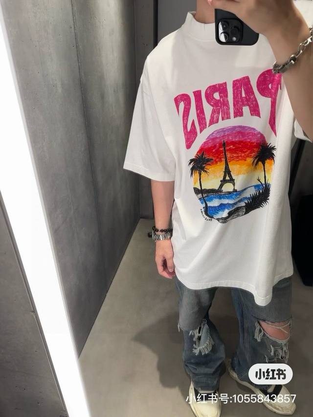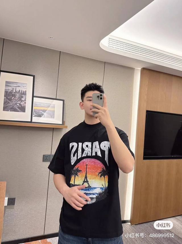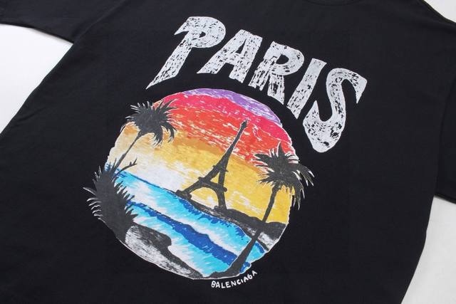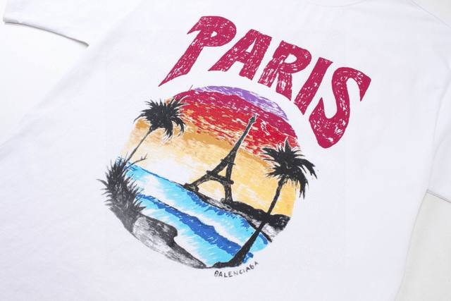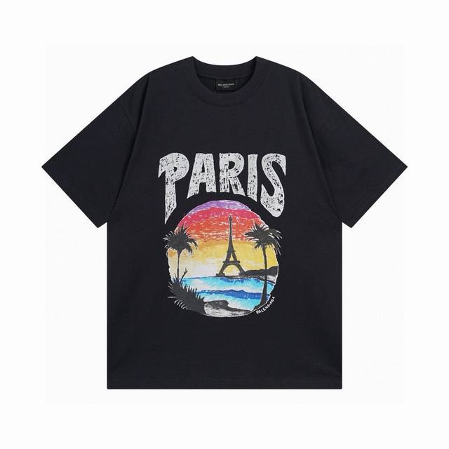 Balenciaga 2025Ss Hawaiian Sunset Coconut Tree and Tower Logo Printed Short-Slee
