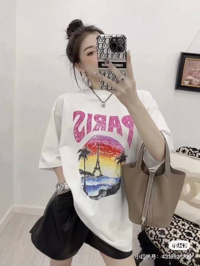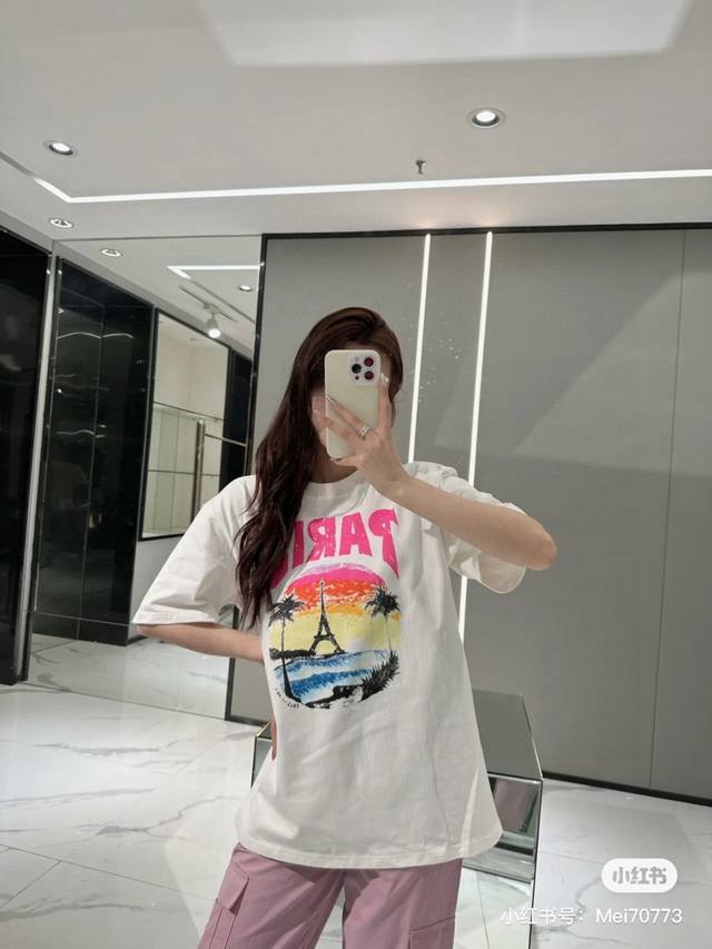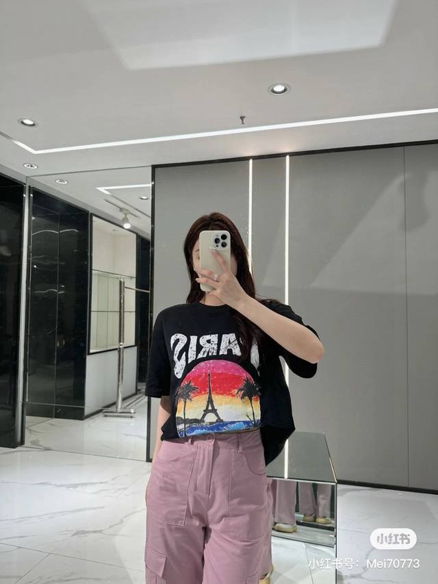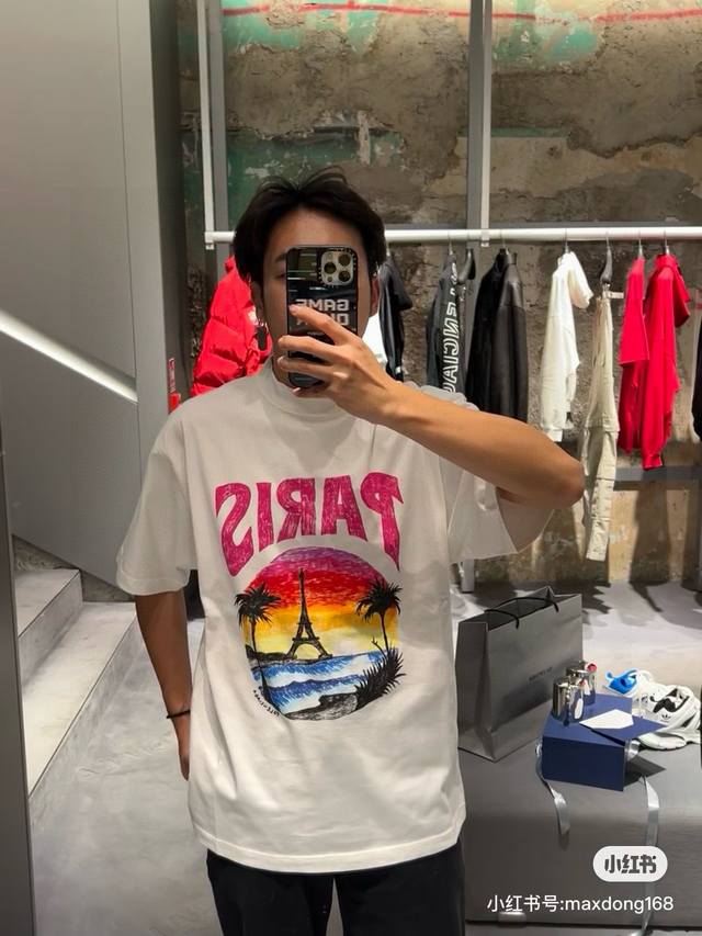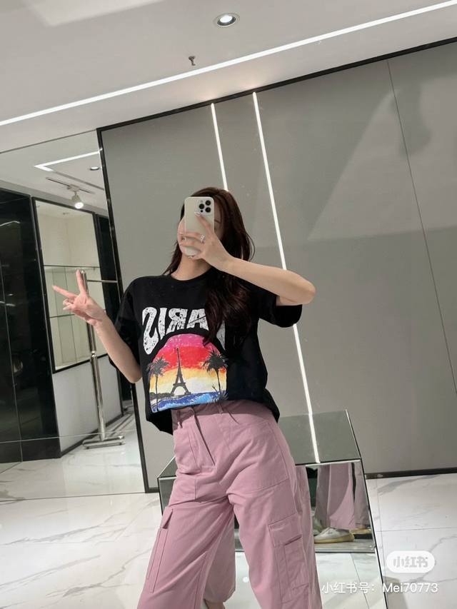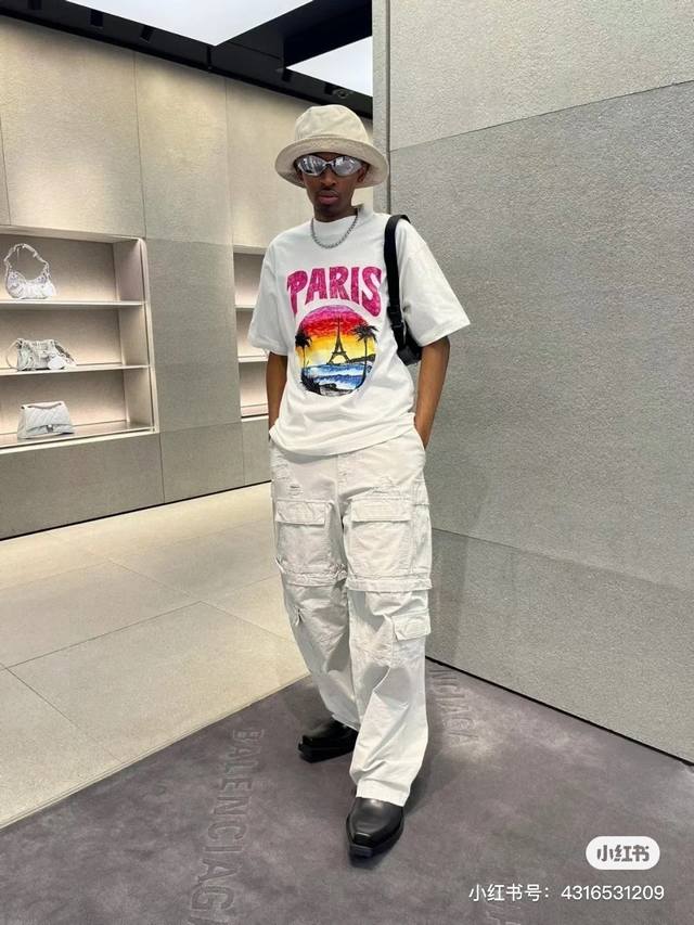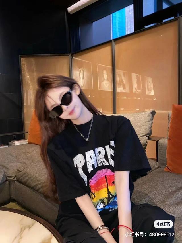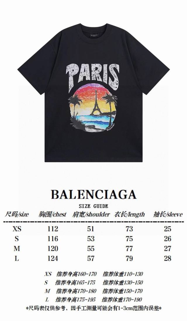 Balenciaga 2025Ss Hawaiian Sunset Coconut Tree and Tower Logo Printed Short-Slee