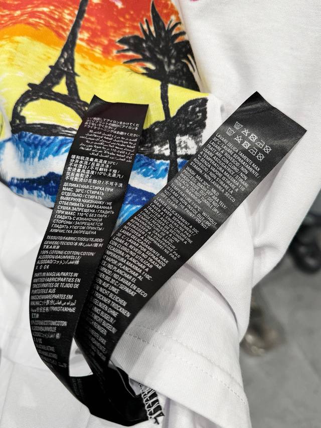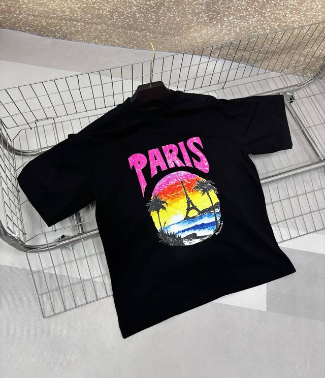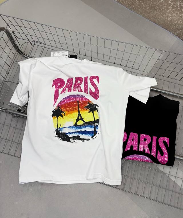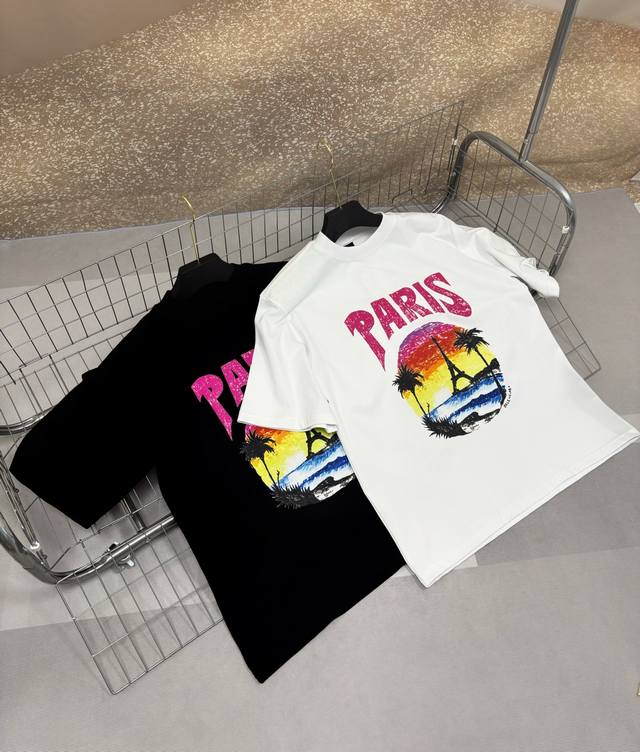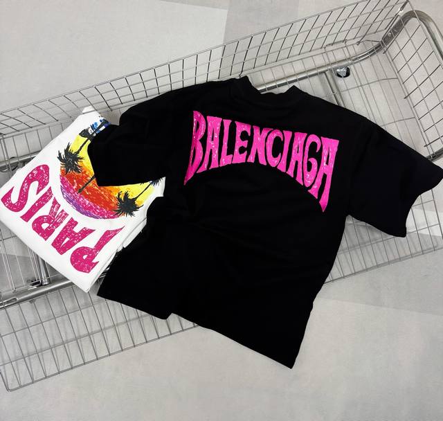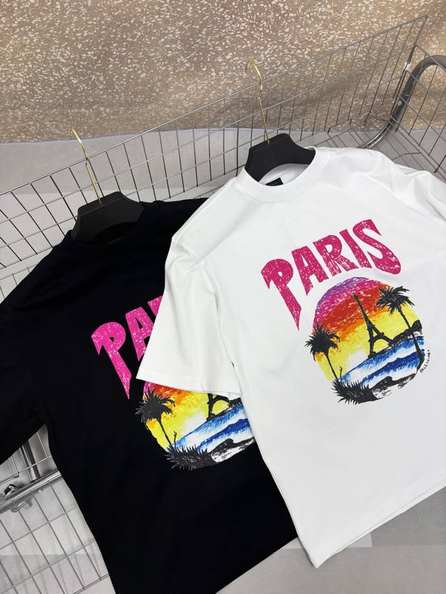 Balenciaga 24S summer coconut palm sunset print short-sleeve top, a popular recommendation. High-quality original fabric, the same style worn by influencers and celebrities. 300g heavyweight 32s double-yarn washed fabric, imported raw pulp printing process, heavy craftsmanship, very comfortable feel, super versatile and beautiful. This short-sleeve top has all three labels, suitable for both men and women. It's not a common version on the market, so you can compare it at will. Quality is absolutely guaranteed. Colors: Black, White. Size Chart: Back Length, Chest, Shoulder Width, Sleeve Length: XS 71 116 52 26S 74 53 26.5M 77 124 54 27L 80 128 55 27.5......................... ...............