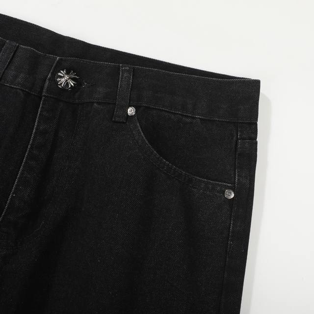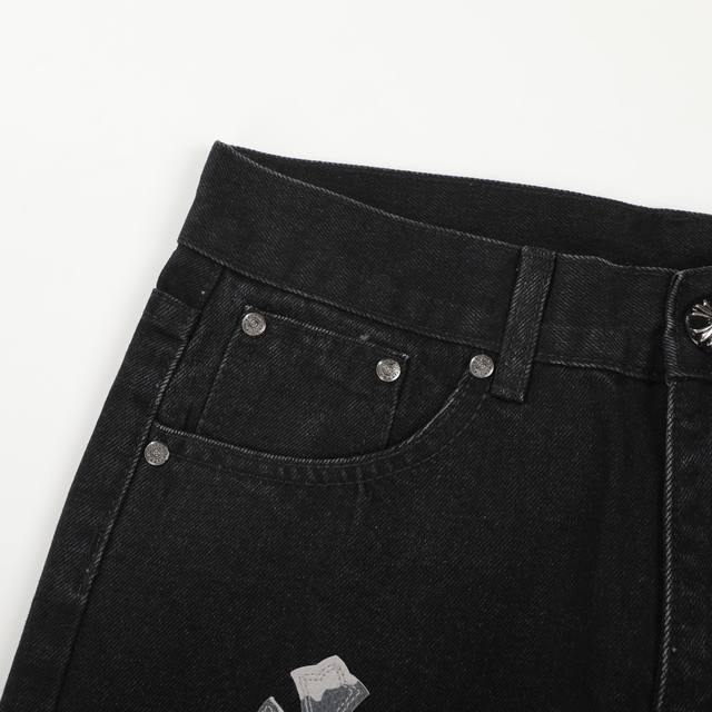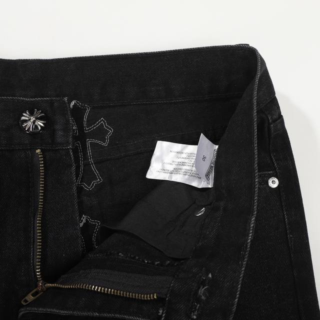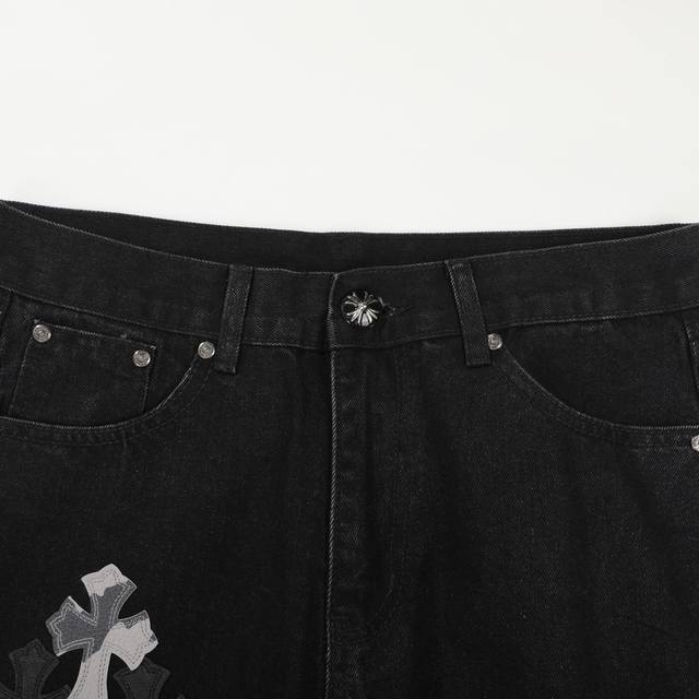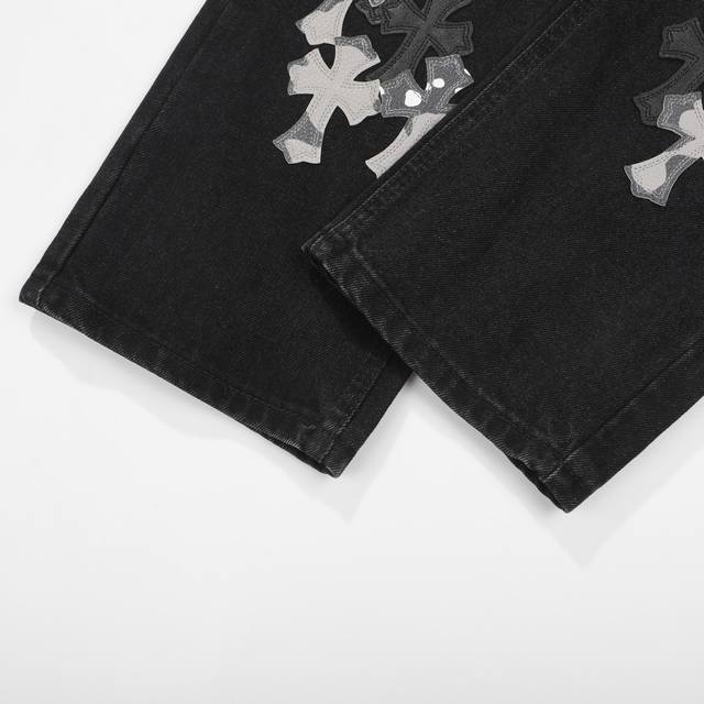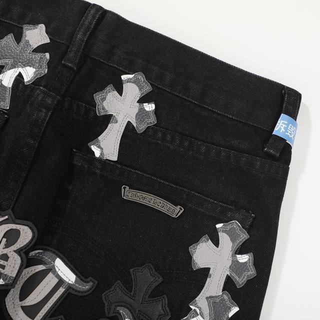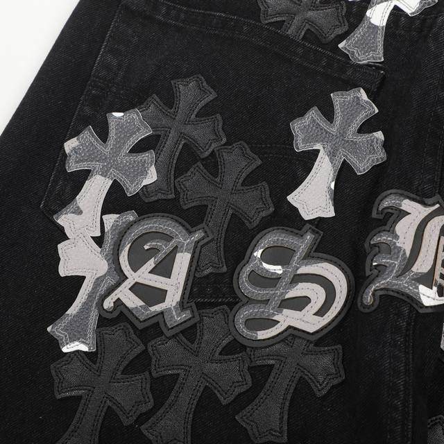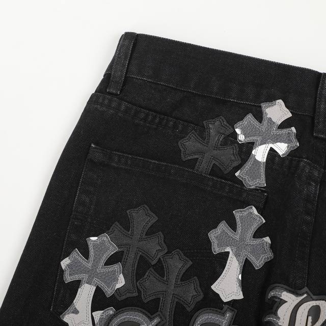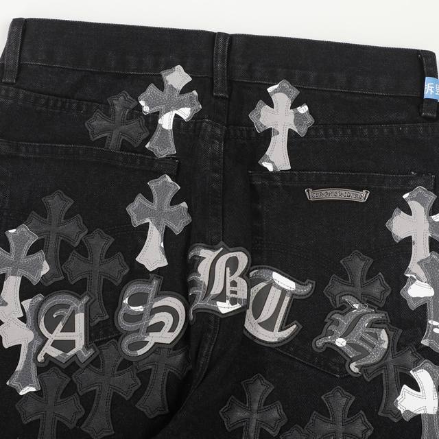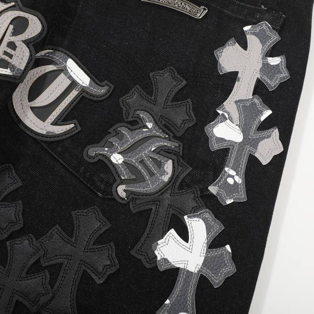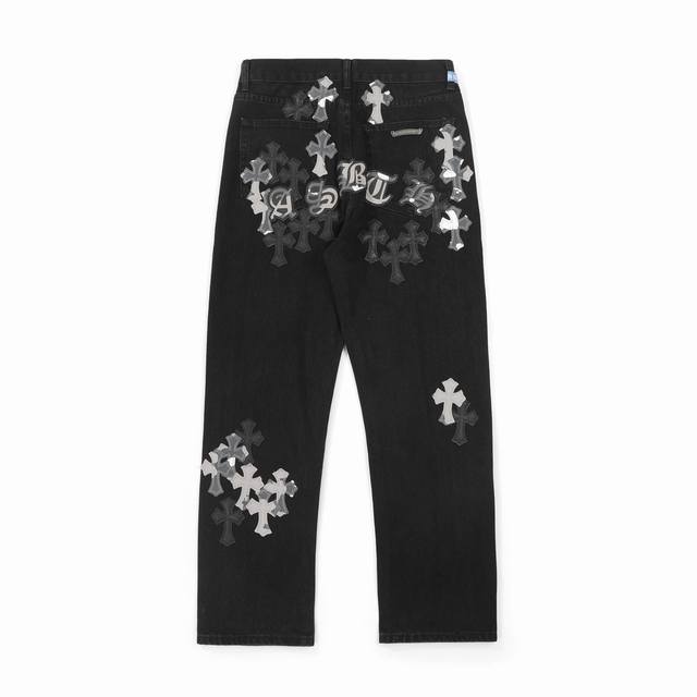Chrome Hearts black washed jeans with multi-leather details, authentically recre