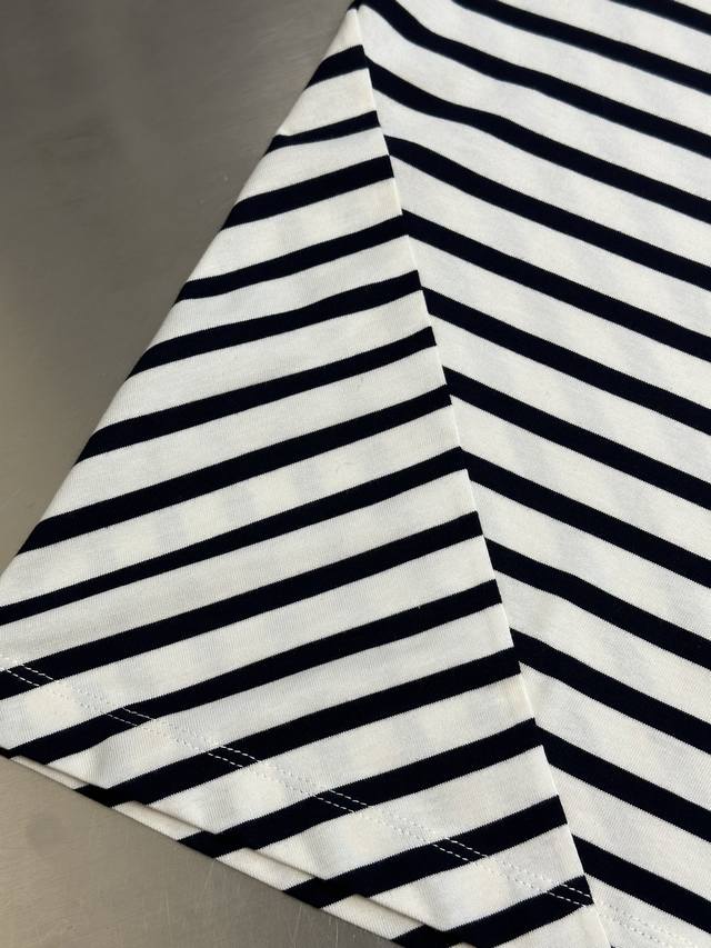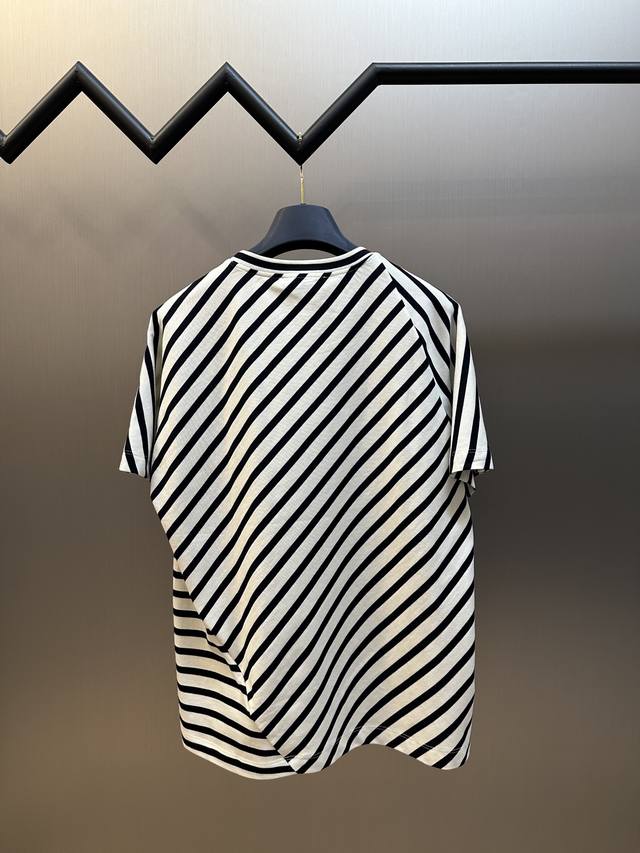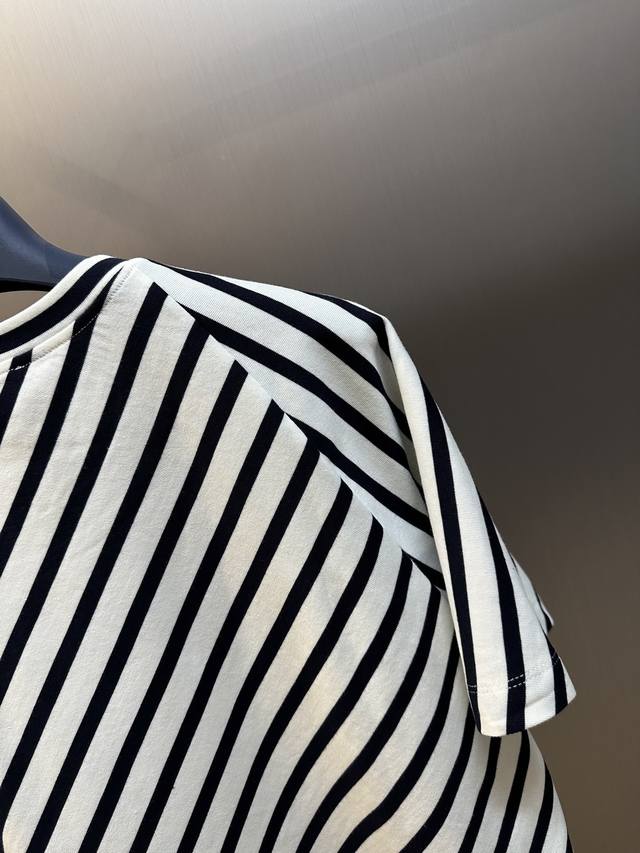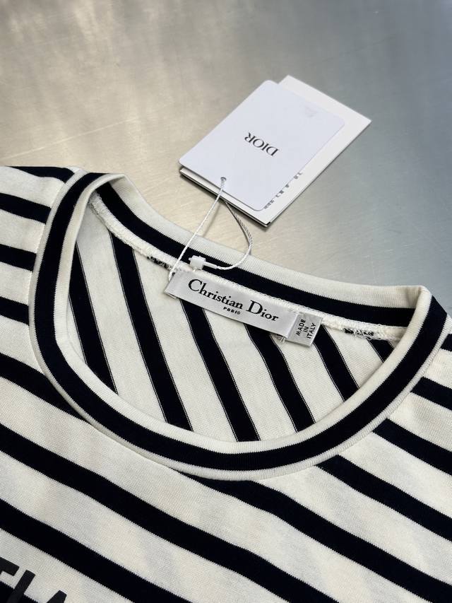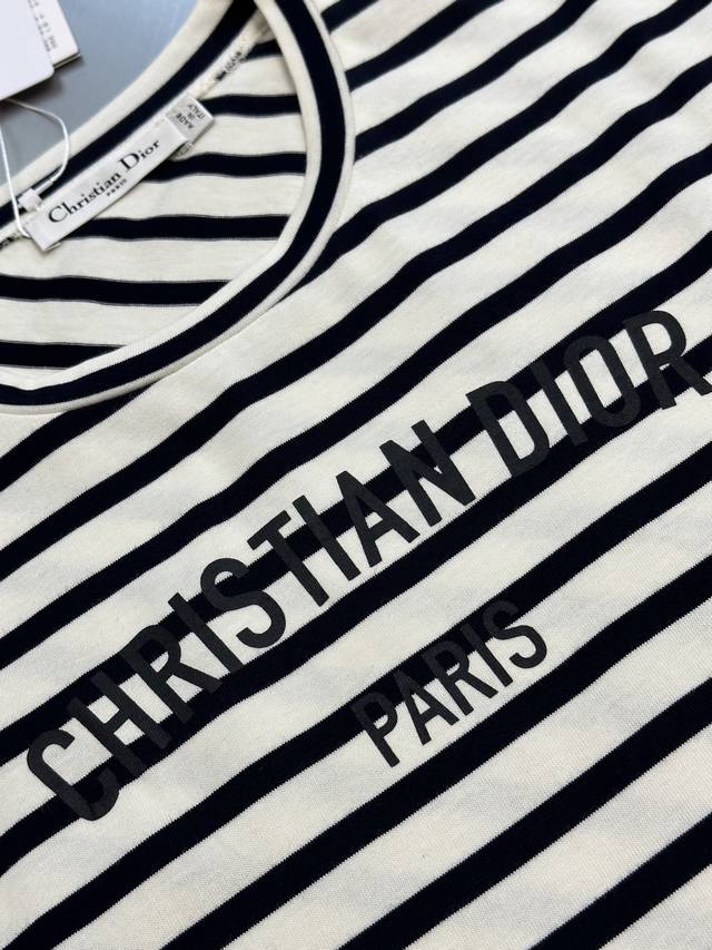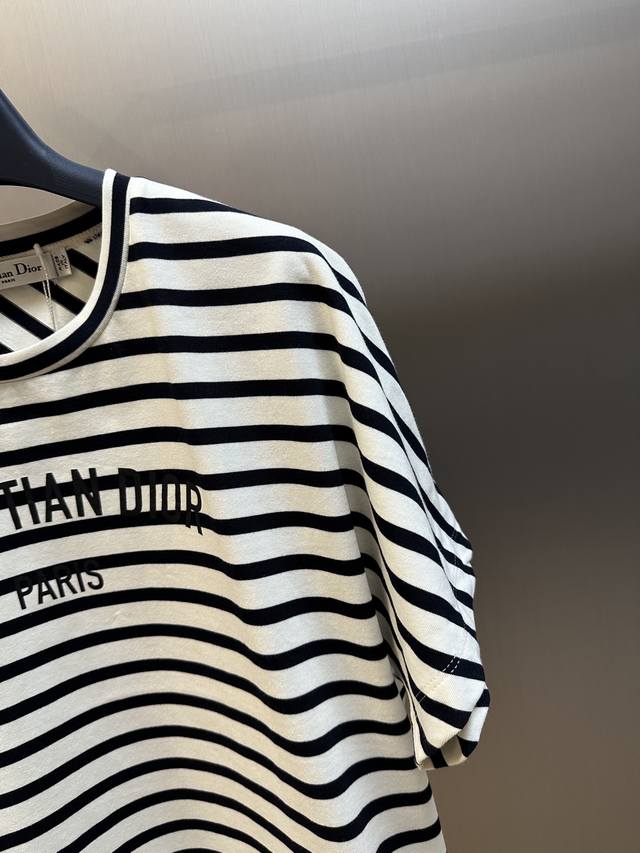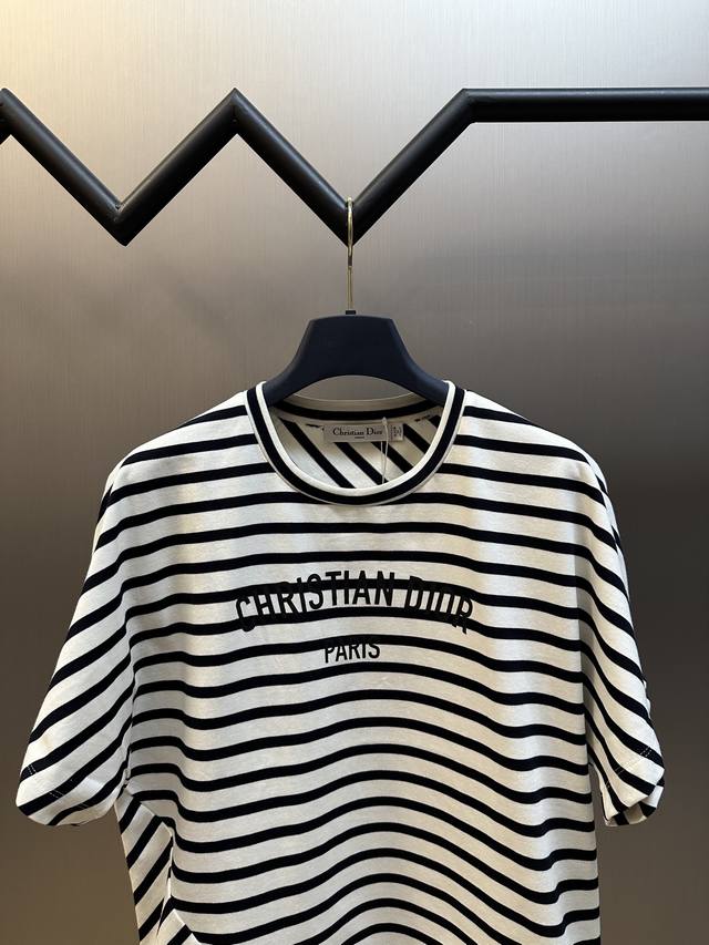 Dior irregular stripes short-sleeved navy and white cotton jersey. This T-shirt features a deconstructed D-Stripes pattern, creating an origami effect for a chic look. Crafted from navy and white cotton jersey, it features the Christian Dior Paris signature on the front. The wide-cut short sleeves add a refined touch, perfect for any outfit year-round. Sizes: S M L