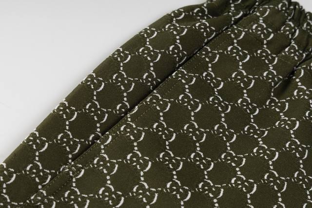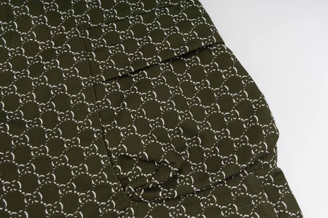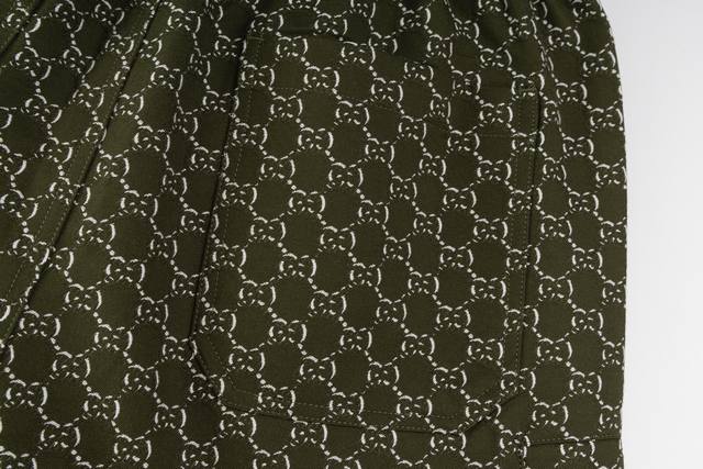 The fabric is made of Shadow green and white cotton jacquard, and the pattern design is inspired by the initials of the brand founder Mr. O, who has always been a favorite of the brand. These shorts are made of cotton jacquard with Shadow pattern and have an elastic waistband with drawstring, two front pockets, two side pockets and two back pockets.