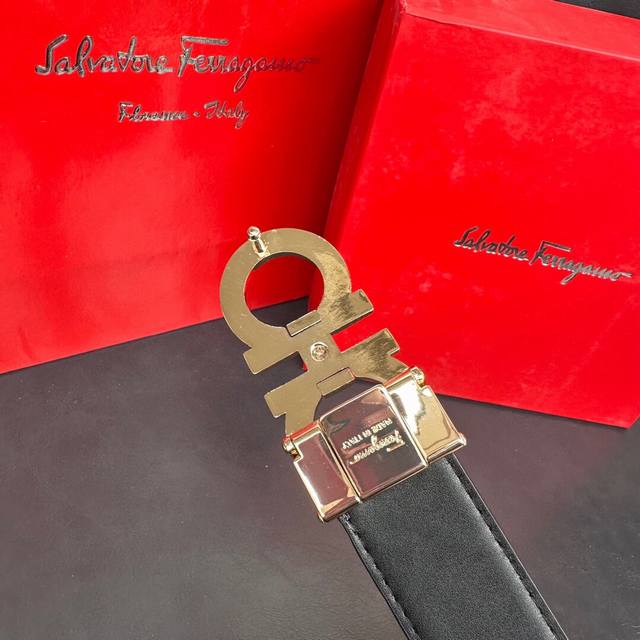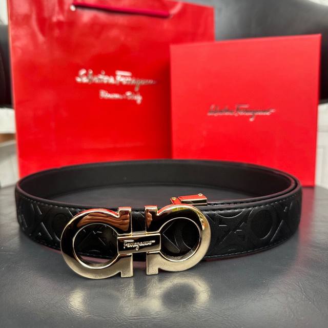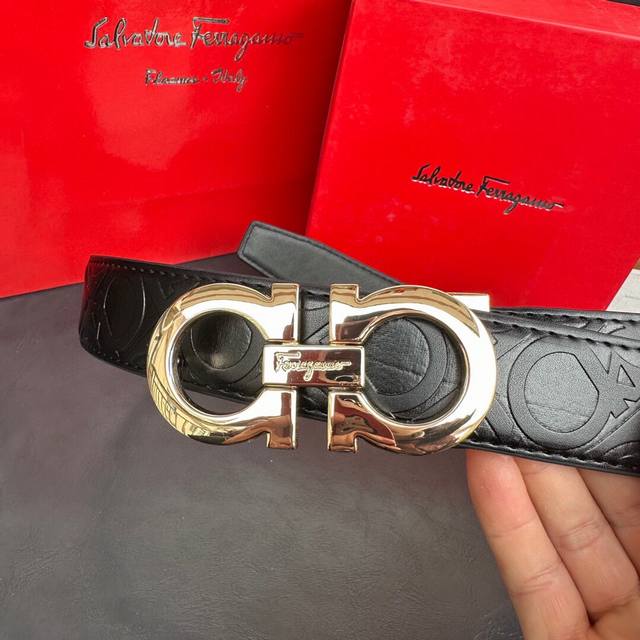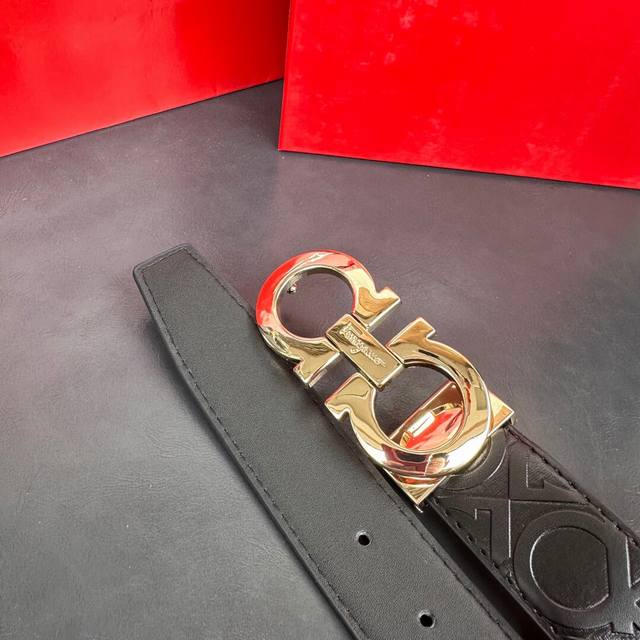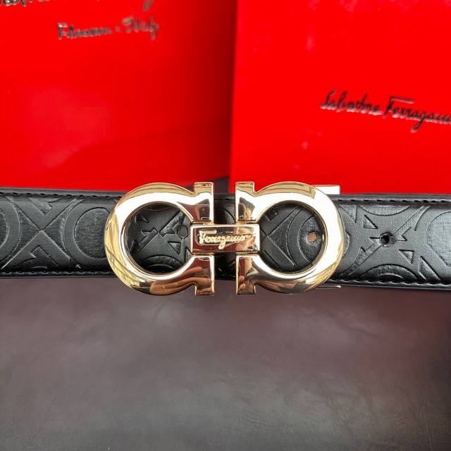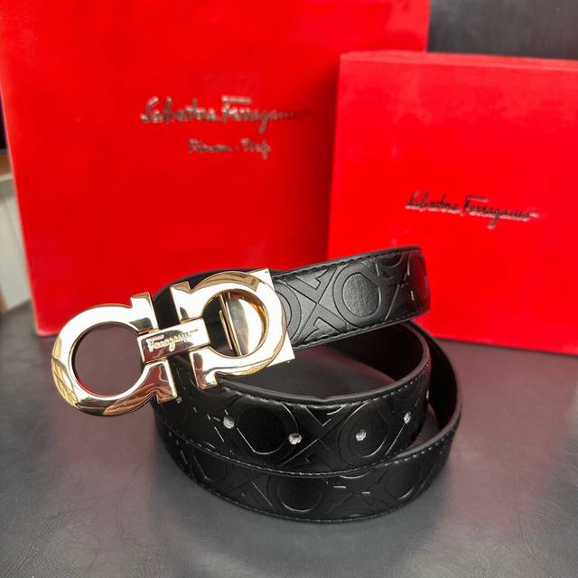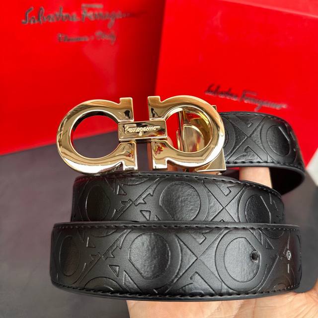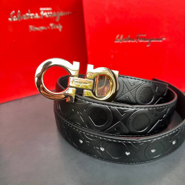 Ferragamo gold-embossed belt. This classic Ferragamo belt features a double-side