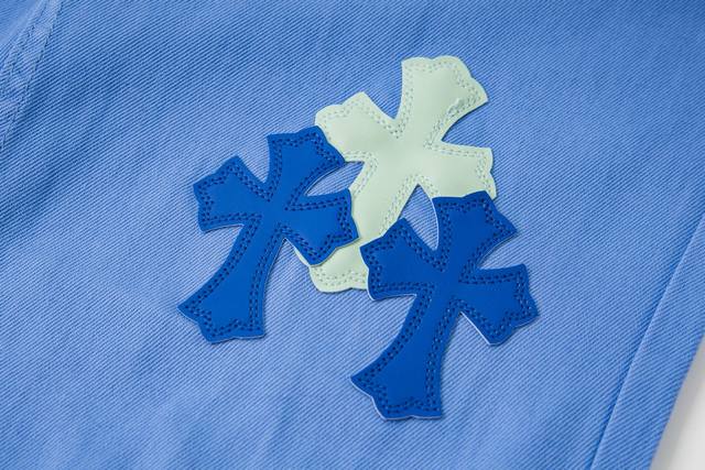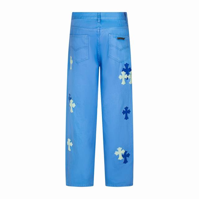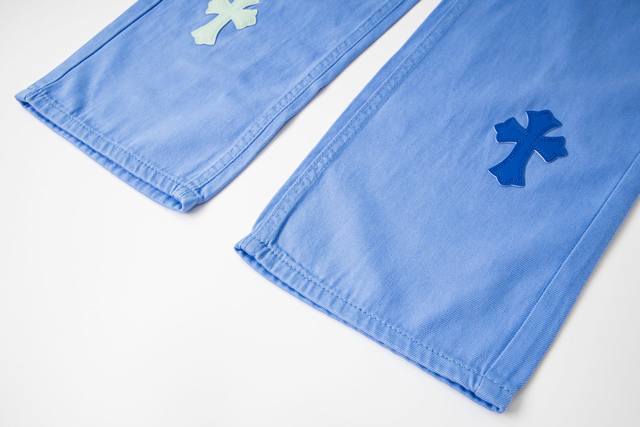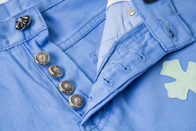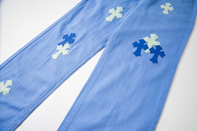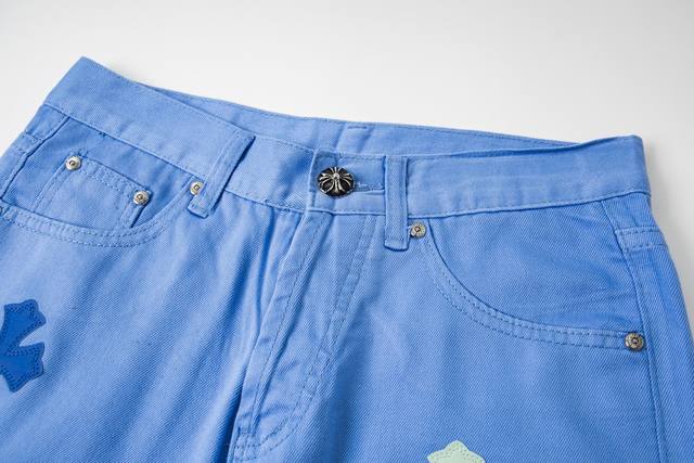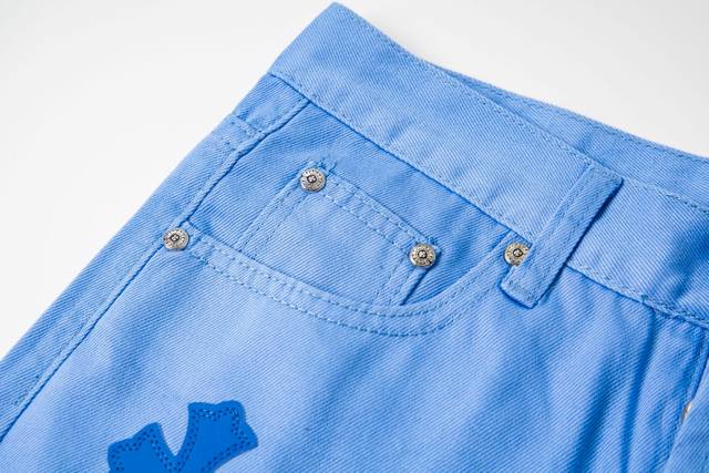High version Chrome Hearts dopamine color matching ice blue leather label cross jeans, unisex. Ch jeans need to be washed as finished products and then disassembled and hand-sewn with sheepskin cross leather before being spliced together. The whole process is too complicated to describe. The texture is just for the touch, and it looks good. The most amazing pants in Chrome Hearts are made of beaded canvas fabric, which makes the upper body more textured and the pants are upright! The three-dimensional cutting of the whole pants is amazing! Hardware Zp customization, the beaded canvas fabric is thick and soft after washing and has good breathability. The customized small leather label has a unique design with ingenious details, simple and generous, exquisite workmanship, neat lines on the whole pants, and details in place! Gender-neutral shorts that can be easily controlled by men and women are trendy! Size: 28-30-32-34