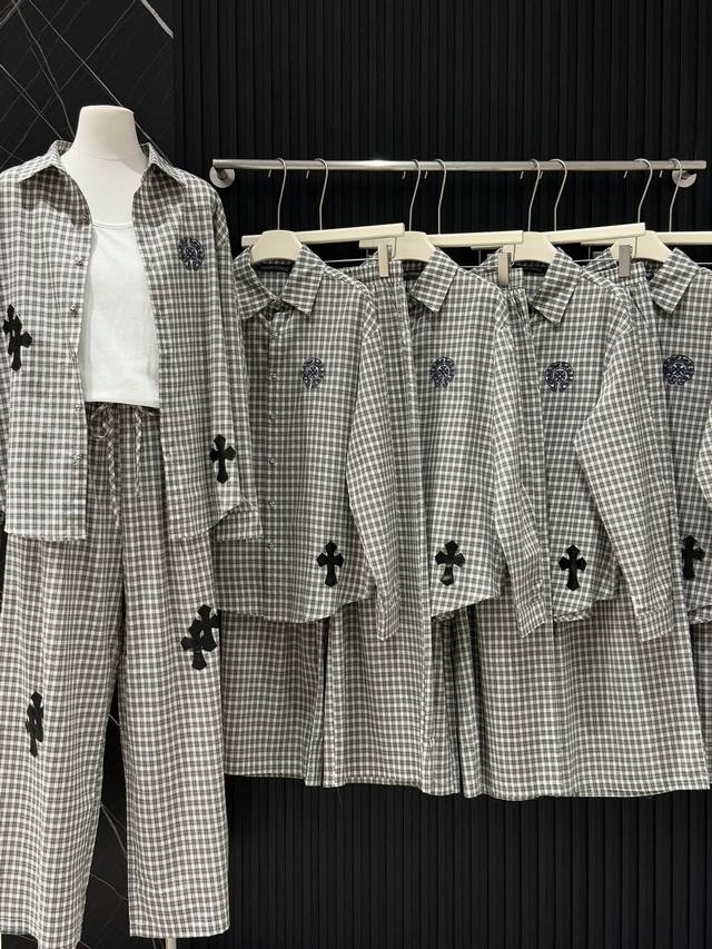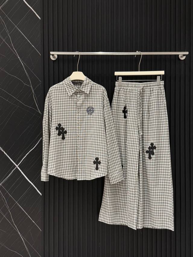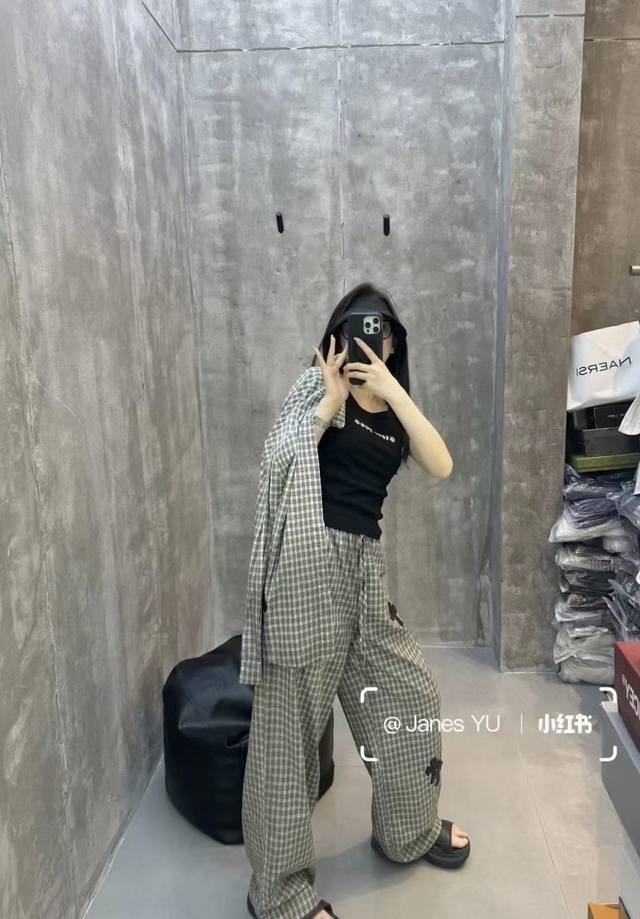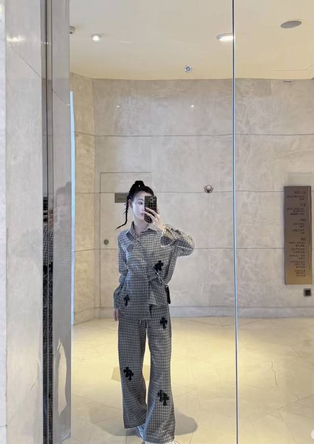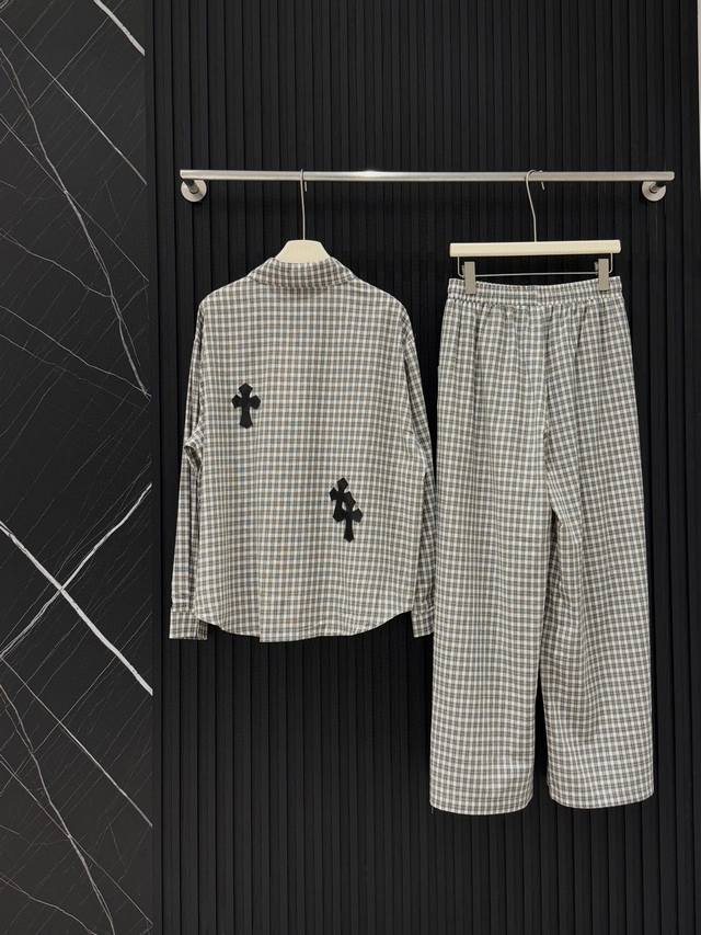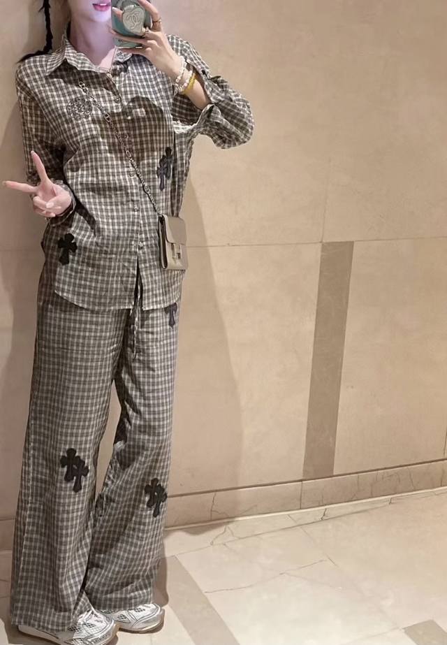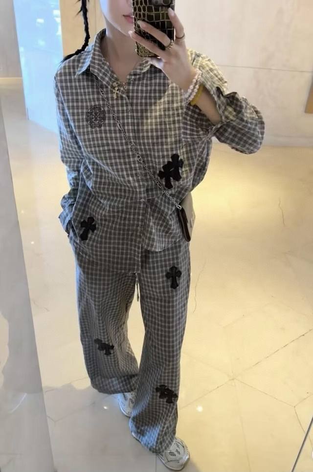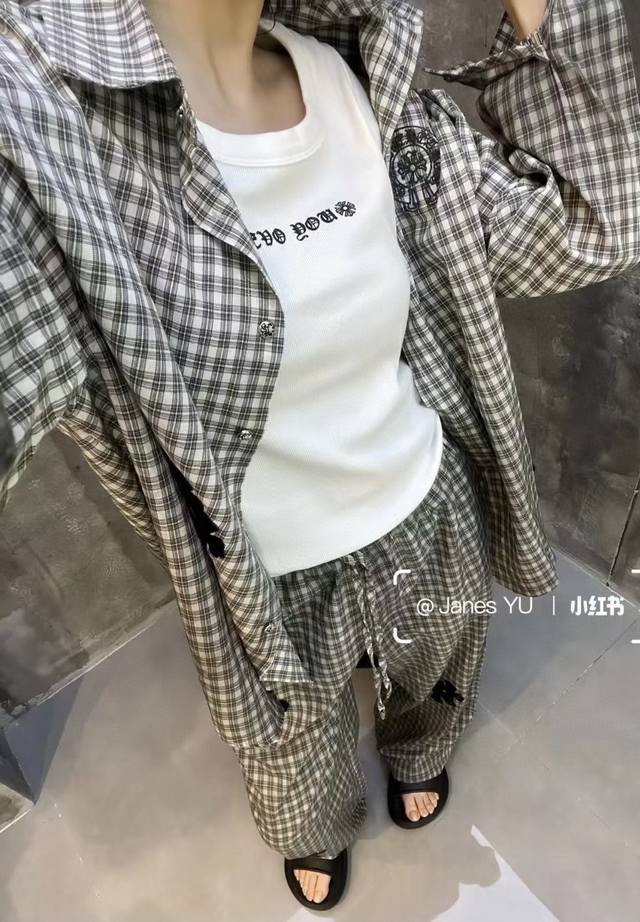 High-end trousers set Ch Chrome Hearts plaid suit I love it so much! It's so loose. The material of the Chrome Hearts plaid shirt + pants set is that thin upper body, light and breathable, super comfortable. A must-have for early eight people to wear a lazy feeling~~Sml shirt length 67-68-69 chest -114-118 pants length 98-99- waist 62-76 elastic waist Chrome Hearts plaid shirt and pants set I fell in love with it at first sight. I was fascinated by this plaid suit of Ch~The new Chrome Hearts plaid cross shirt and pants set is a lazy standard set.