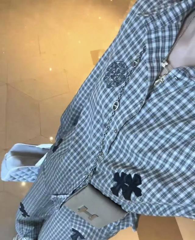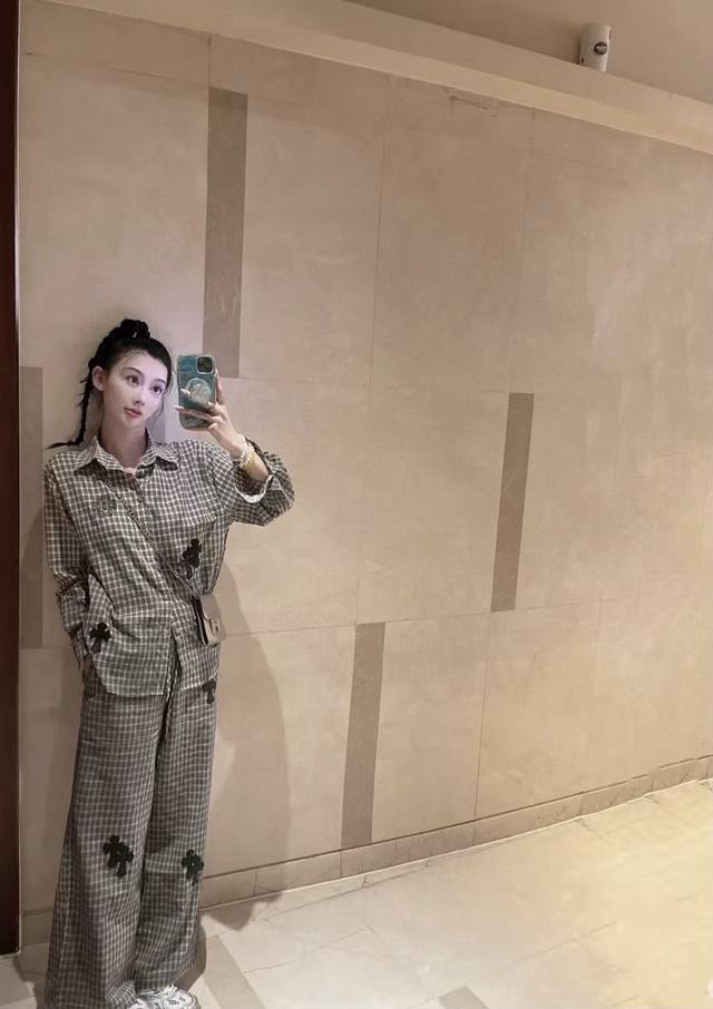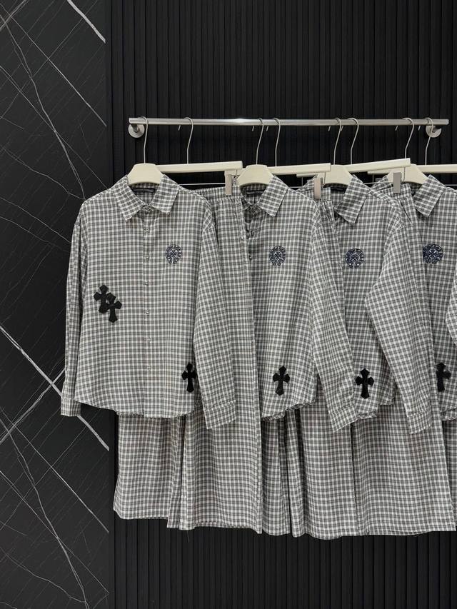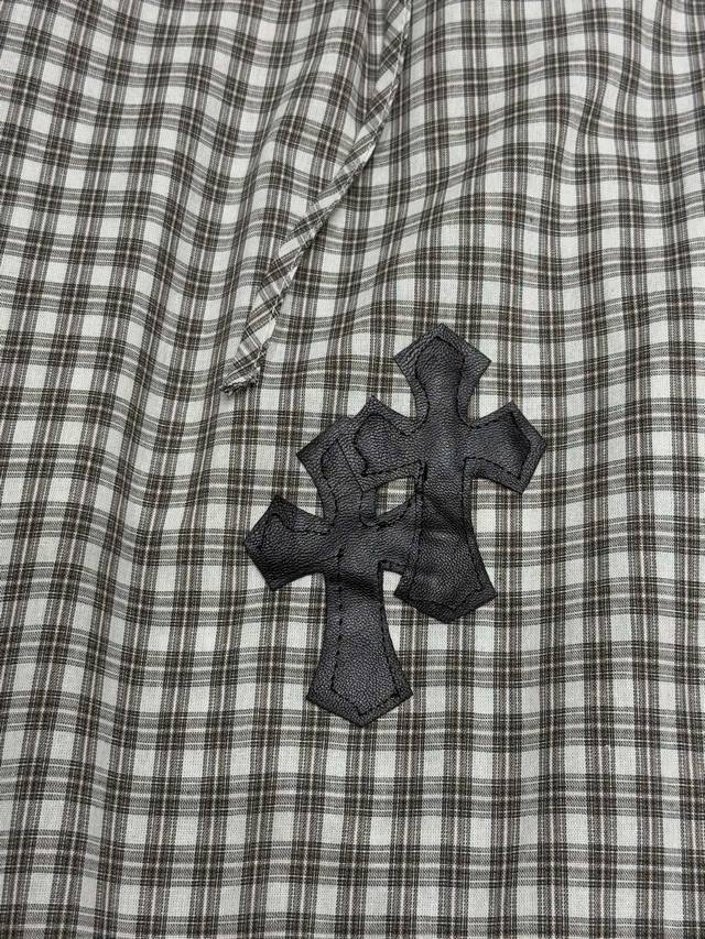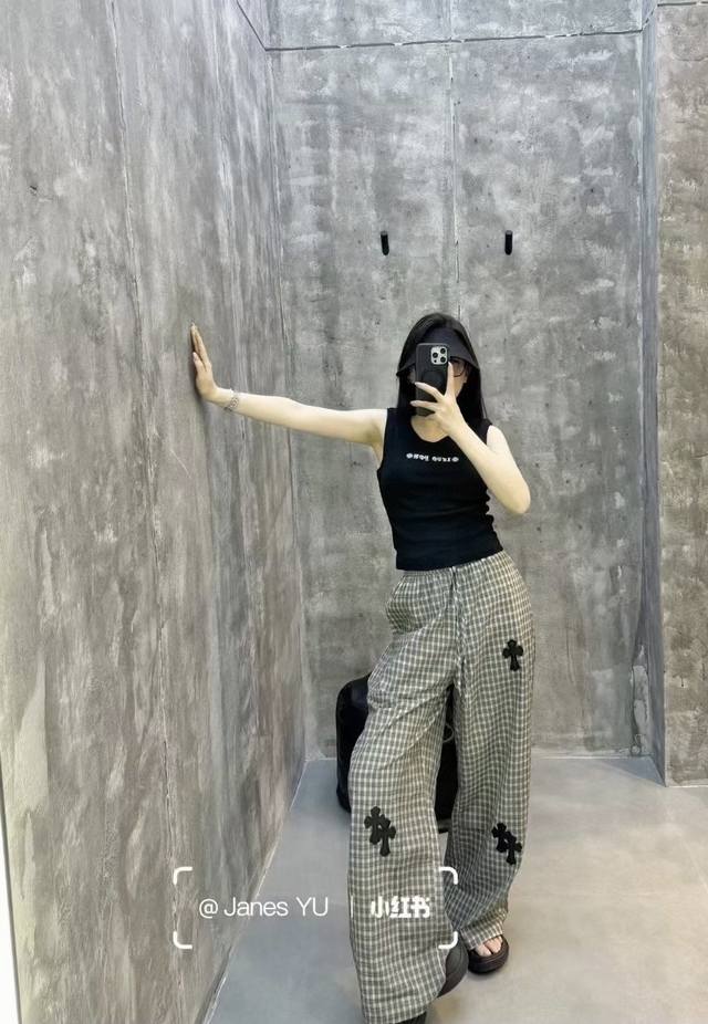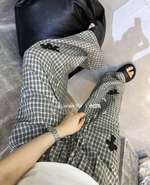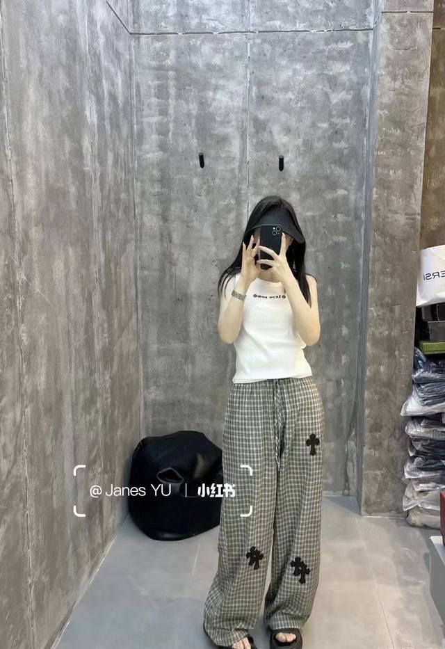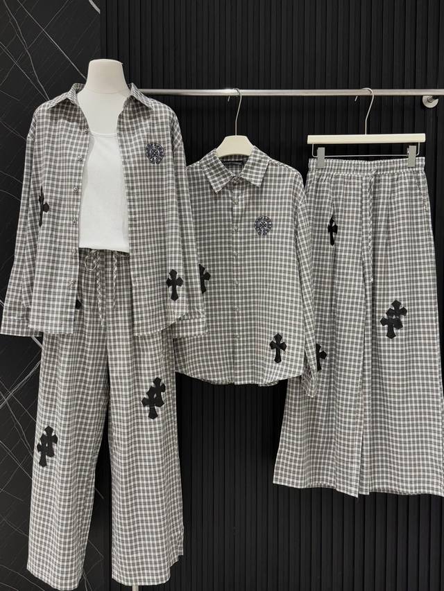 High-end trousers set Ch Chrome Hearts plaid suit I love it so much! It's so loose. The material of the Chrome Hearts plaid shirt + pants set is that thin upper body, light and breathable, super comfortable. A must-have for early eight people to wear a lazy feeling~~Sml shirt length 67-68-69 chest -114-118 pants length 98-99- waist 62-76 elastic waist Chrome Hearts plaid shirt and pants set I fell in love with it at first sight. I was fascinated by this plaid suit of Ch~The new Chrome Hearts plaid cross shirt and pants set is a lazy standard set.
