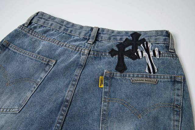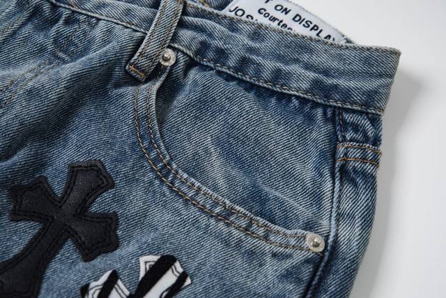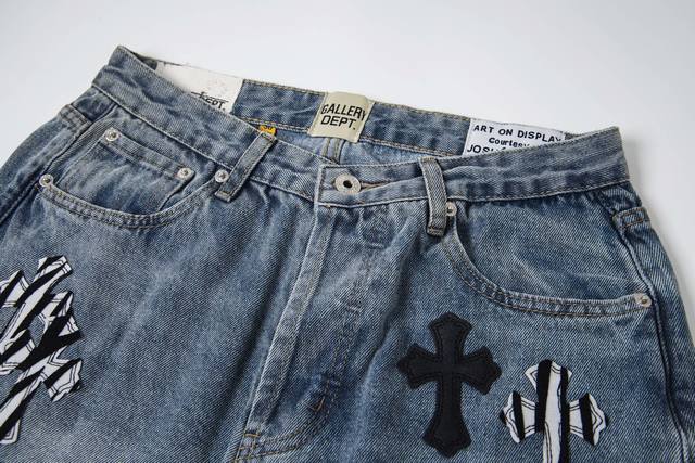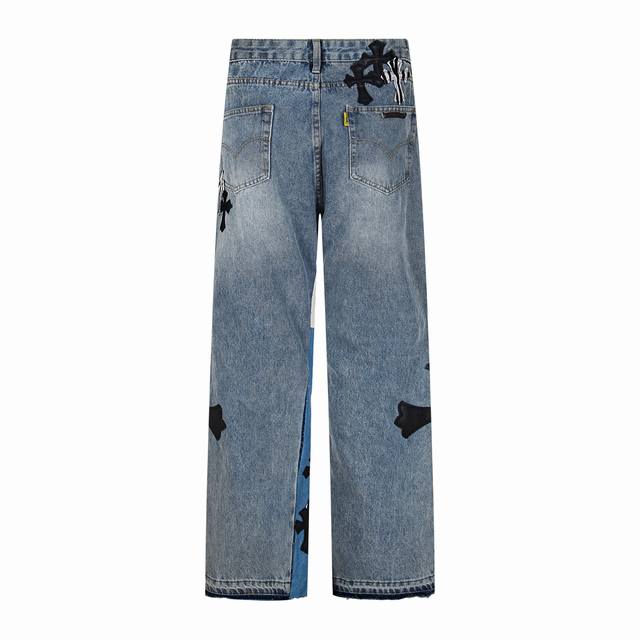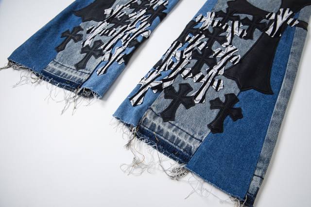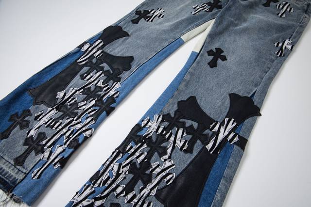 High-quality Chrome Hearts x Gallery Dept. collaboration, leather-labeled cross-stitched flared jeans, unisex, and a year-round hit. The multiple stitching steps are inherently challenging and time-consuming, yet the ultimate vintage quality is truly recreated. Made from Italian-made printed cowhide, these jeans are then custom-cut and finished with three layers of thick-lined sheepskin, stitched together with a heavy wash and dyeing process. The detailed wash adds a touch of texture to the fabric and creates a straight-fitting silhouette! The 3D cut of the jeans is absolutely stunning! Custom hardware is custom-made, featuring a unique design with meticulous attention to detail, a simple and elegant aesthetic, and exquisite workmanship. The pants feature neat seams and meticulous attention to detail! A trendy, gender-neutral look that's effortlessly chic for both men and women! Sizes: 30-32-34-36