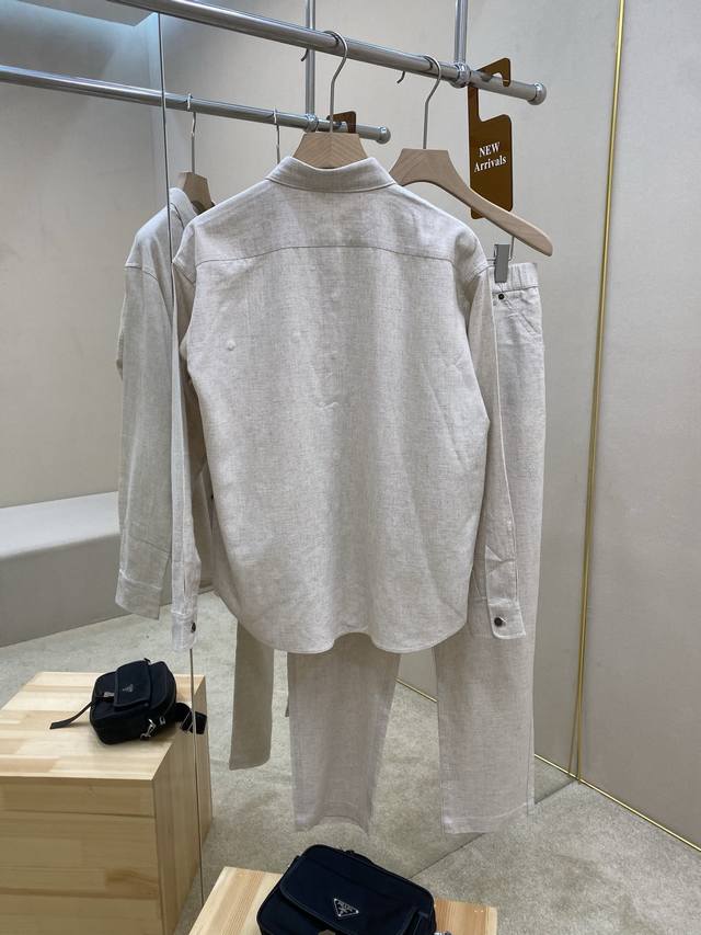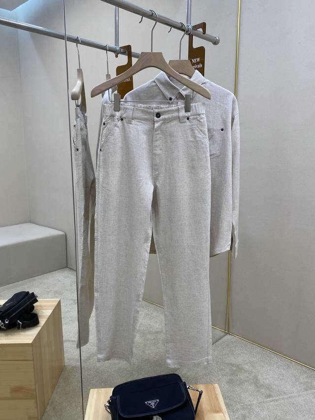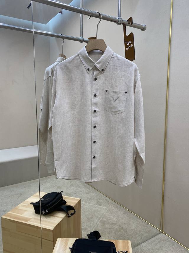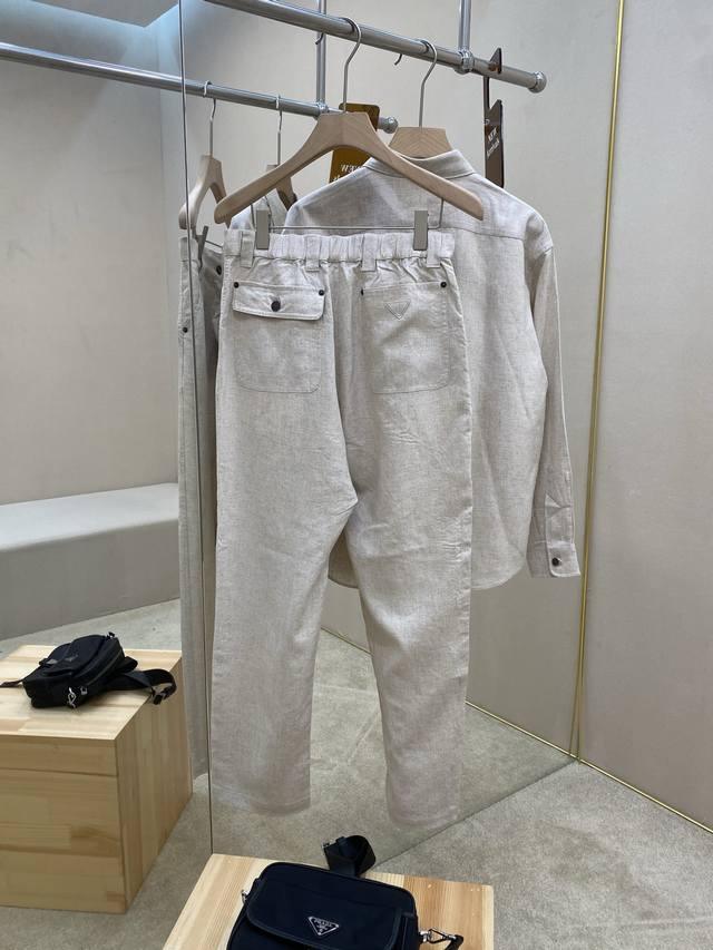 is featuring the Prade25Ss new fabric triangle micro-label suit, a 70% Tencel, 30% linen set. This shirt and trousers are made from 70% Tencel, 30% linen fabric, a 1:1 original design. The shirt is soft and delicate, with a classic fabric triangle micro-label on the chest and copper-colored metal button closure. The trousers feature a classic five-pocket design with a zipper closure and a triangle micro-label on the back pocket. The novel and unique style makes you more comfortable and is the perfect choice for crisp summer clothing. A complete set will enhance your temperament, highly recommended! Top and trouser sizes: ML Xl 2Xl 3Xl