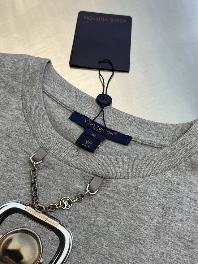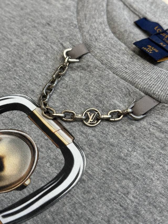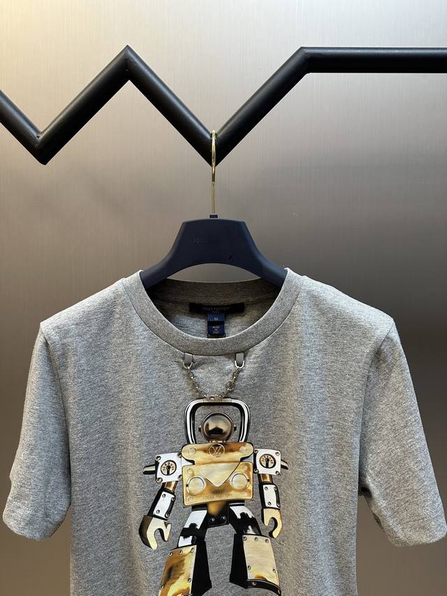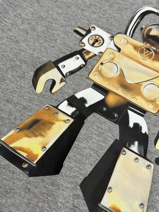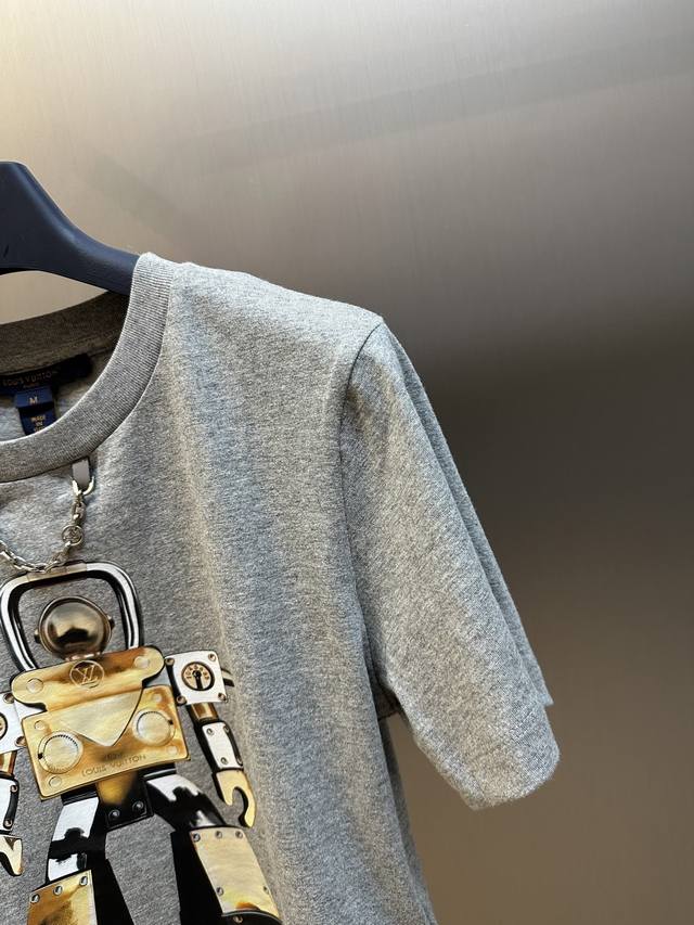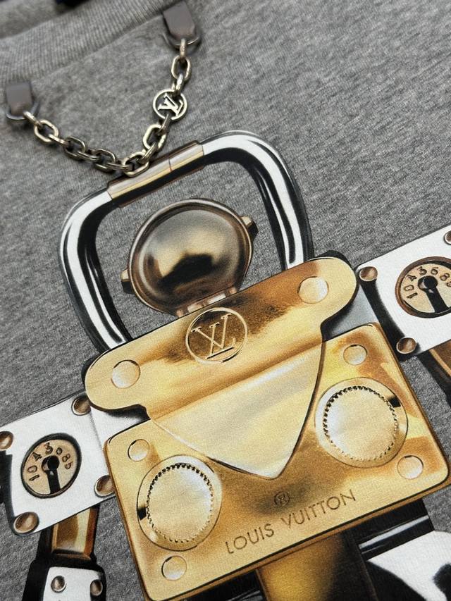 Lv Robot Print Cropped Top. Crafted from soft cotton knit, this cropped top adds a touch of modern flair to everyday looks. The robot motif is incorporated into the metal elements of the Petite Malle handbag, and an Lv chain accents the collar, adding a touch of brand identity. Sizes: S M L