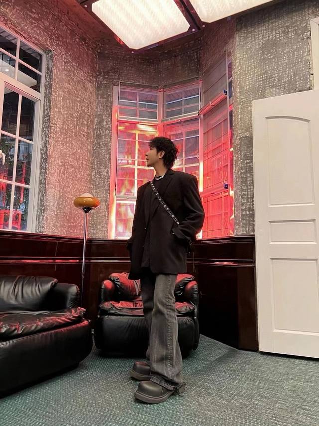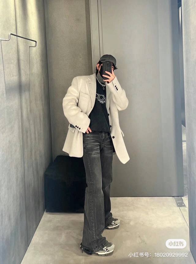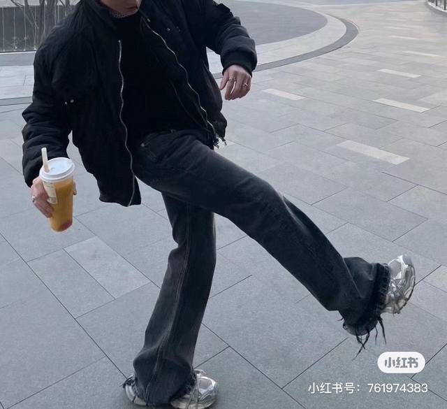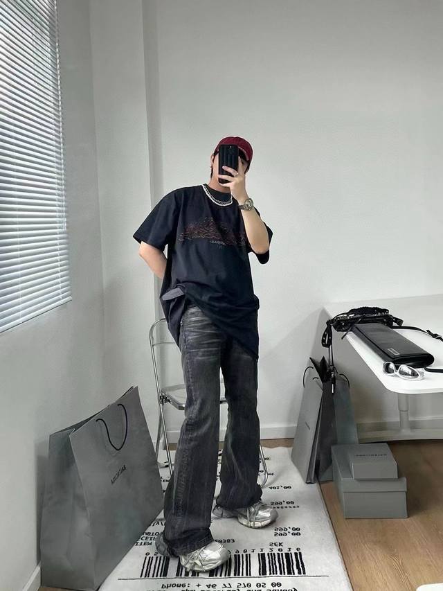 Model Image Blcg Balenciaga 24Fw Washed Flared Distressed Jeans. Demna Flared Trousers 25Ss. New washed, distressed, flared jeans. Three-dimensional hair creases. Perfect for any shoe. Versatile. Lost Videotape. Bull King of the Year. Damaged heels for a natural leg-stretching effect. Stiff, stylish fabric. A more relaxed, layered feel compared to denim. Washed, flared silhouette. Sizes: S-Xl.