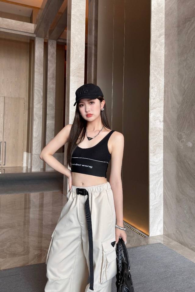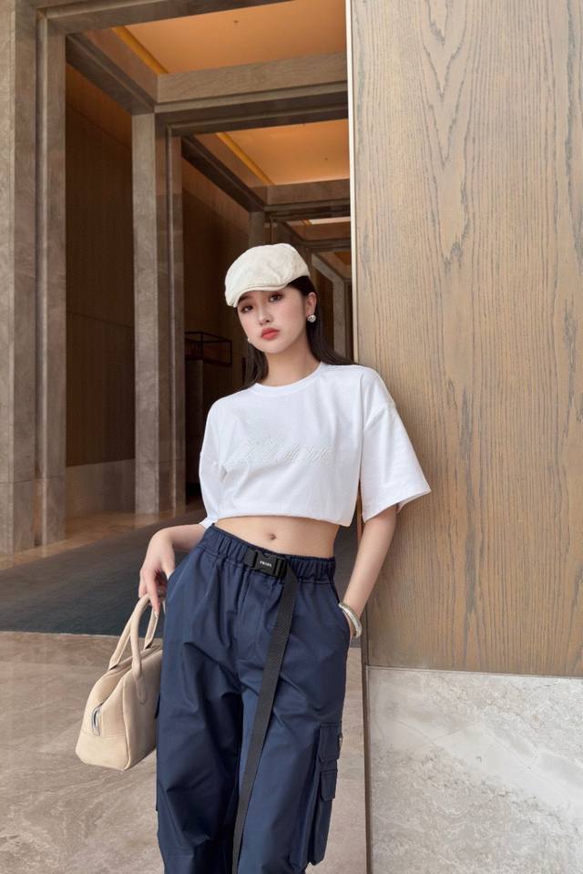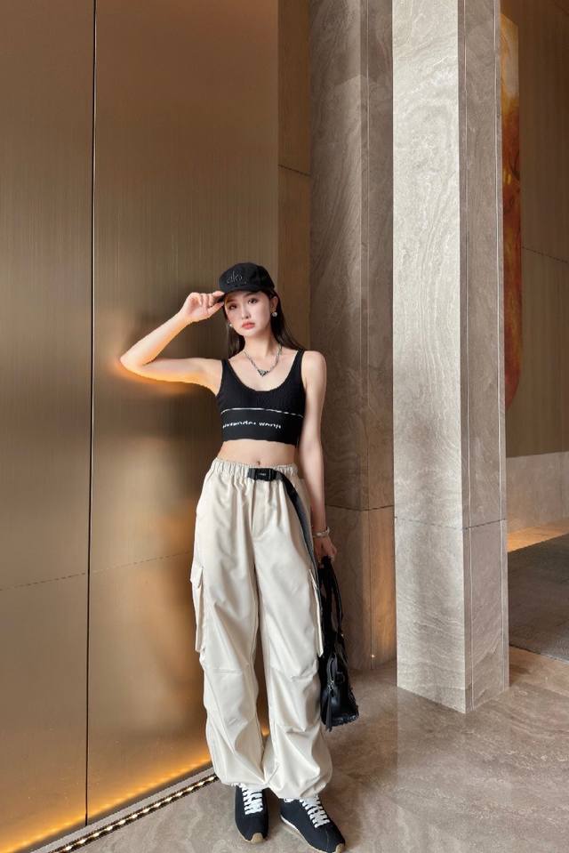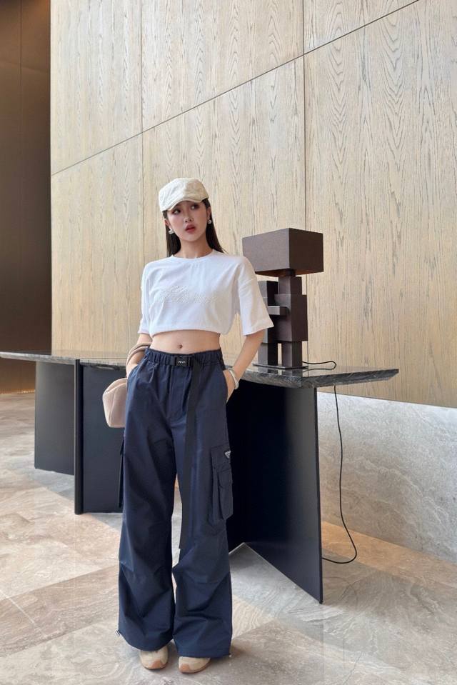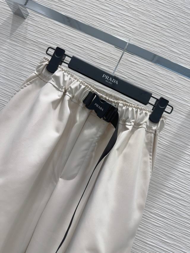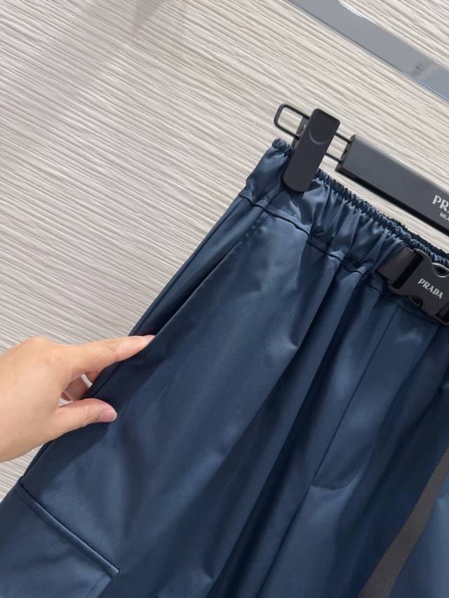 The snap belt at the waist adjusts the tightness. The three-dimensional large-capacity trouser pockets on both sides enhance the workwear feel and are embellished with a triangular metal logo to add a sense of layering~