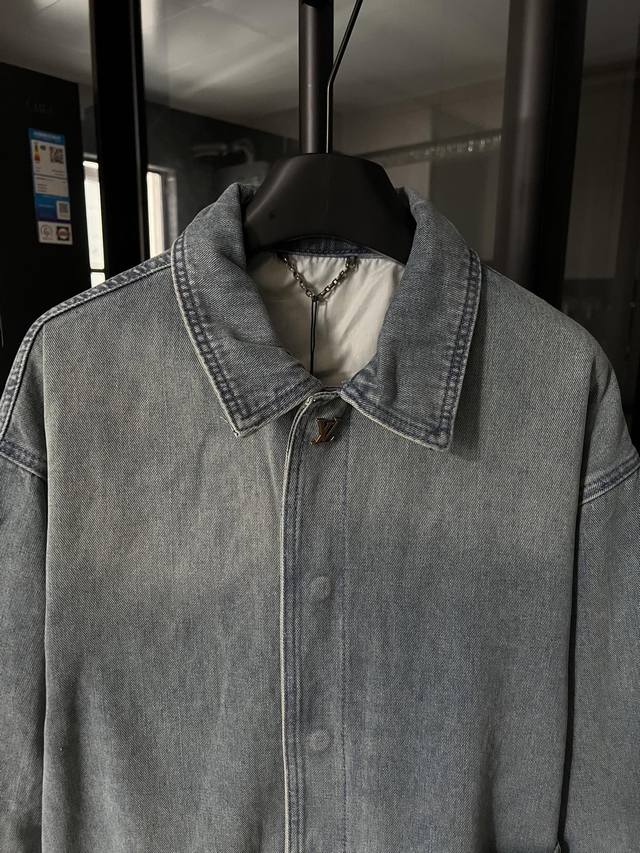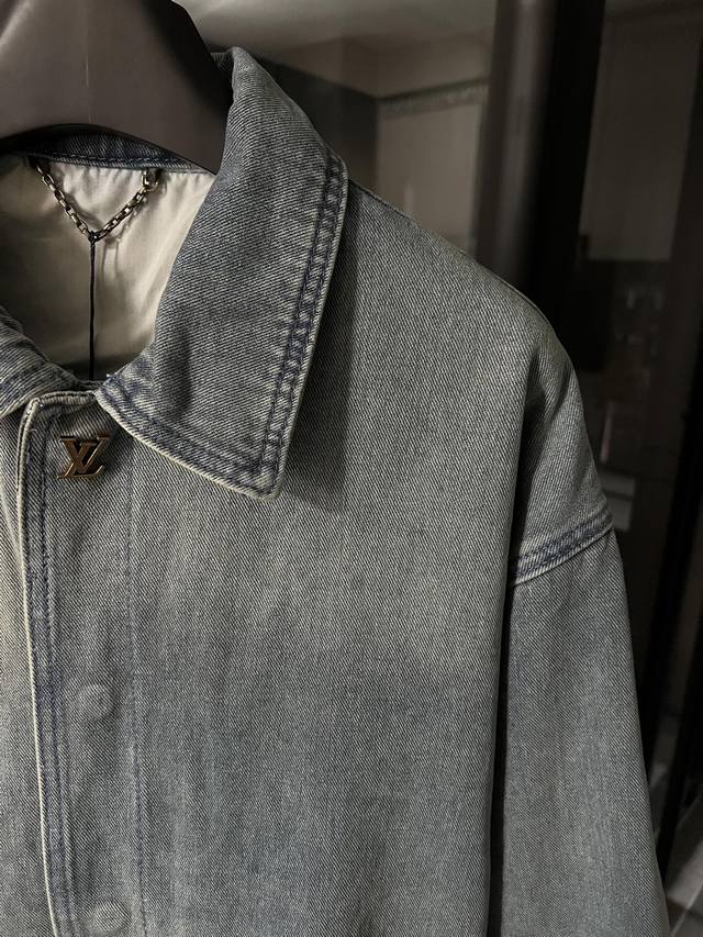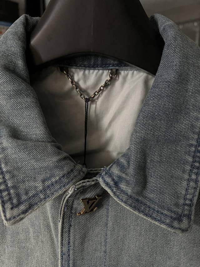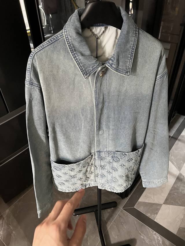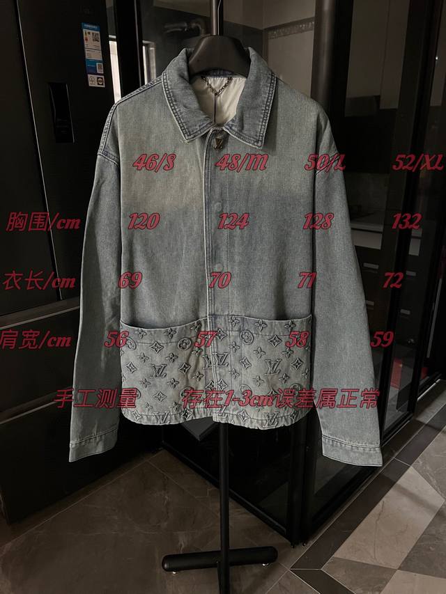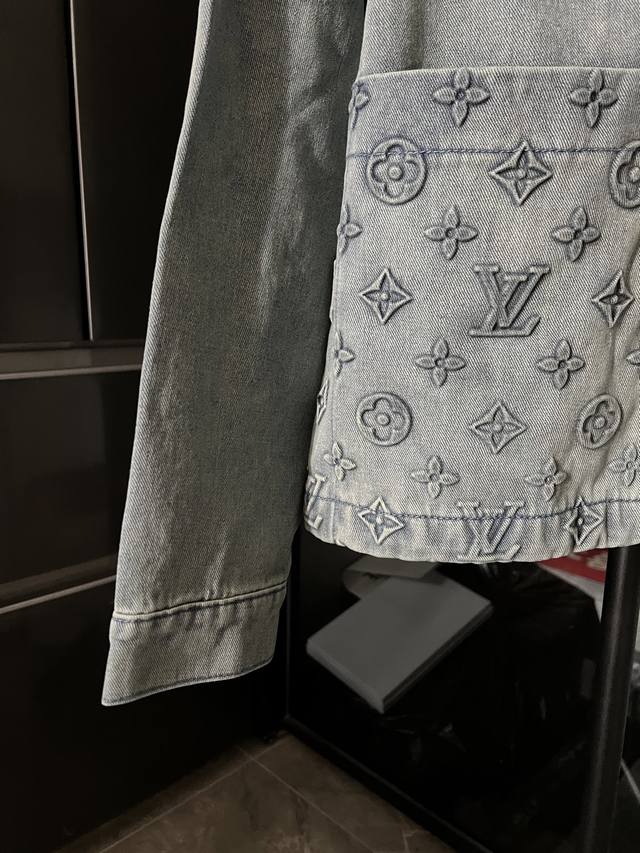 Next Day 1V Louis 25Fw embossed new blue workwear denim jacket, first released. Wang Hedi and Huang Minghao both wear the same style, and influencers are all wearing it. Made from 7x7 combed Siro-spun yarn in a thickened 480g twill denim, it features a concealed placket with a molded logo snap button. The front panel incorporates a Monogram-inspired pocket into the casual workwear silhouette. The jacquard details are perfectly aligned, and the embossed pattern is clearly visible. Five sets of aluminum molds are used for both embossing areas. The embossing on each side of the front panel is done using a mold for each size. After high-temperature pressing, each pattern is manually filled with silicone to prevent dents. The wash process utilizes a combination of heavy fermentation, frying, and spraying. It features a classic denim lapel design and a straight hem. All hardware and accessories are custom-made to match the pattern, achieving a distressed bronze finish. The lining also features custom patches for a consistent look. Size