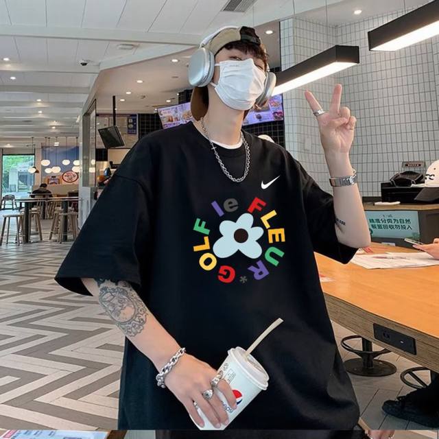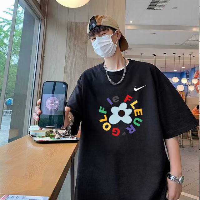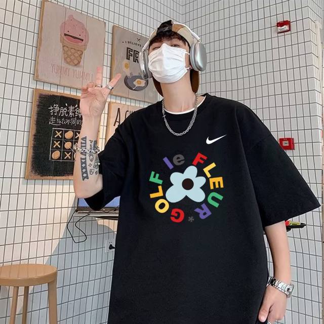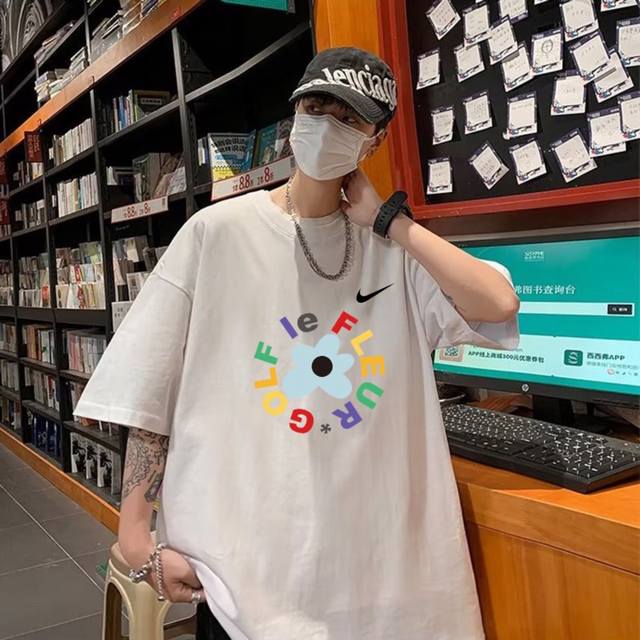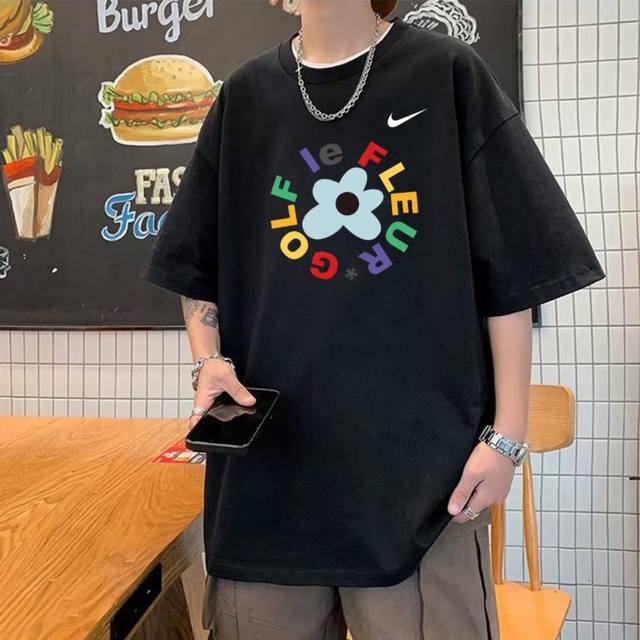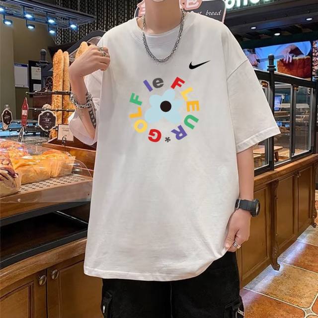Nike's new summer collection features a round-neck, short-sleeved cotton T-shirt with a red flower motif. Made from 260g combed cotton, it's incredibly textured, breathable, and comfortable. The custom-threaded neckline and red flower motif on the chest complement the colorful graffiti design, adding a touch of personality. This unisex, loose-fitting, versatile design is perfect for both men and women, and perfect for couples. Colors: Black, White, Sizes: M-3Xl. See Image 9 for details.
