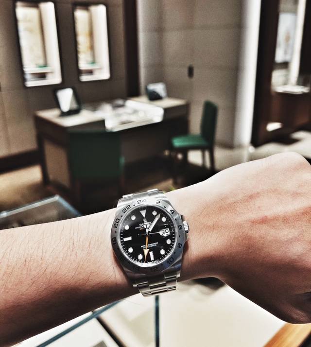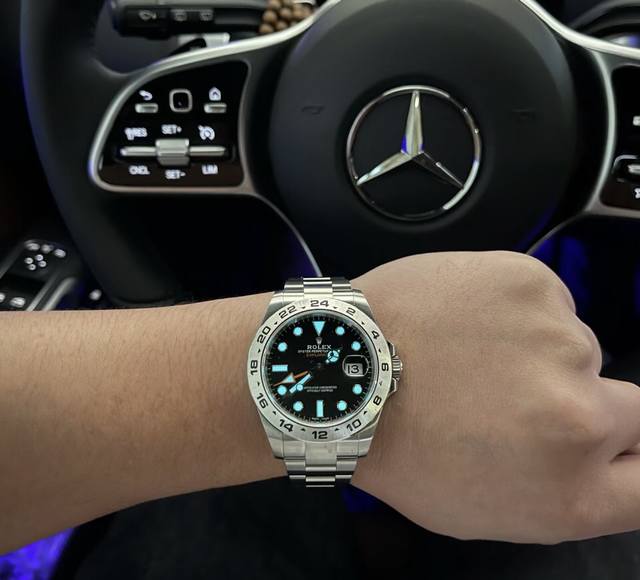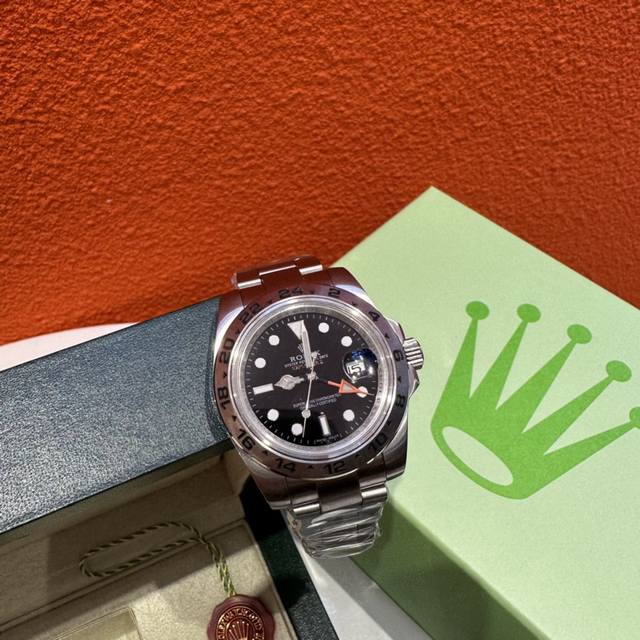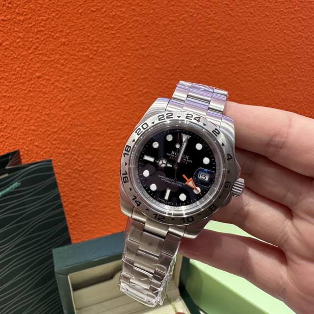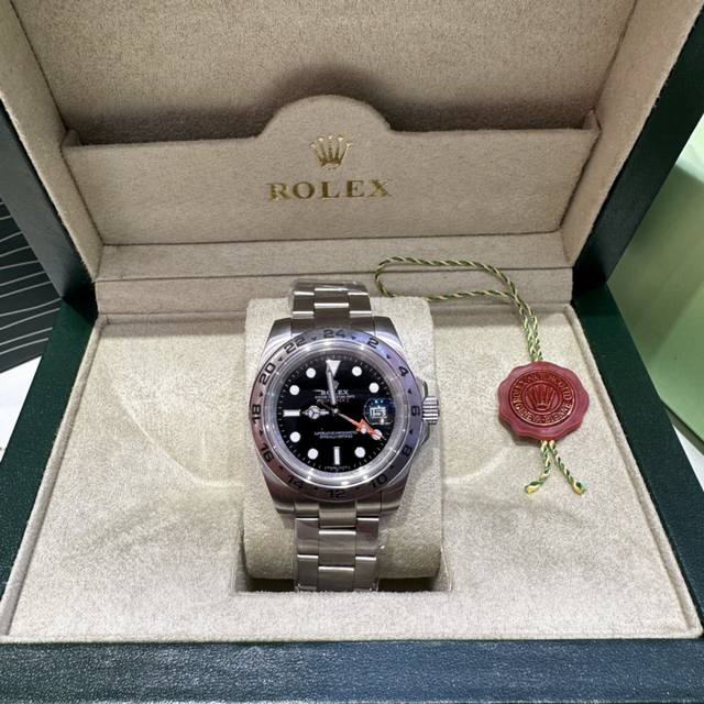 Rolex Explorer II, a luxury couple's watch with a white dial and Oystersteel automatic mechanism, is presented on an Oyster bracelet and features a distinctive white-and-black dial. The arrow-shaped 24-hour hand and hour markers are coated with Chromalight luminescent material for exceptional luminescence. The highly legible dial, durable Oystersteel, and water-resistant construction demonstrate a watch designed specifically for conquering the polar regions. The glass features the Rolex crown seal at 6 o'clock, and the inner bezel is engraved with the Rolex logo. The dial is 42mm, the case is made of sapphire crystal, and the strap is made of 904L stainless steel with an original folding clasp. It comes with a gift box, a handbag, and an invoice. A special screwdriver for removing the strap is available; please note if you require one.