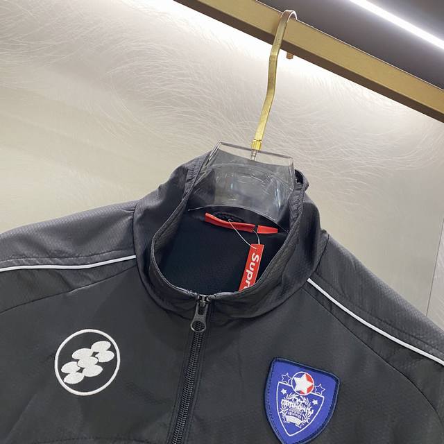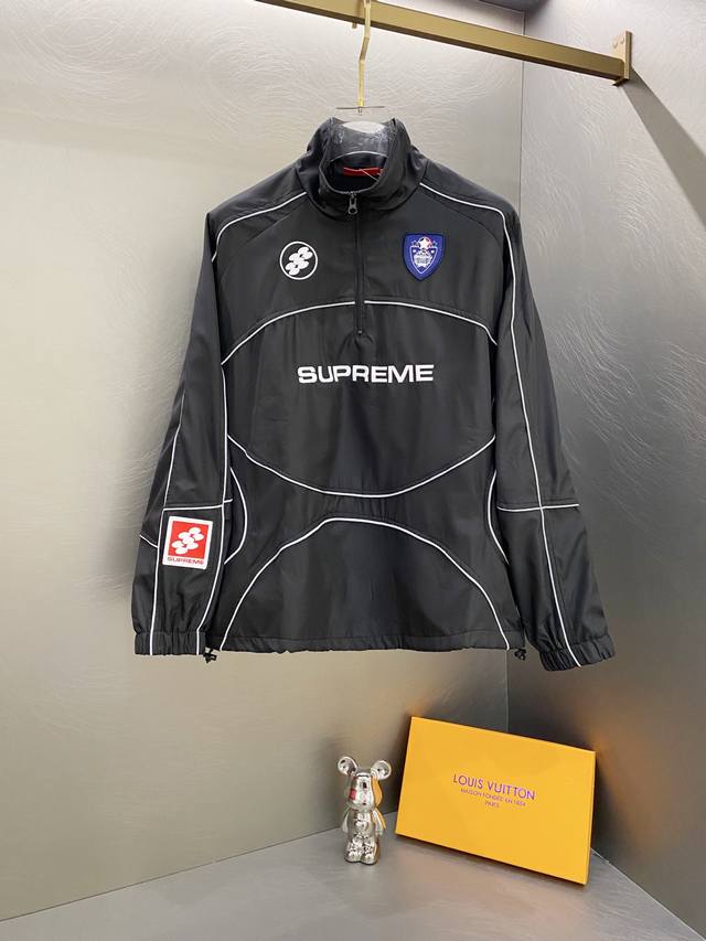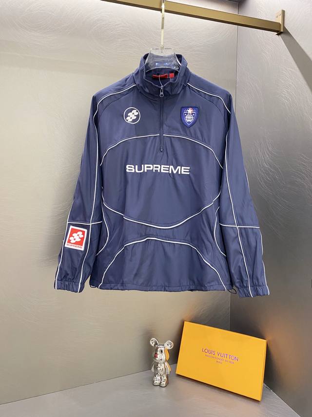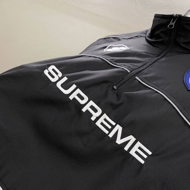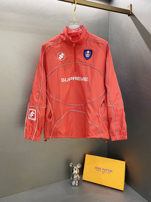 Supreme Fw24 Week11 Reflective Piping Pullover 3M Reflective Strip Half-Zip Pullover Jacket, Unisex. Custom-made soccer mesh fabric, original imported 3M reflective strips, original YKK zipper. Stunning fit. Features side pockets, adjustable hem, tightly embroidered chest with thousands of stitches, custom-made and delicate mesh lining matching the original. Top-notch details and accessories. Colors: Navy, Red, Black. Sizes: S, M, L, XL.