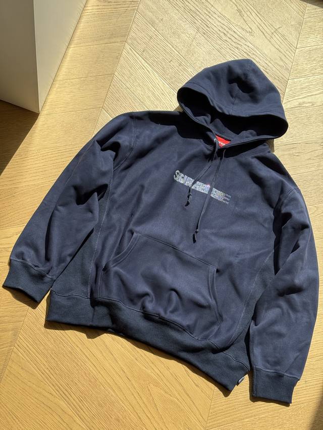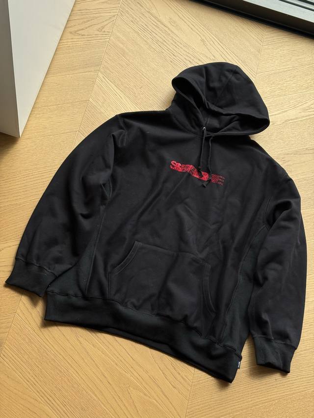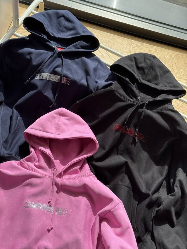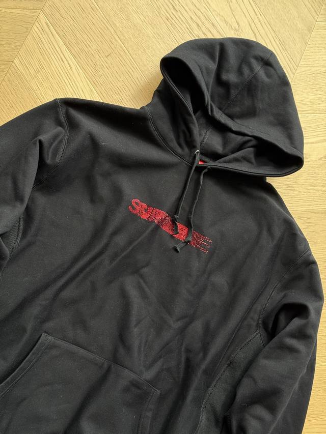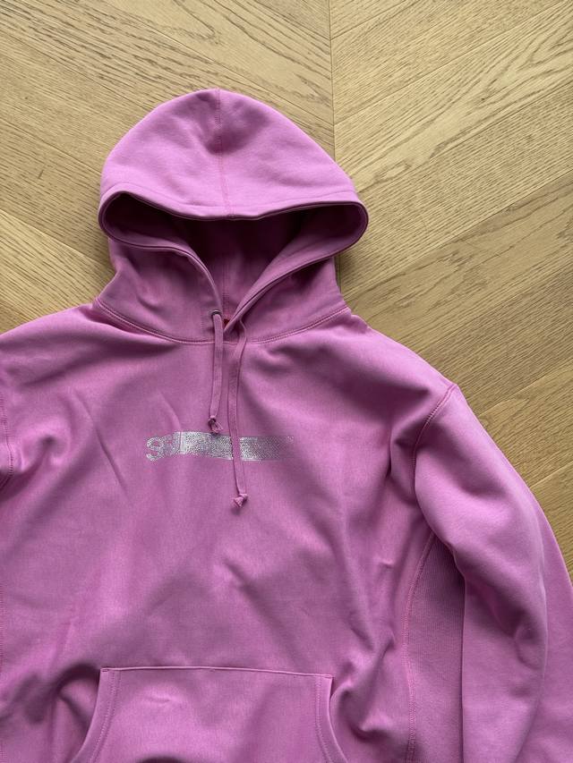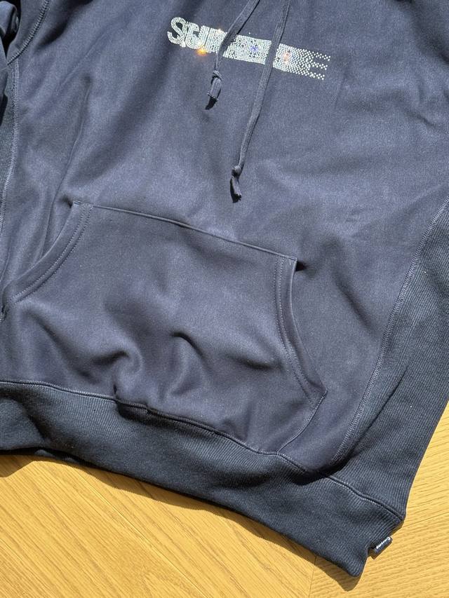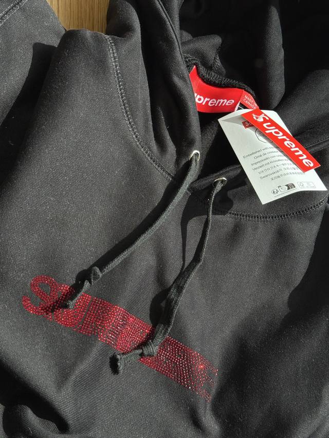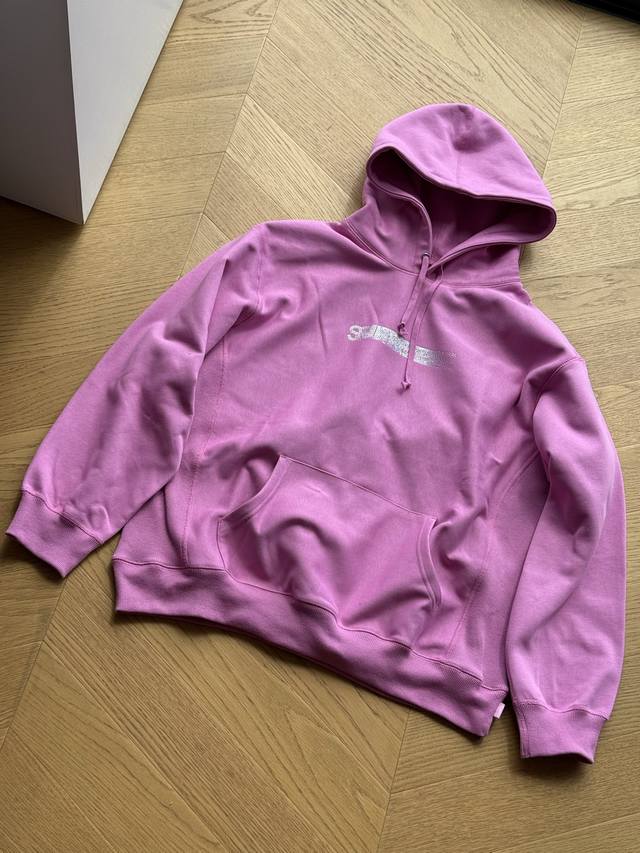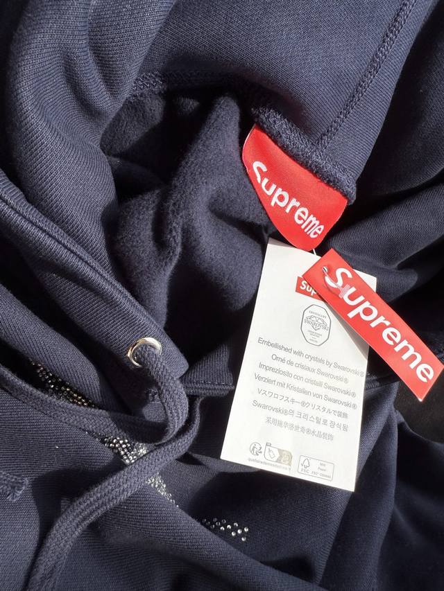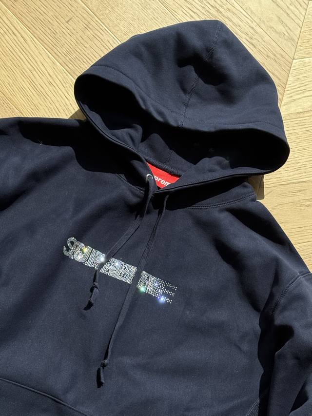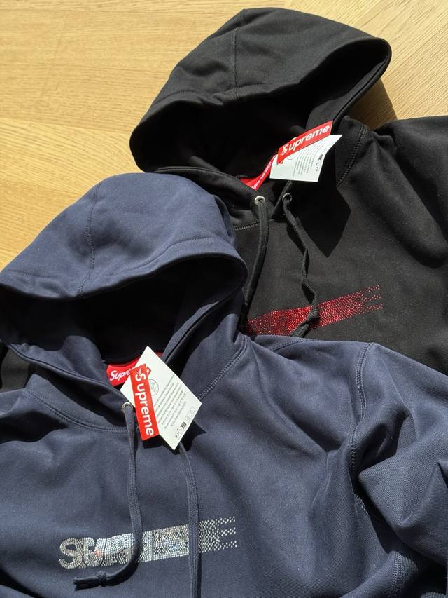 Supreme X Swarovski collaboration Fw25 Motion Logo Hooded Sweatshirt, unisex, rhinestone dynamic logo pocket, size S-XL. Available on Dewu for 3800 RMB. Original high-weight pure cotton fleece fabric, hand-reinforced rhinestone logo on the chest, top-quality original, distinguishing it from common goods. Complete original label and accessories. Size chart: Size S fits 175cm/120cm. S: Chest 124cm, Length 68cm, Shoulder 55cm; M: Chest 128cm, Length 71cm, Shoulder 57cm; L: Chest 132cm, Length 74cm, Shoulder 59cm; XL: Chest 136cm, Length 76cm, Shoulder 61cm.