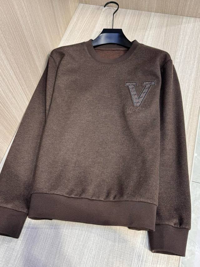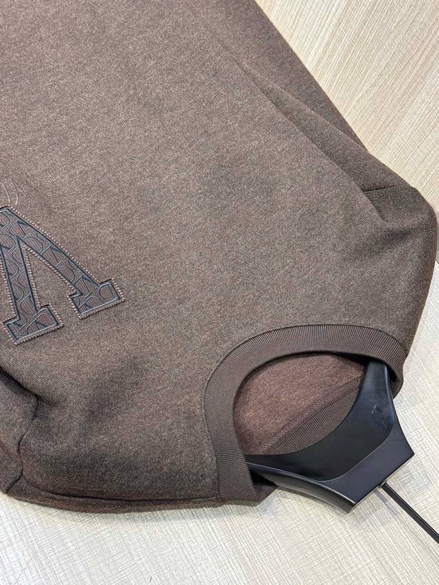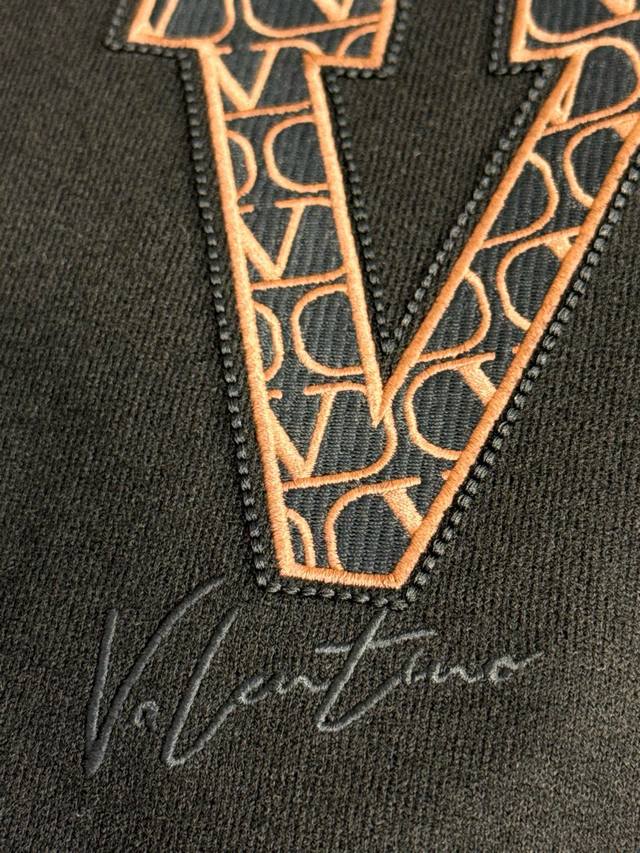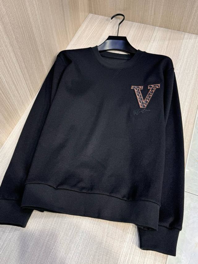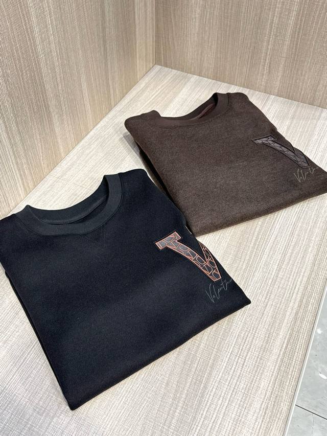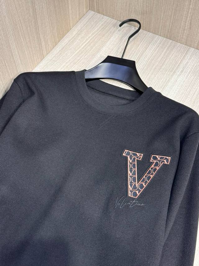 Valentino's latest Fall/Winter 2025 men's cashmere crewneck sweatshirt with classic V-embroidered logo. This classic pullover style features a bold and refined "V" logo on the chest. Crafted with high-end, 3D arch-bridge embroidery, the pattern creates a rich, sculpted look, creating a striking, and highly recognizable brand identity. While seemingly simple and understated, this sweatshirt effortlessly exudes a sense of sophistication and powerful presence. Wear it as a regular outerwear piece in spring and autumn, or layer it with a coat or down jacket in winter, for a strikingly stylish look that's undeniably stylish! Fabric: Custom-supplied, special cashmere composite fabric with a Brb wool texture for superior warmth. It combines the plush feel of a sweater with the next-to-skin comfort of a sweatshirt. It feels soft yet firm, with excellent elasticity for a natural fit. The fine, delicate texture and high density ensure it retains its color and shape even after repeated wear and washing.