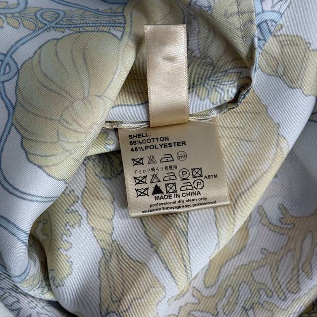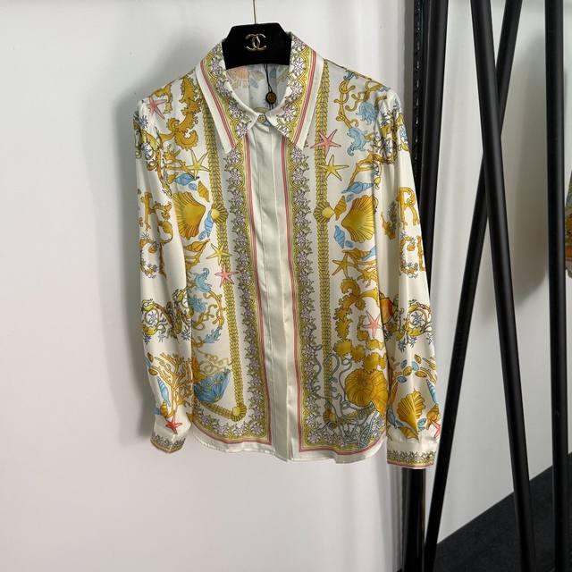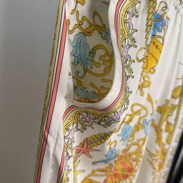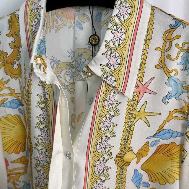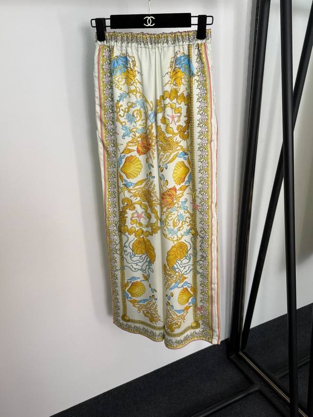 Style No. 20254797 Versac's latest home-style casual suit, seafood shell print long-sleeved shirt and high-waisted wide-leg pants, blue, red, gold, S-Xl, M sizes; shoulder width 38, chest 98, sleeve length 61, length 67; waist 68 elastic, length 105, weight: 0.310Kg.