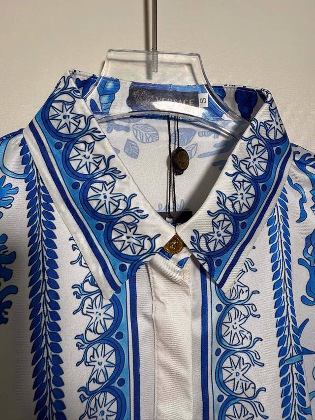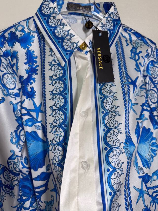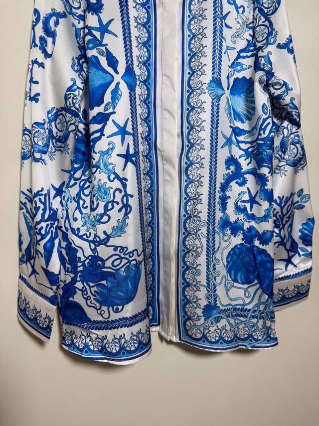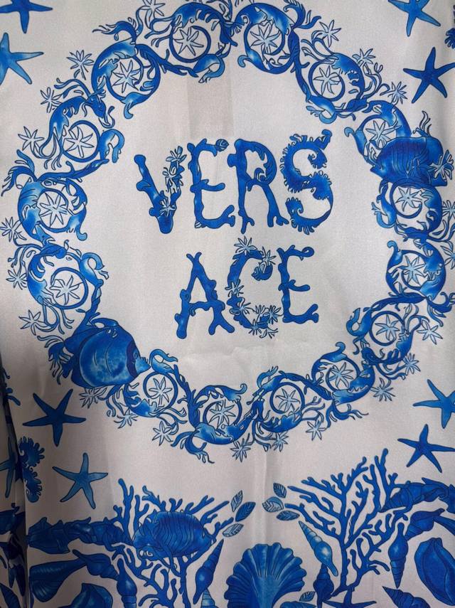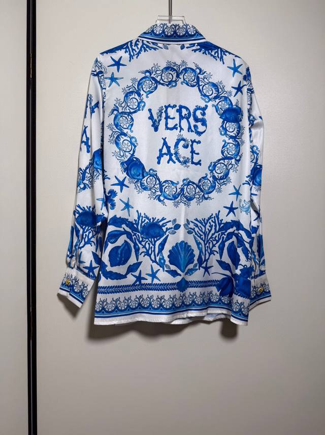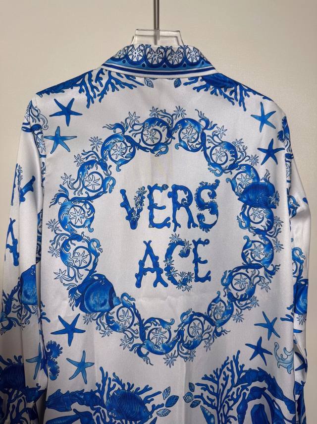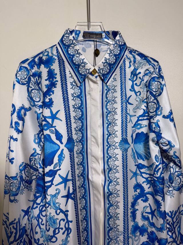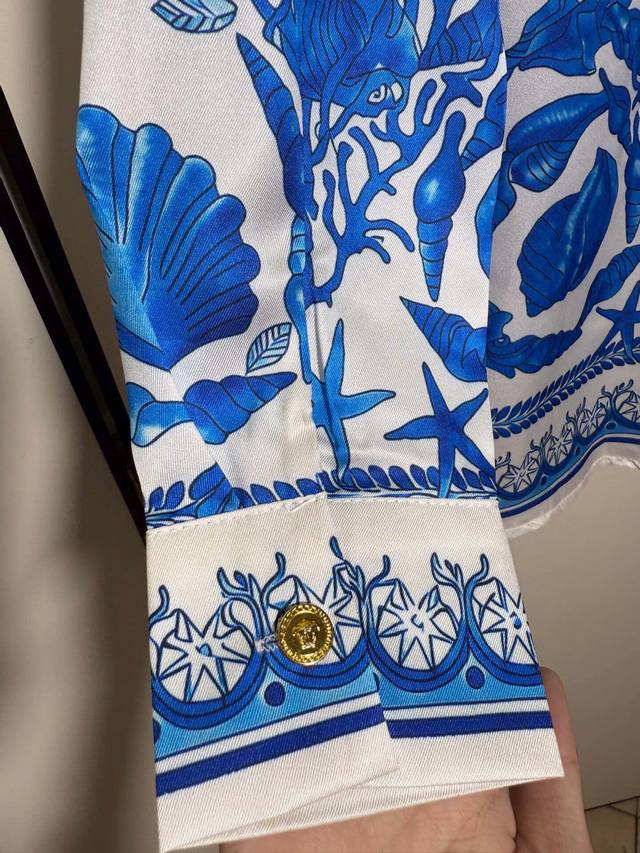 Versace Versace women's new blue bottom starfish Baroque ocean world shell starfish conch blue bottom starfish print lapel long sleeve shirt. Smlxl