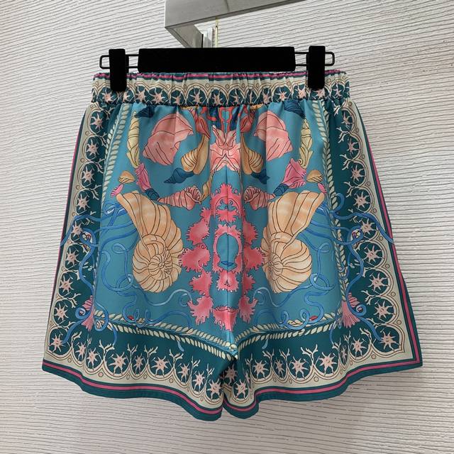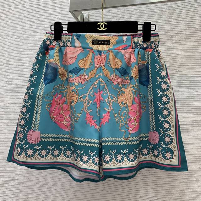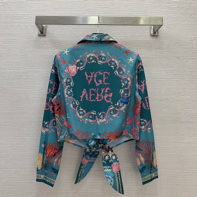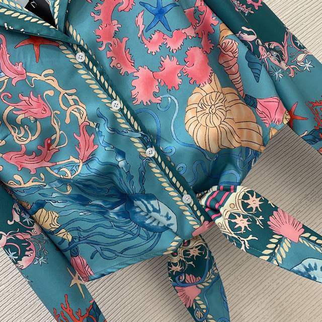 Versac's newest starfish and conch shell print two-piece suit for a stylish holiday look! Knotted tie, small lapel, cropped long-sleeved shirt, sunscreen shirt with a small label, elastic waist, and loose wide-leg shorts! Size M: Shoulders 38cm, Chest 98cm, Sleeves 57cm, Length 49cm; Waist 68cm, elasticated at the back, Length 39cm.