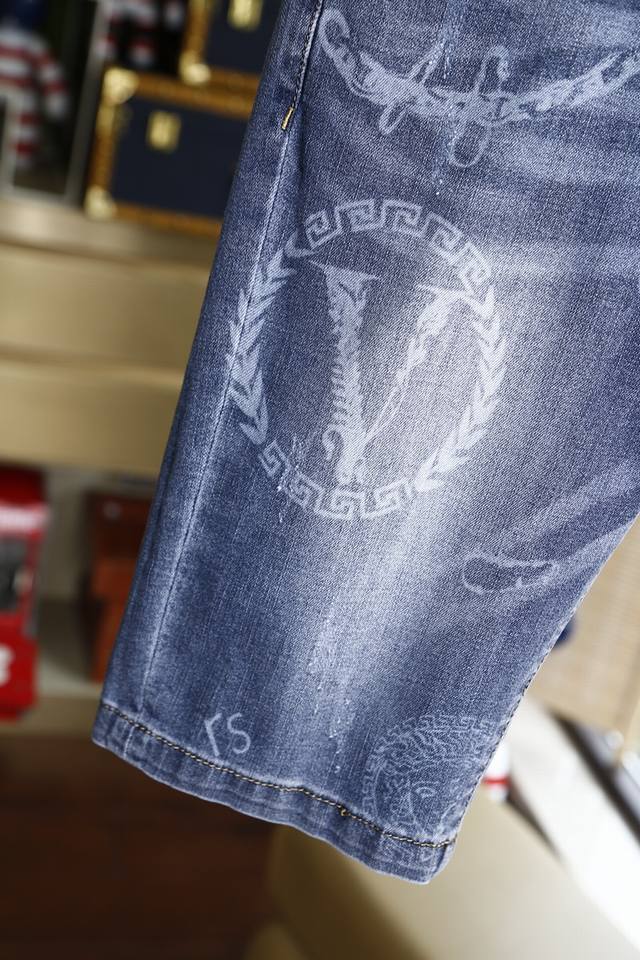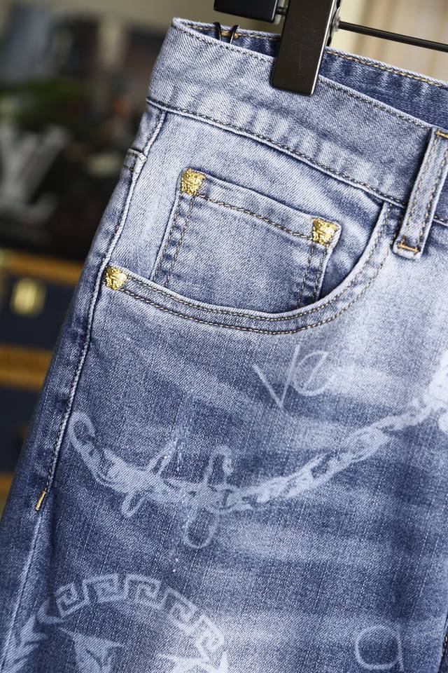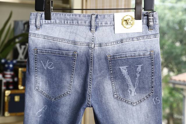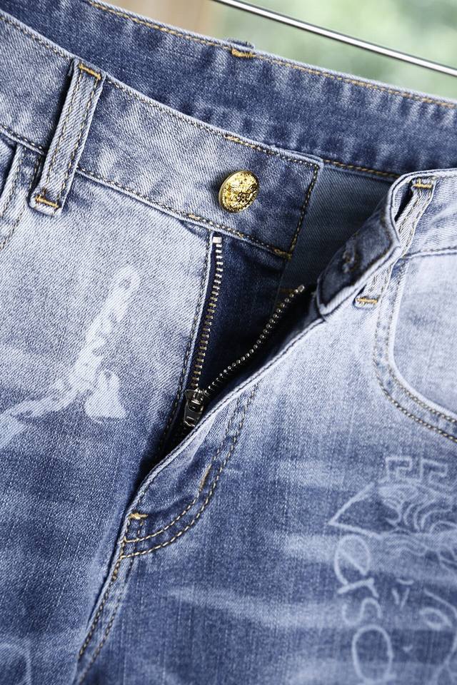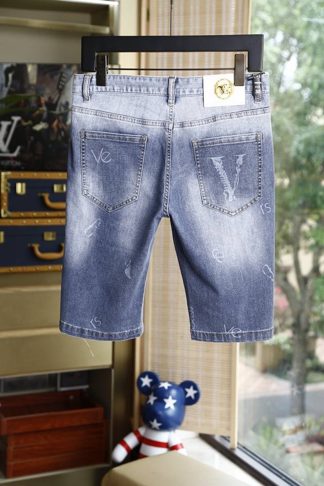 Versace 116880-G32 new spring/summer jeans shorts. Made of imported Turkish cotton denim, the fabric boasts a vibrant color and a slim fit. The slightly stretchy fabric is versatile and maintains its shape and color even after washing. The color becomes more natural over time, creating a truly stunning look. Elegant and refined cuts, the design is constantly innovative while maintaining a refined and elegant style. This stylish, alluring silhouette features a slim straight leg. Available in sizes 30-38, with no 35 or 37 available. Next-day pickup available.