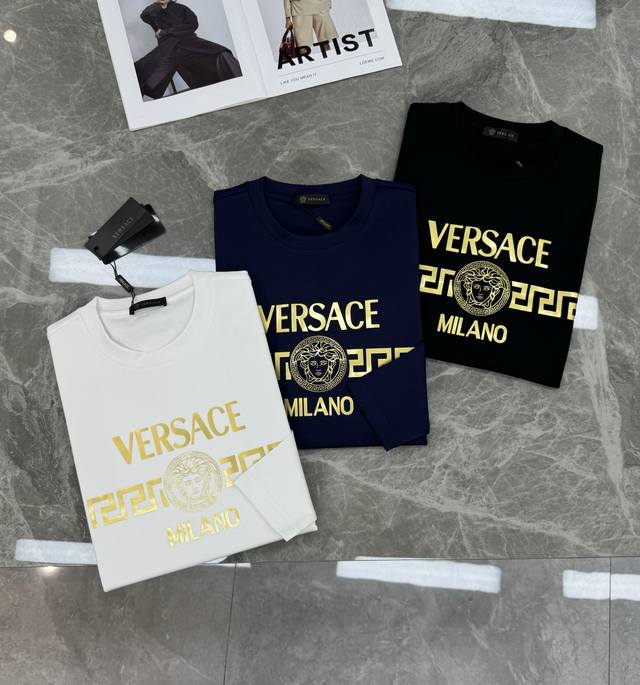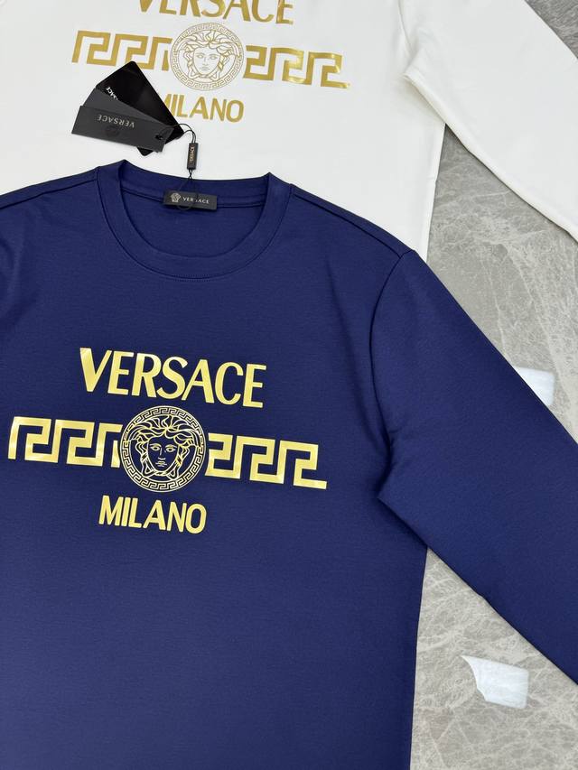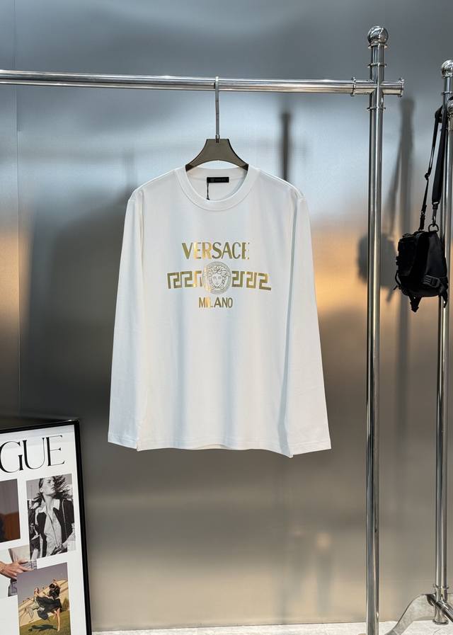 Versace Greca Print Modal Long-Sleeve T-Shirt, a new Vasa arrival. Available in black, navy, and white. Made of soft G Modal cotton fabric, comfortable and breathable. Features a Greek key pattern, Medusa head, and "Versace Milano" lettering on the chest, exuding brand prestige. The slim fit is perfect for everyday wear or casual occasions, great worn alone or as a base layer, and ideal for autumn and winter! All tags are included! Sizes: M-3XL (slim fit), S and 4XL are available for custom orders. (175cm, 140kg, L recommended).