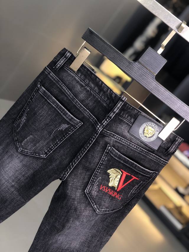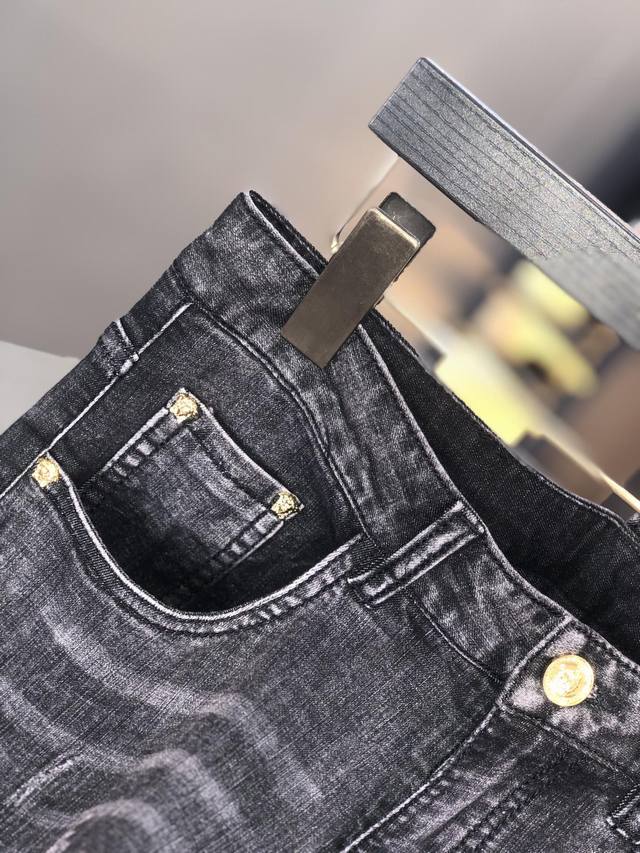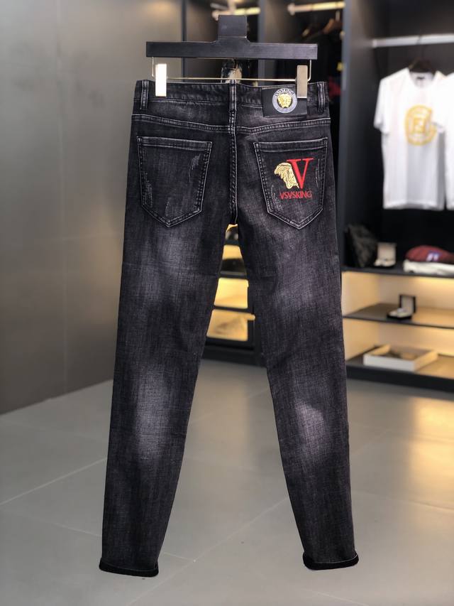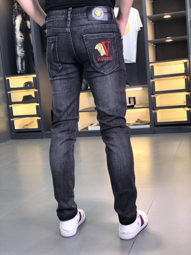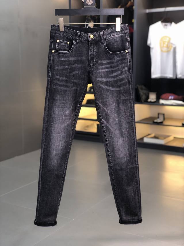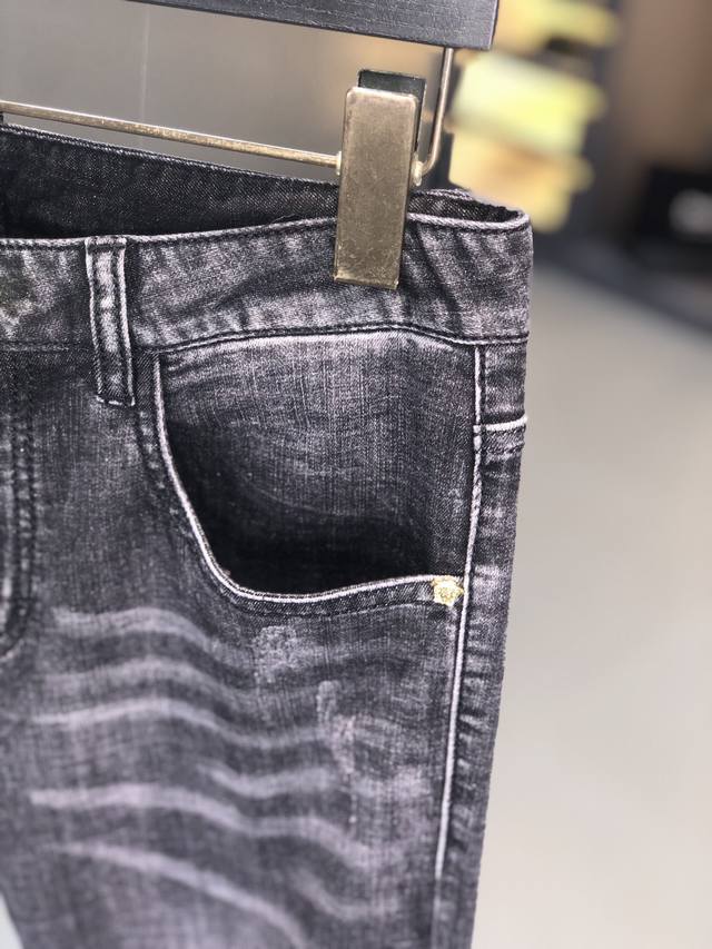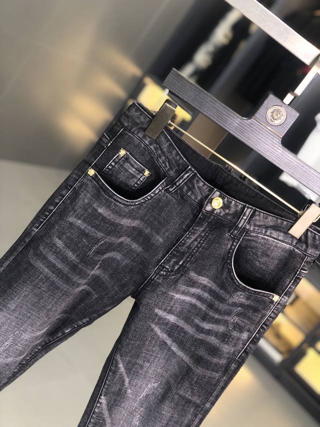 Versace. New spring/summer men's jeans in slightly stretchy fabric, exclusively available on the official website. Stylish, elegant, minimalist, and versatile, the collection features a natural yeast wash process. Made from imported heavyweight denim with exclusive hardware and genuine leather patches. Exquisite stitching is a must-have. Sizes: 29-36