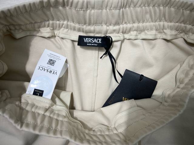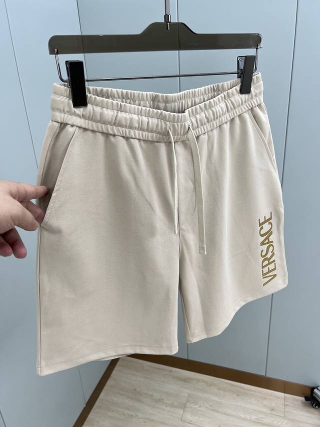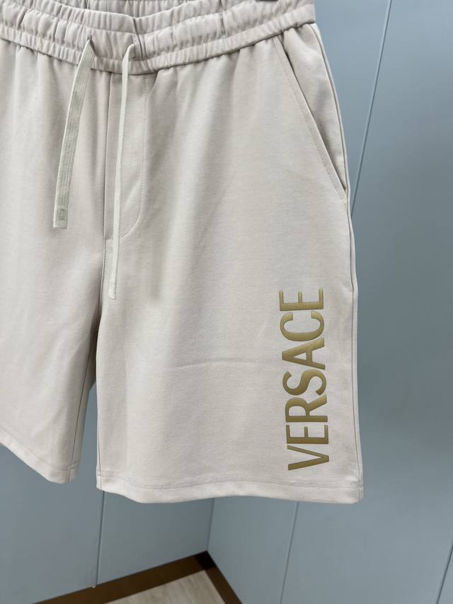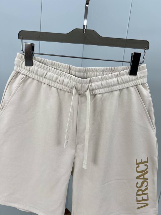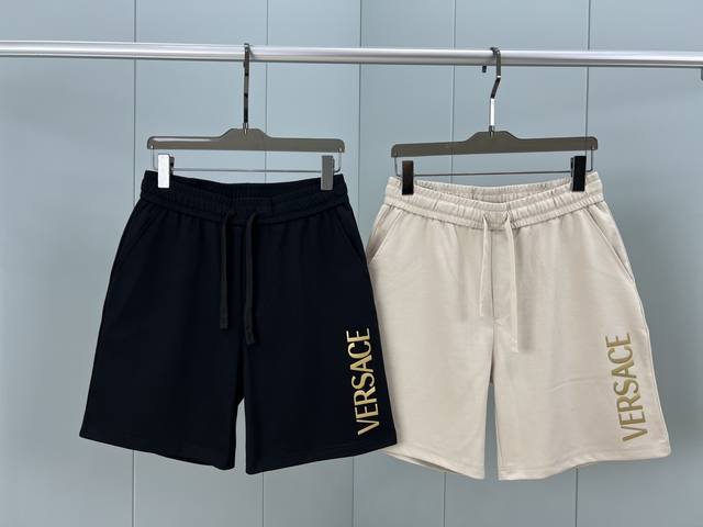 Versace Summer New Arrival: 3D Logo Printed Shorts with Ice-Oxygen Cotton Fabric. Features the brand's signature logo print on the left front, a reinterpretation of the brand's iconic design. Elastic waistband with drawstring, two side pockets, and a back patch pocket. Made with custom 240g ice-oxygen cotton fabric, offering a cool, moisture-wicking, quick-drying, crisp, and wrinkle-resistant feel. It boasts the highest 7A antibacterial rating! An essential summer shorts fabric. Available in black and light brown, sizes M-XL.