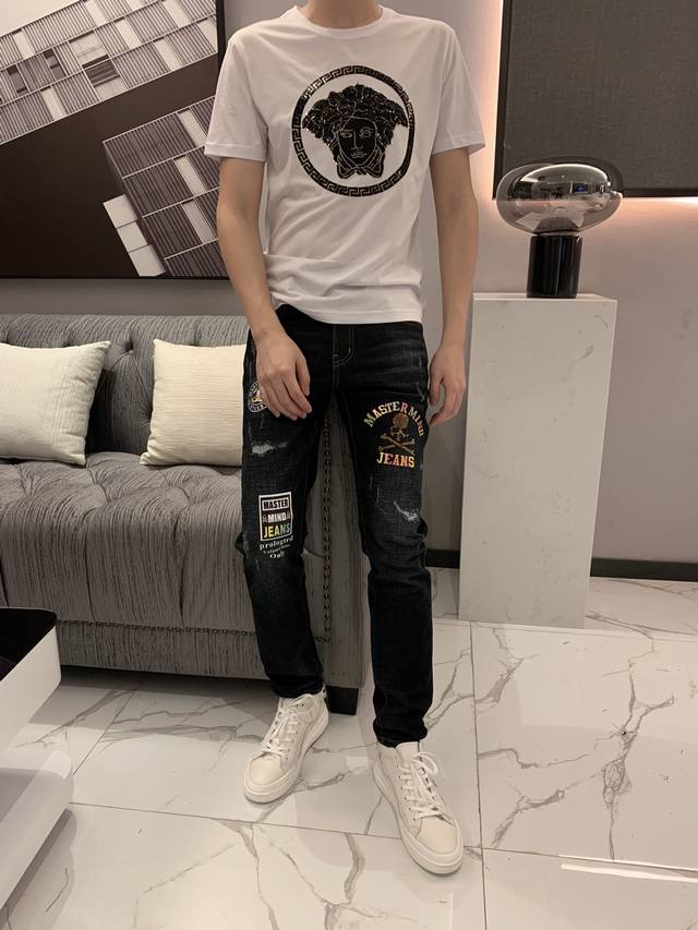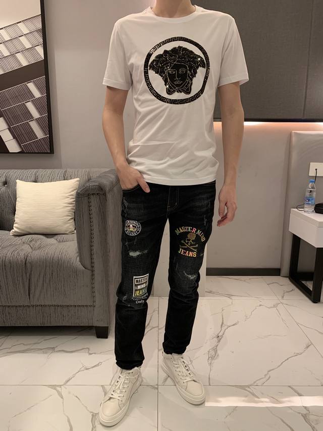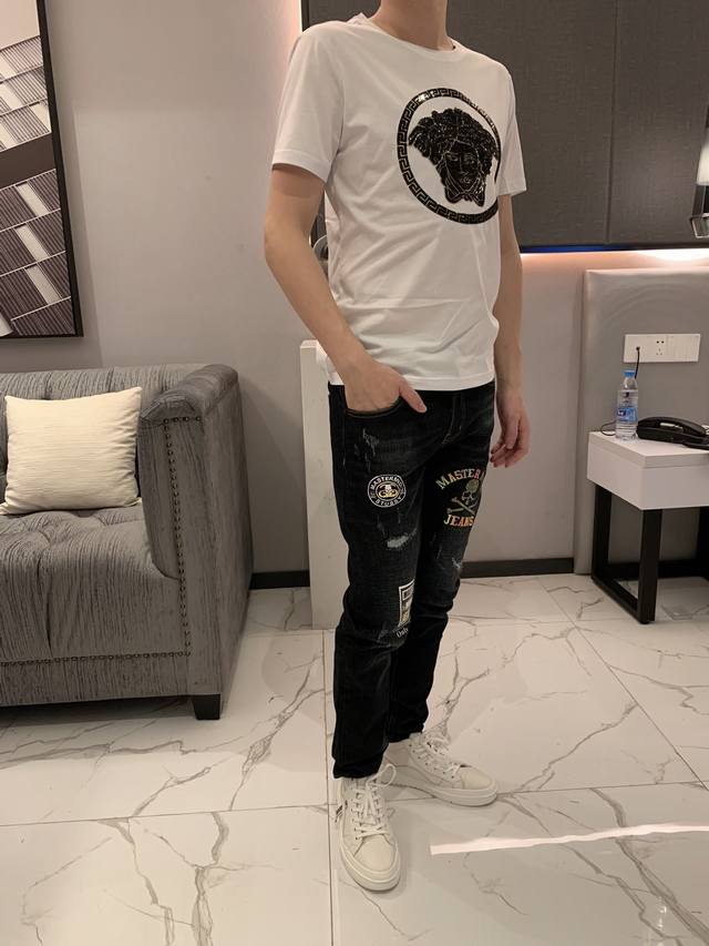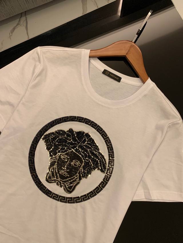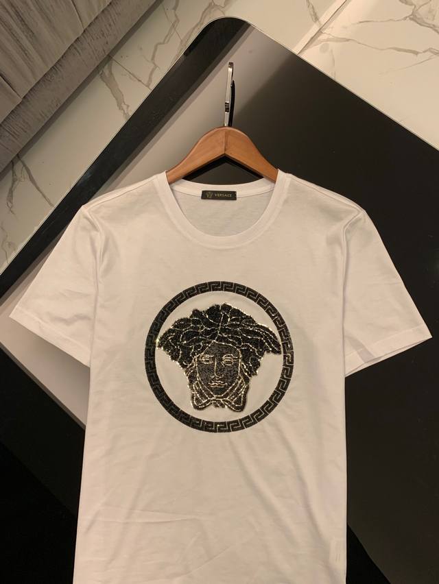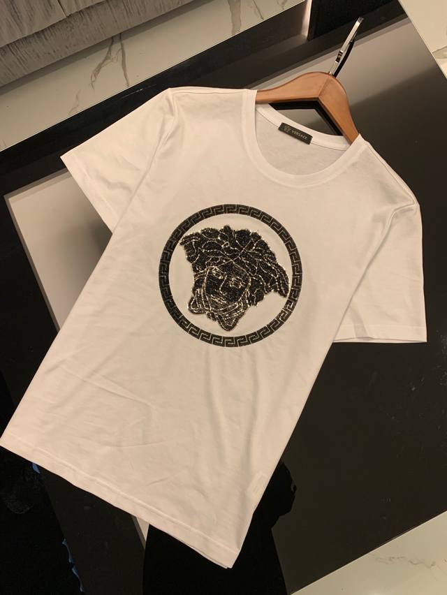 Versace Spring/Summer Newest Men's Short-Sleeve T-Shirt, Official Website Synchronized, High-End Quality, Simple and Stylish, Customized, European Imported Double Mercerized Cotton Fabric, Soft and Delicate to the Touch, Skin-Friendly and Comfortable to Wear. Features a 3D Embroidered Beaded Logo Design on the Chest. Versatile and Casual, Looks Great on, a Must-Have for Handsome and Trendy Men. Sizes: M-3XL DDD