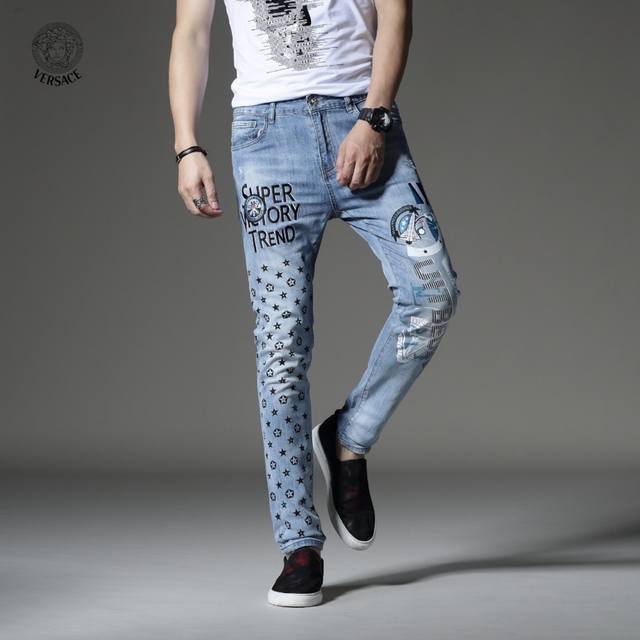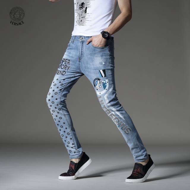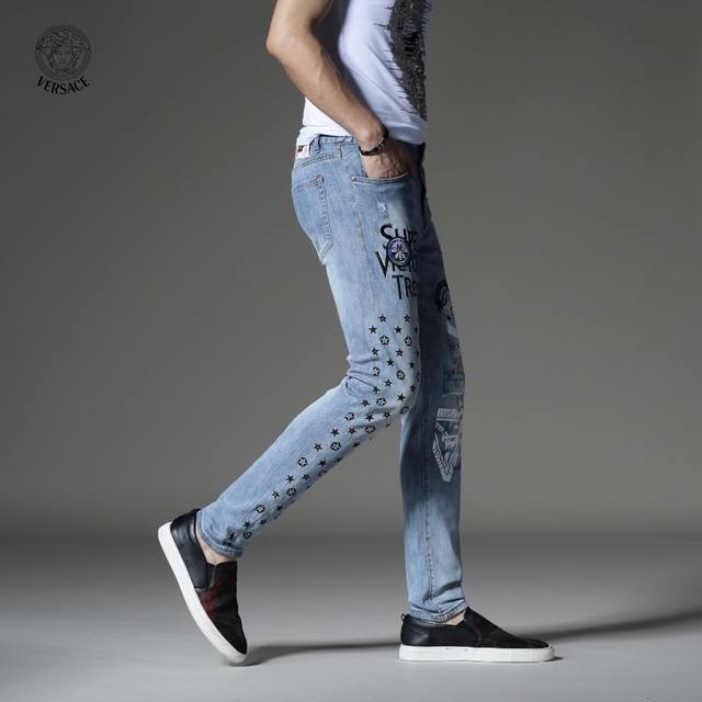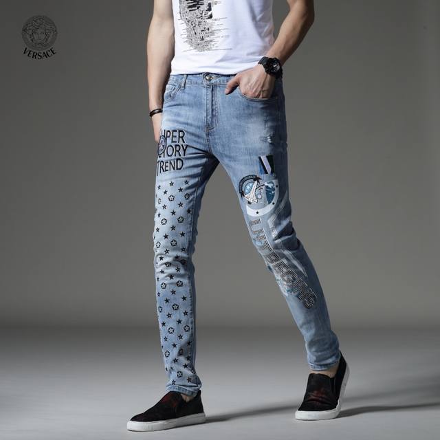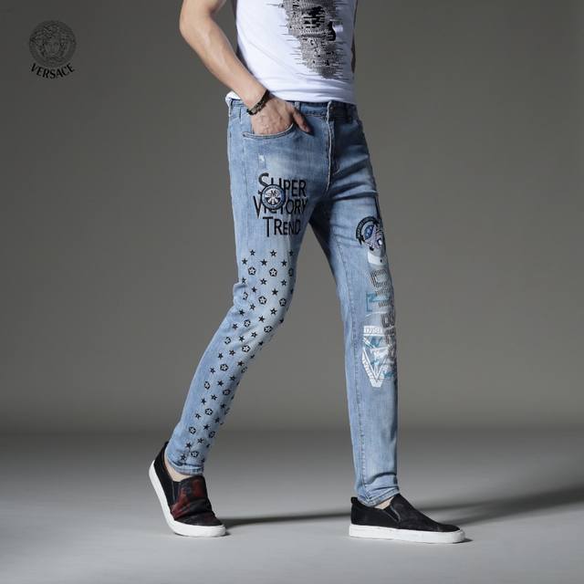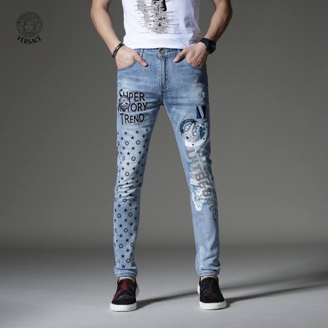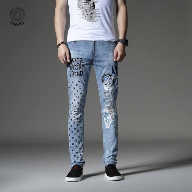 Versace's latest boutique style, first release! High-end fashion jeans that instantly transform you into an oppa! Simple and stylish three-dimensional tailoring, unique craftsmanship, original factory production; excellent fit, exuding confidence; every detail showcases perfect quality. The classic logo symbolizes the brand's highest quality. Owning these jeans marks the beginning of another fashion trend. Sizes 28-36, no size 35.