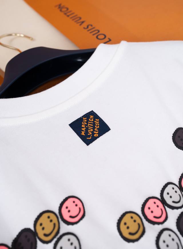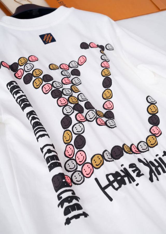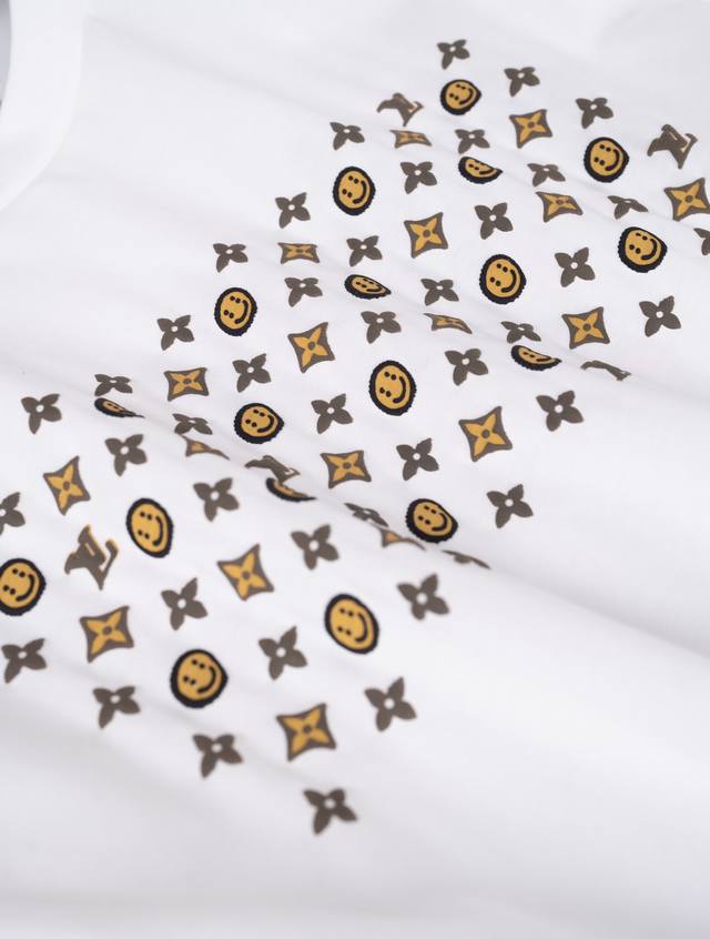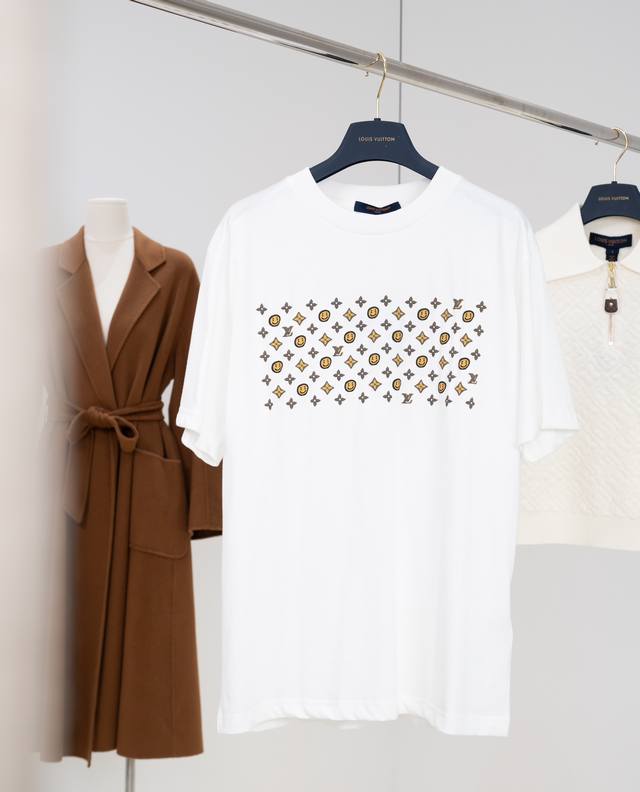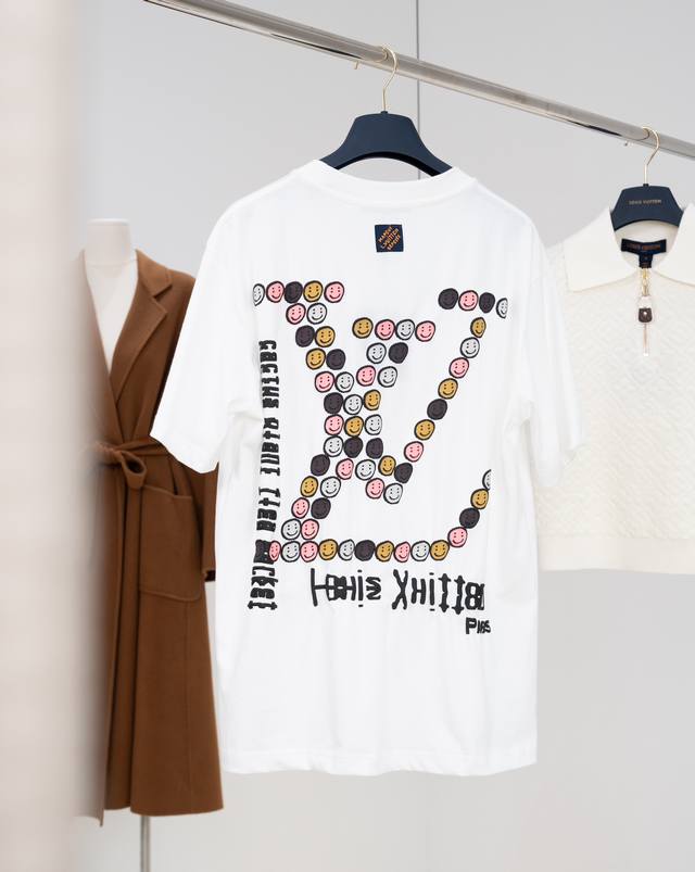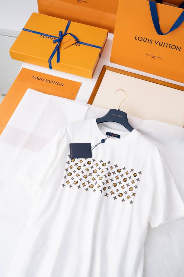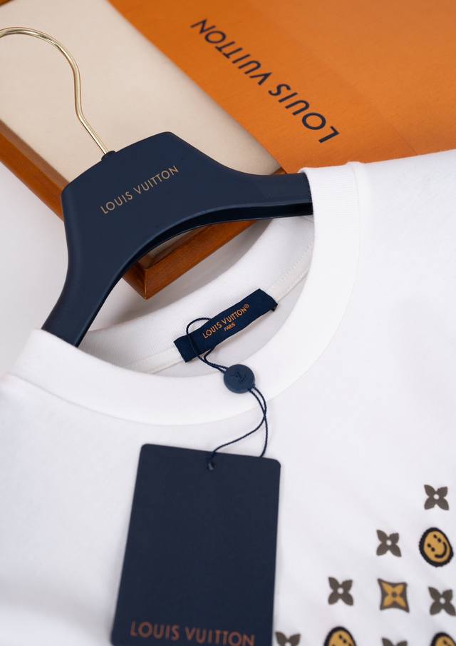 25Ss New Lou-Is Vuitton T-shirt, a limited edition collaboration with Nigo, features a cute, convex smiley face pattern all over the shirt. It's so adorable! The chest and back feature a three-dimensional Monogram print, giving it a delicate, flock-like feel. The loose fit creates a casual, slimming look, making it a trendy and stylish piece for any outfit. It's stylish yet cute, making it an instantly memorable item. (I love it!) - Color: White - Material: 100% Cotton - Sizes: Xs, SM, L - Available in four sizes. Recommended sizes: Xs for those under 140 lbs, S for those 140-155 lbs, M for those 155-170 lbs, and L for those 170-185 lbs. - Includes an envelope and requires a gift box +40.